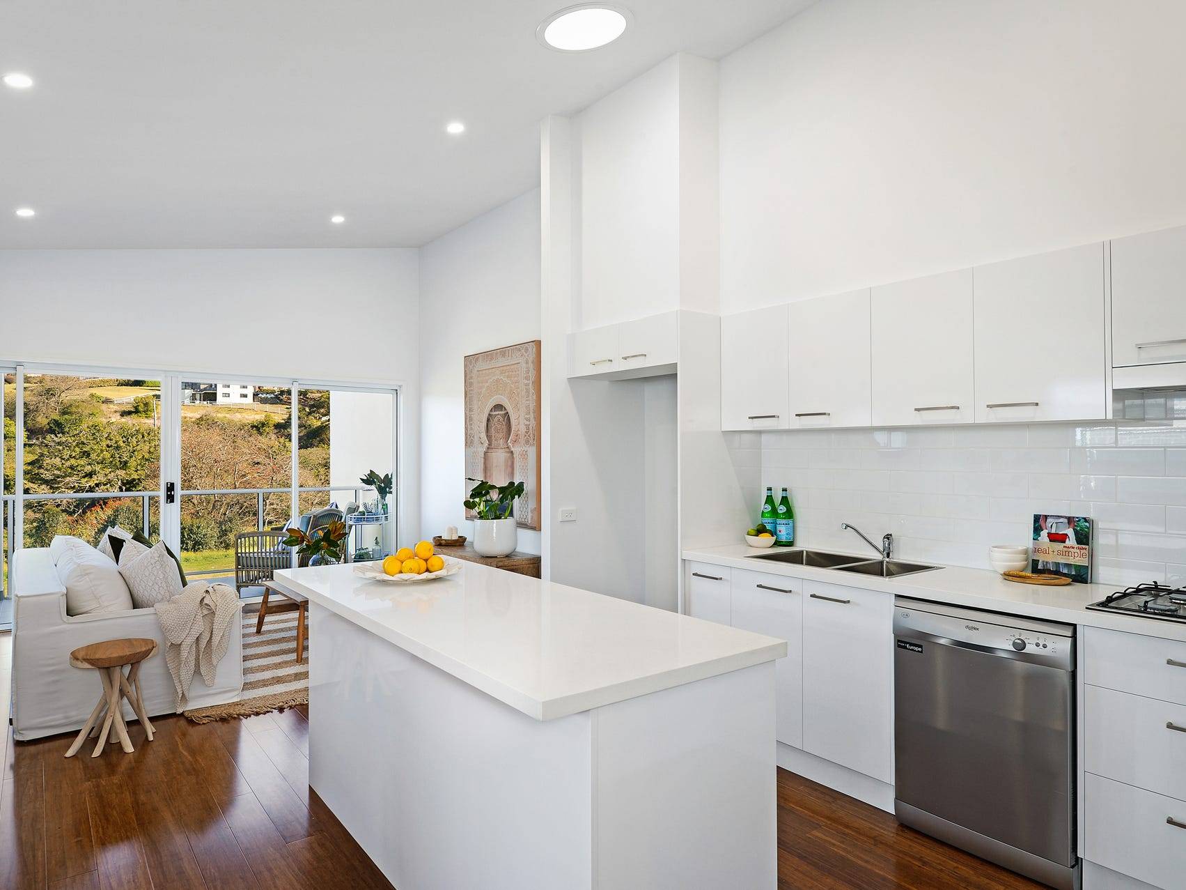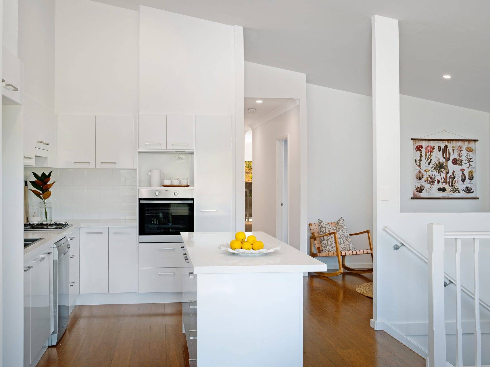 The modern kitchen boasts Caesar Stone bench tops, modern white tile splashbacks and white cabinetry, which creates a fresh chic style. The kitchen is finished with a brand new gas cooktop, oven, dishwasher and modern finishes.