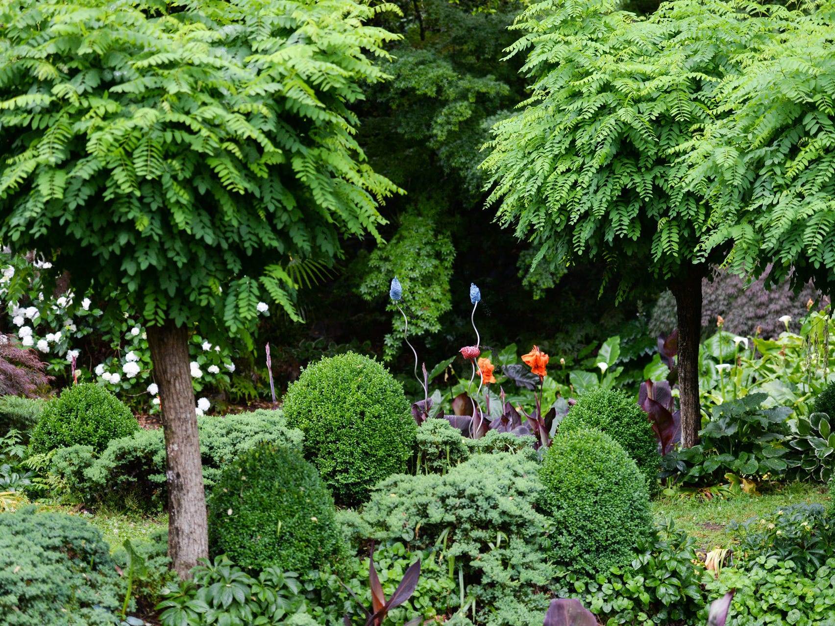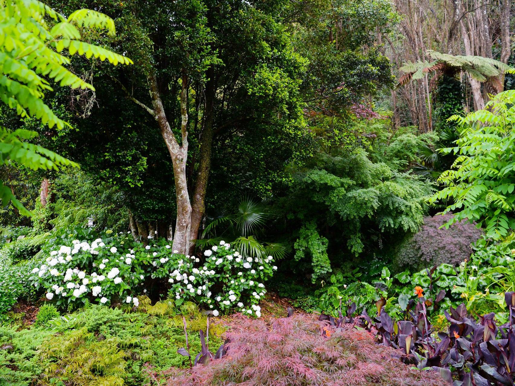 The harmonious assemblage of colours and organic materials, combined with the symphonies of abundant bird life on view in their custom-built bird houses on display in pride of place among brilliant displays of Hydrangeas, add to the idyllic tranquillity.