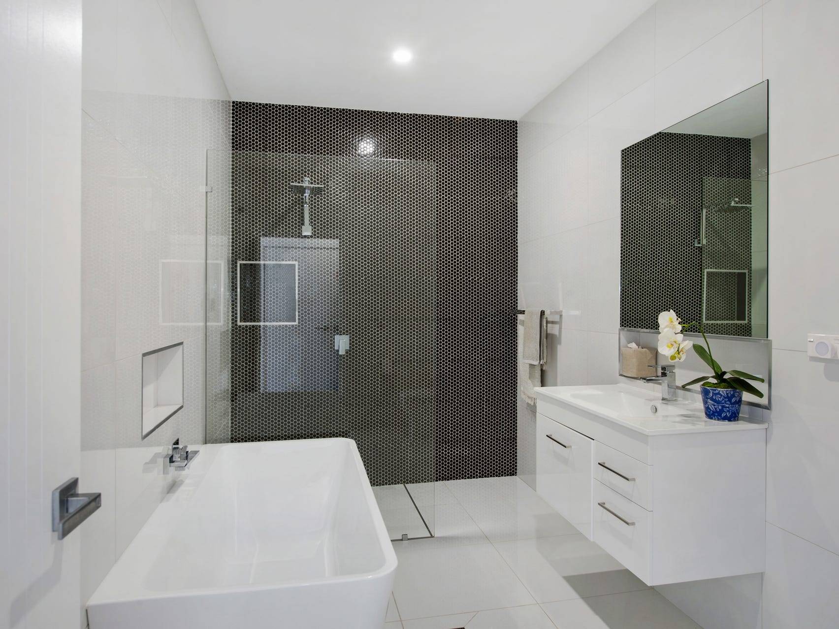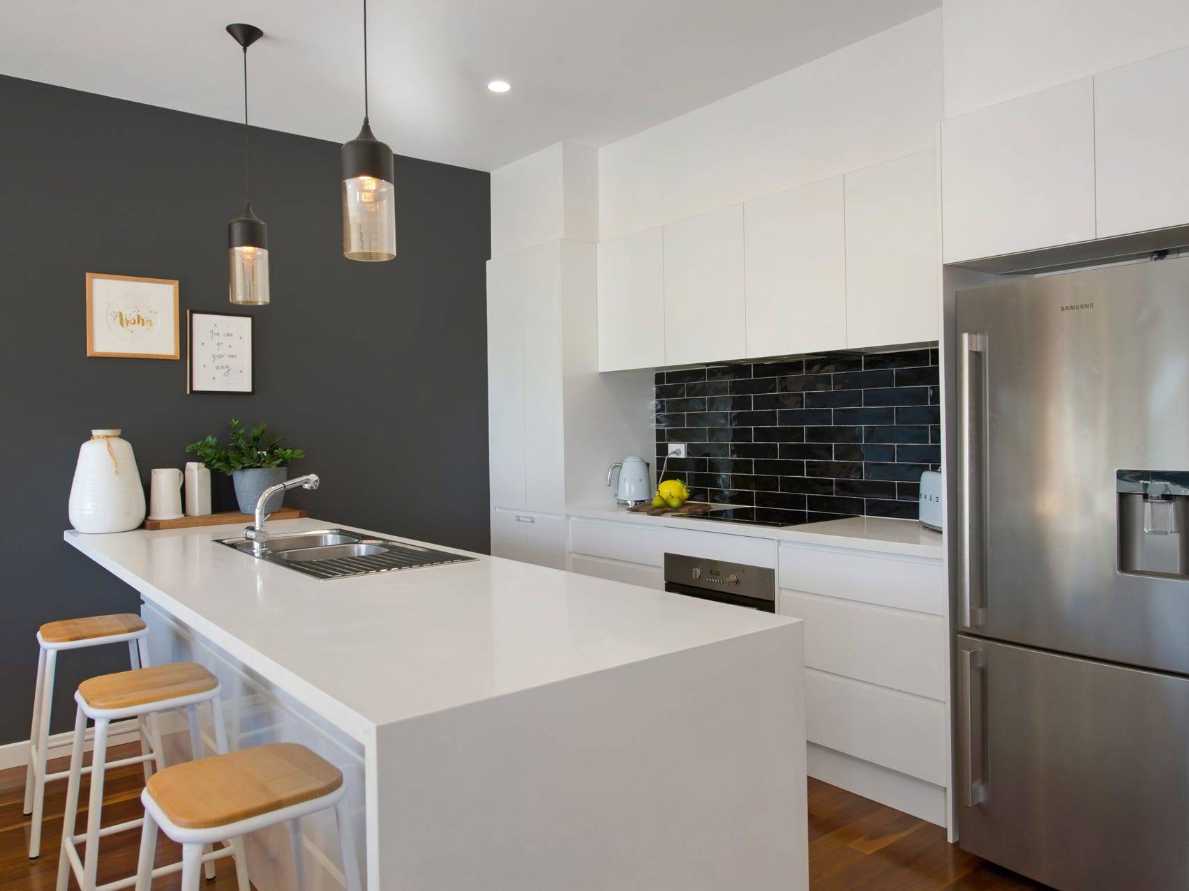Quality hardwood flooring, a contemporary kitchen, 40mm Caesar Stone benches and edgy colour scheme creates an ultra-modern urban appeal. The ideal rear North-facing position showers the townhouse in natural light and captures Kiama's refreshing ocean breeze.