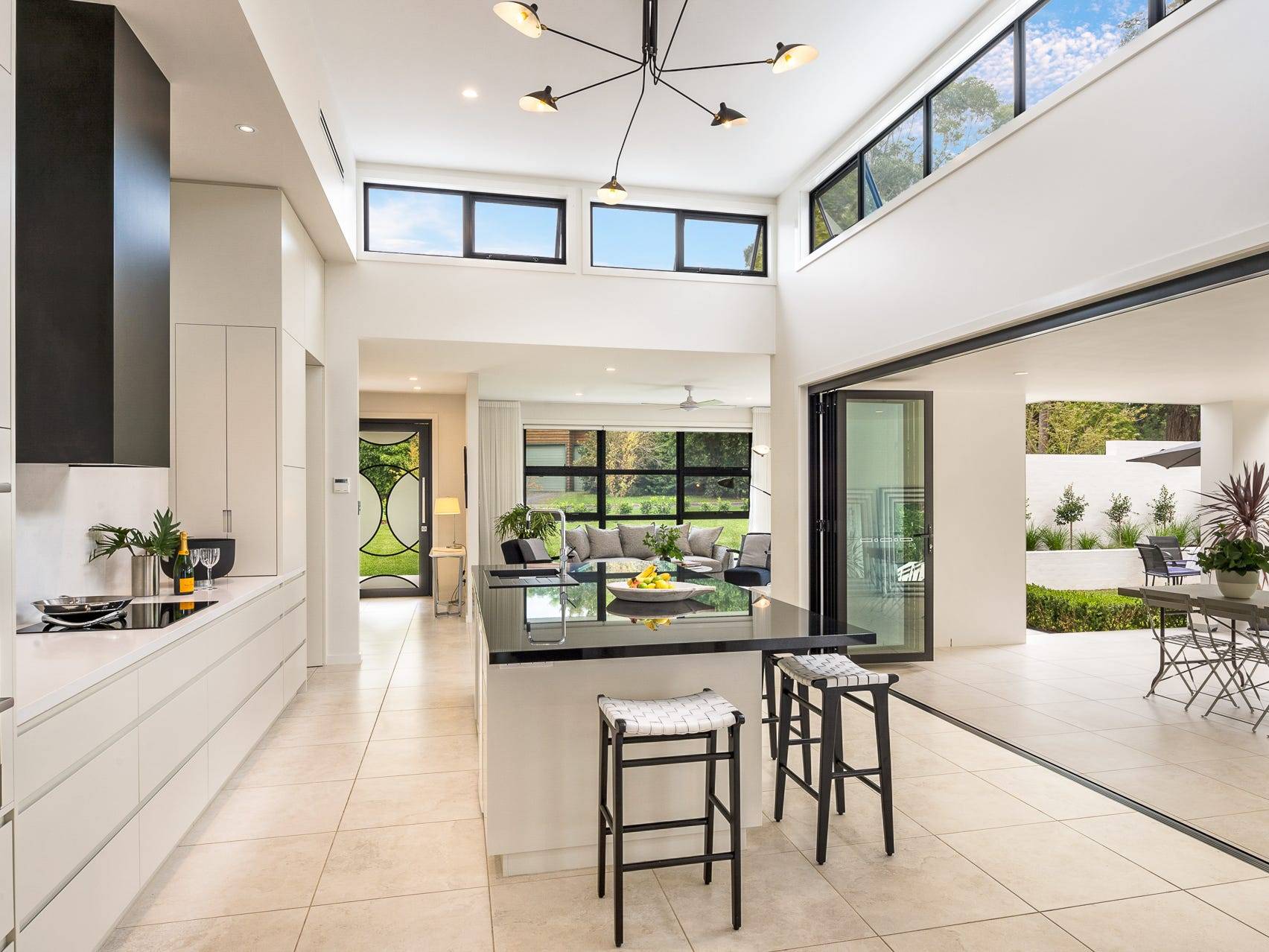 Soaring 14ft ceilings with stunning French art deco lighting and an entire wall of sliding glass bi-fold doors off the kitchen open up to the landscaped gardens and large sun drenched open entertaining area of the home.