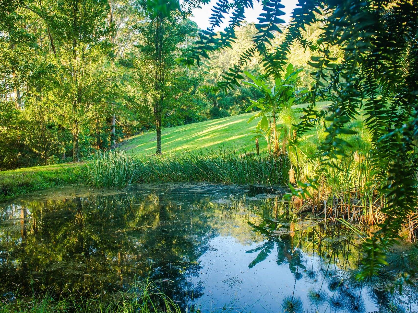 From the bench by the dam you can watch the changing colours of the forest and escarpment at the end of the day to an orchestra of frogs. The dam is fed by a water feature which uses the overflow from the tanks which supply water to the house. There are two water sources utilising water from the mountain which is filtered at the house.