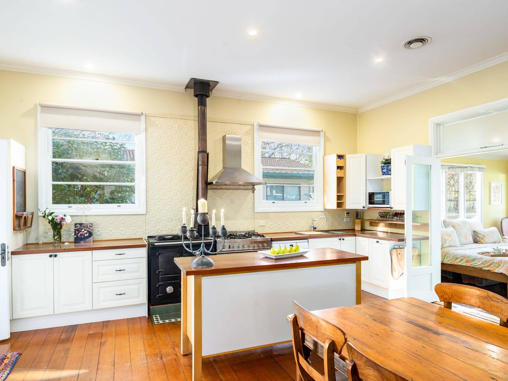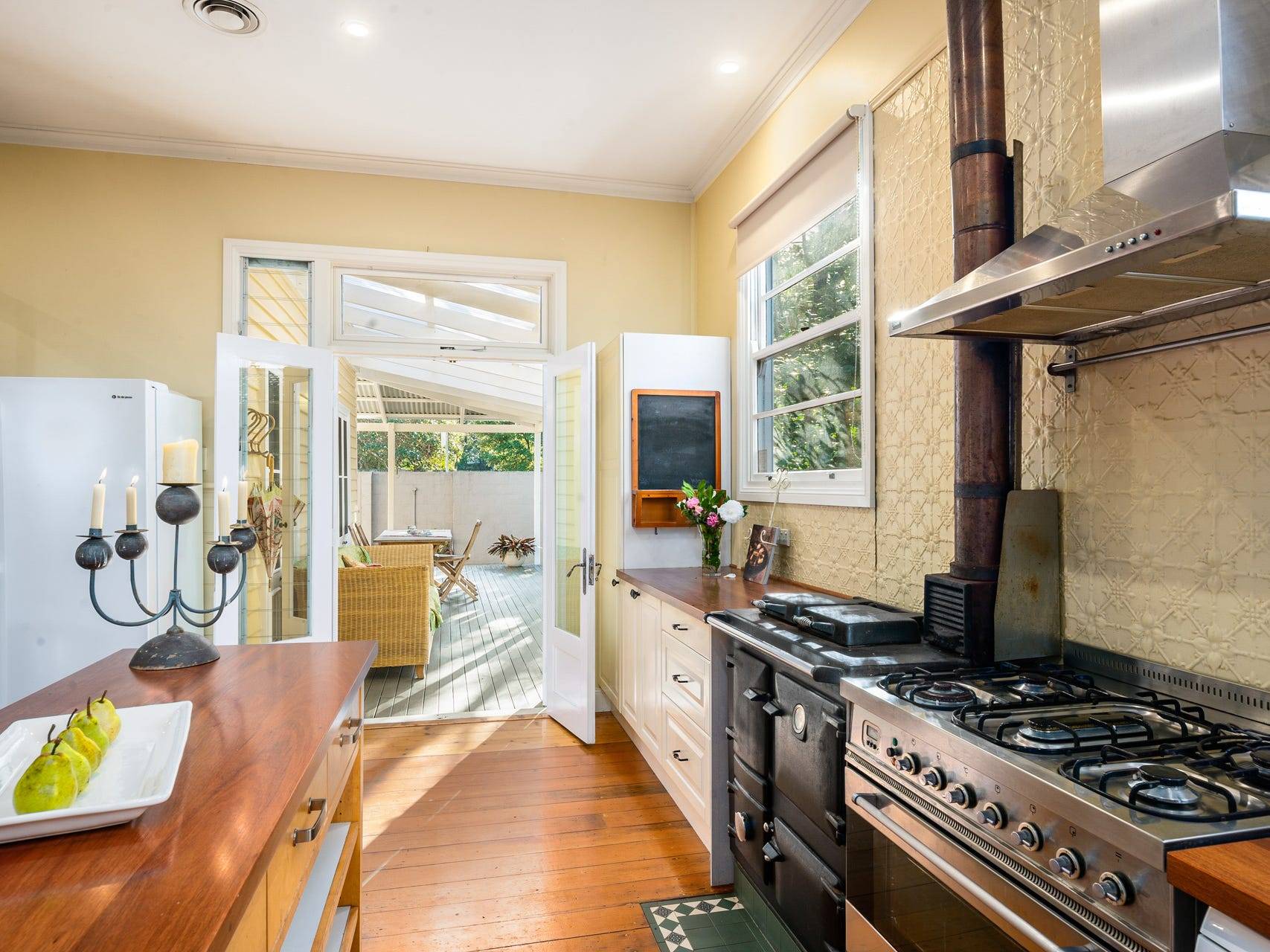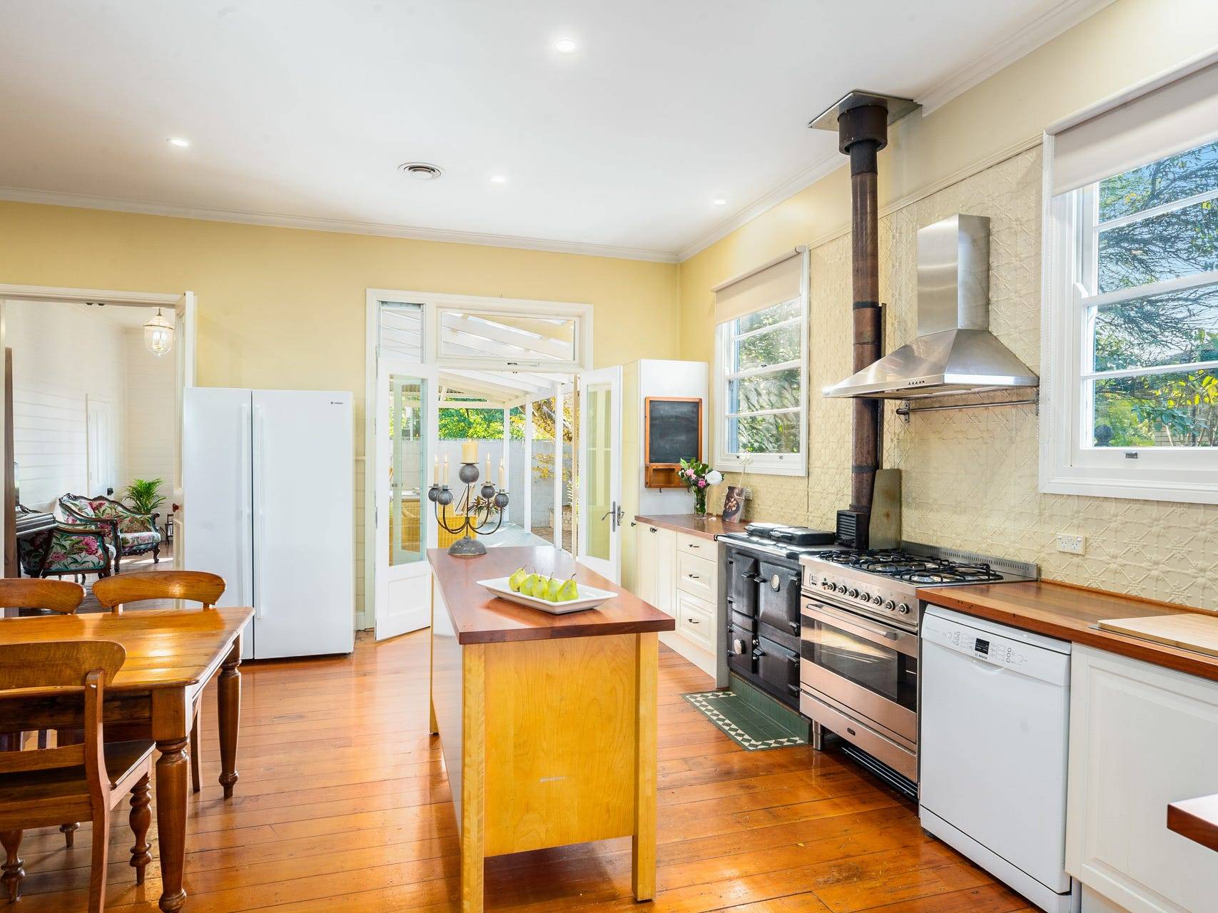Sawmill Cottage enchants visitors with its large, light-filled rooms, high ceilings, and original detailing. At the heart of the home, a grand open plan kitchen presents with high quality appliances, authentic pressed tin wall panels, and tactile hardwood timber bench tops. It's the kind of room where family and friends come together to share food and friendship; a place to create a lifetime of memories. A featured Rayburn wood burning stove warms the kitchen whilst a wholesome soup is cooking or a batch cookies.
