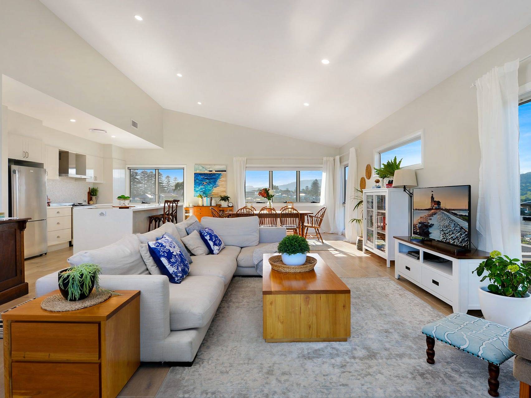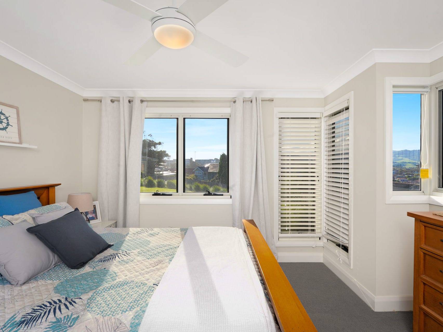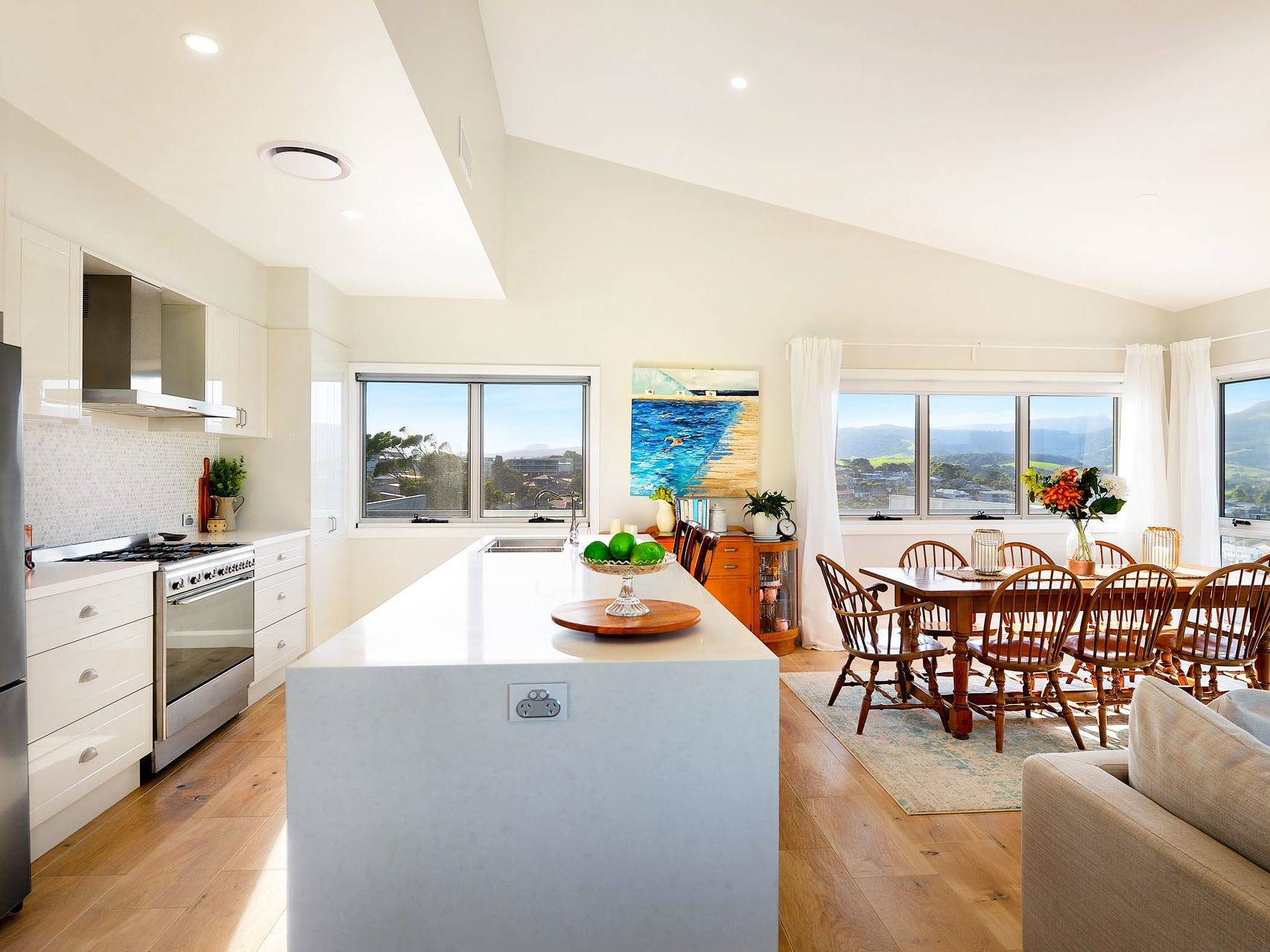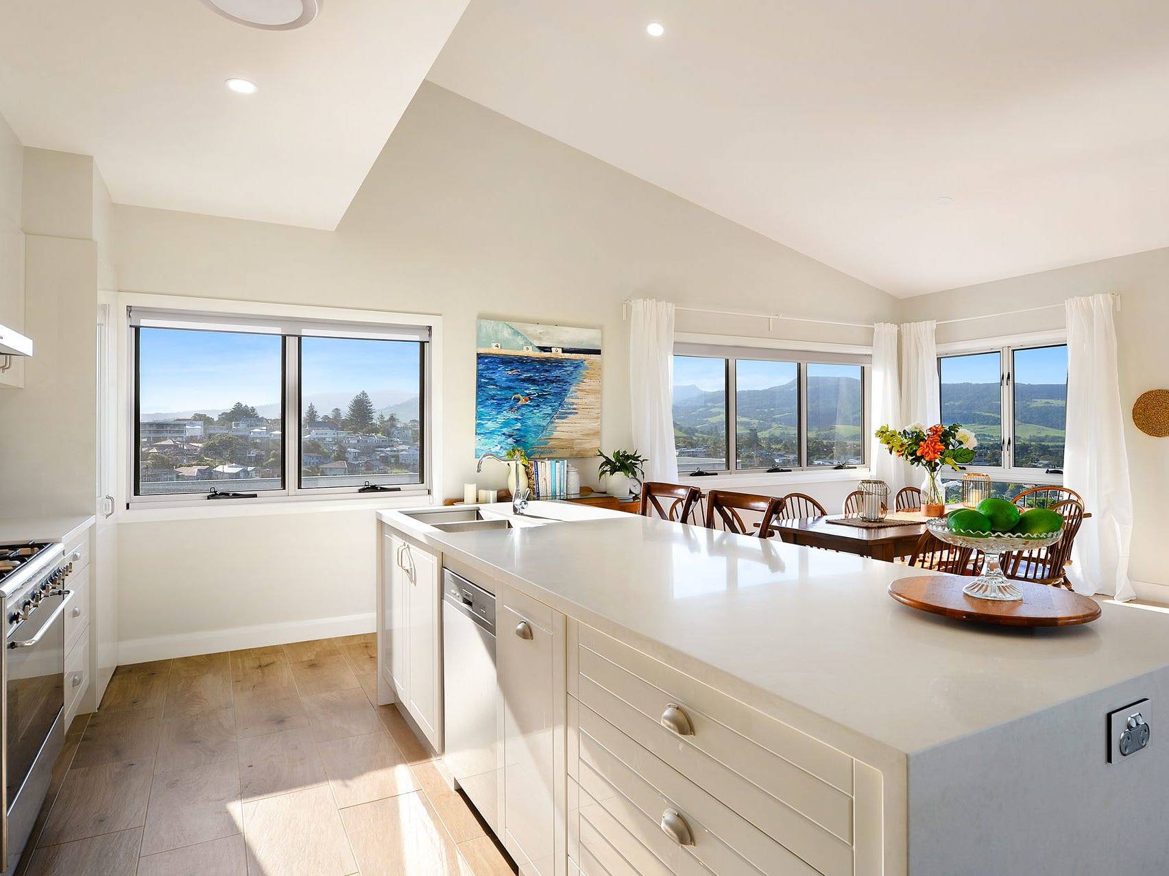 Upstairs you will find the centrepiece of the home, the spacious and light filled open plan living, kitchen and dining area, with double height ceilings and stunning views. The kitchen beckons the home chef with extra tall bench tops, 40mm ceasar stone bench tops, quality Smeg appliances, marble mosaic tile splashback and ample storage. A sunny deck adjoining the lounge room offers the perfect spot to watch the sun rise over Werri Beach while you enjoy your morning coffee and breakfast.