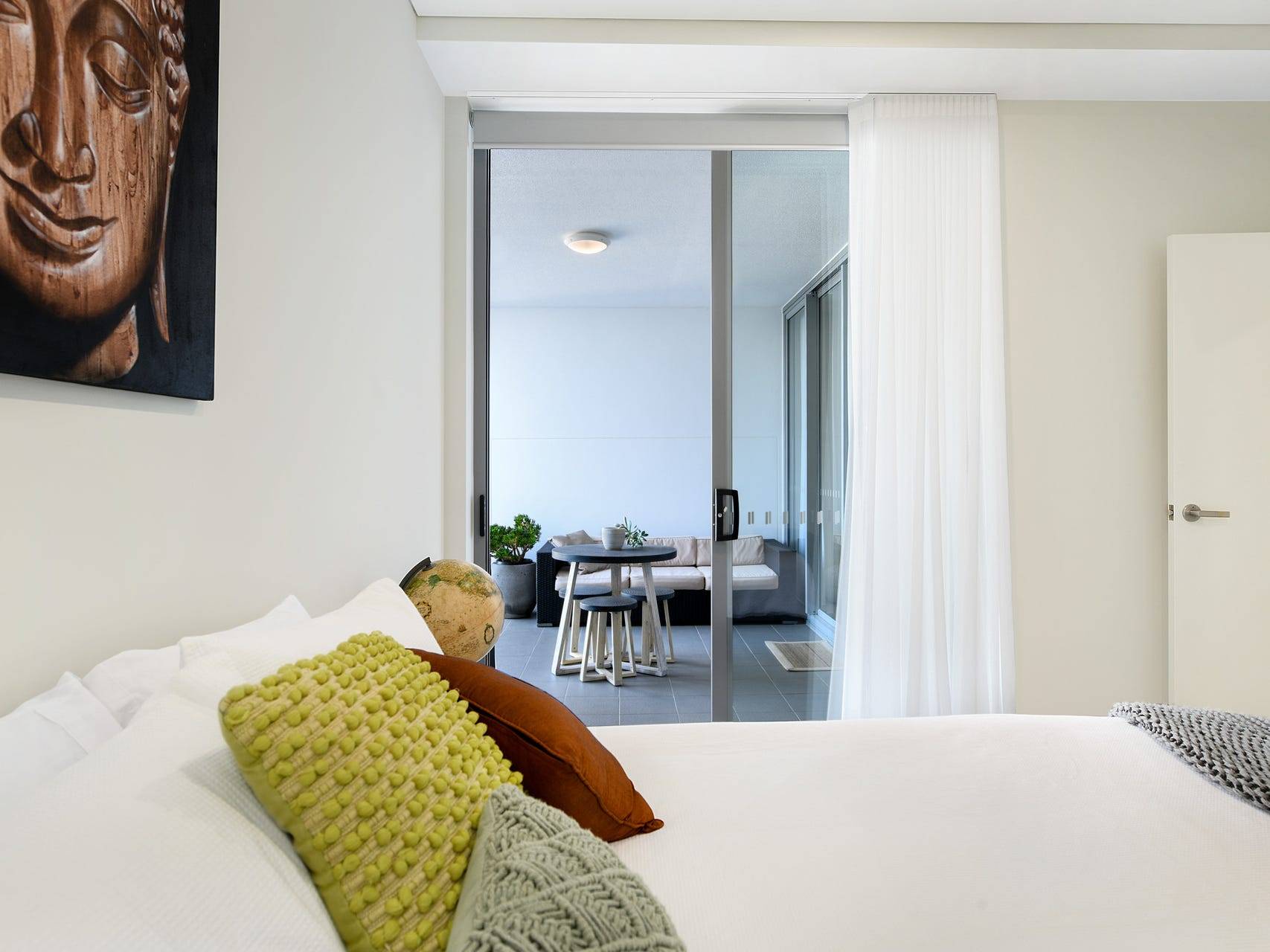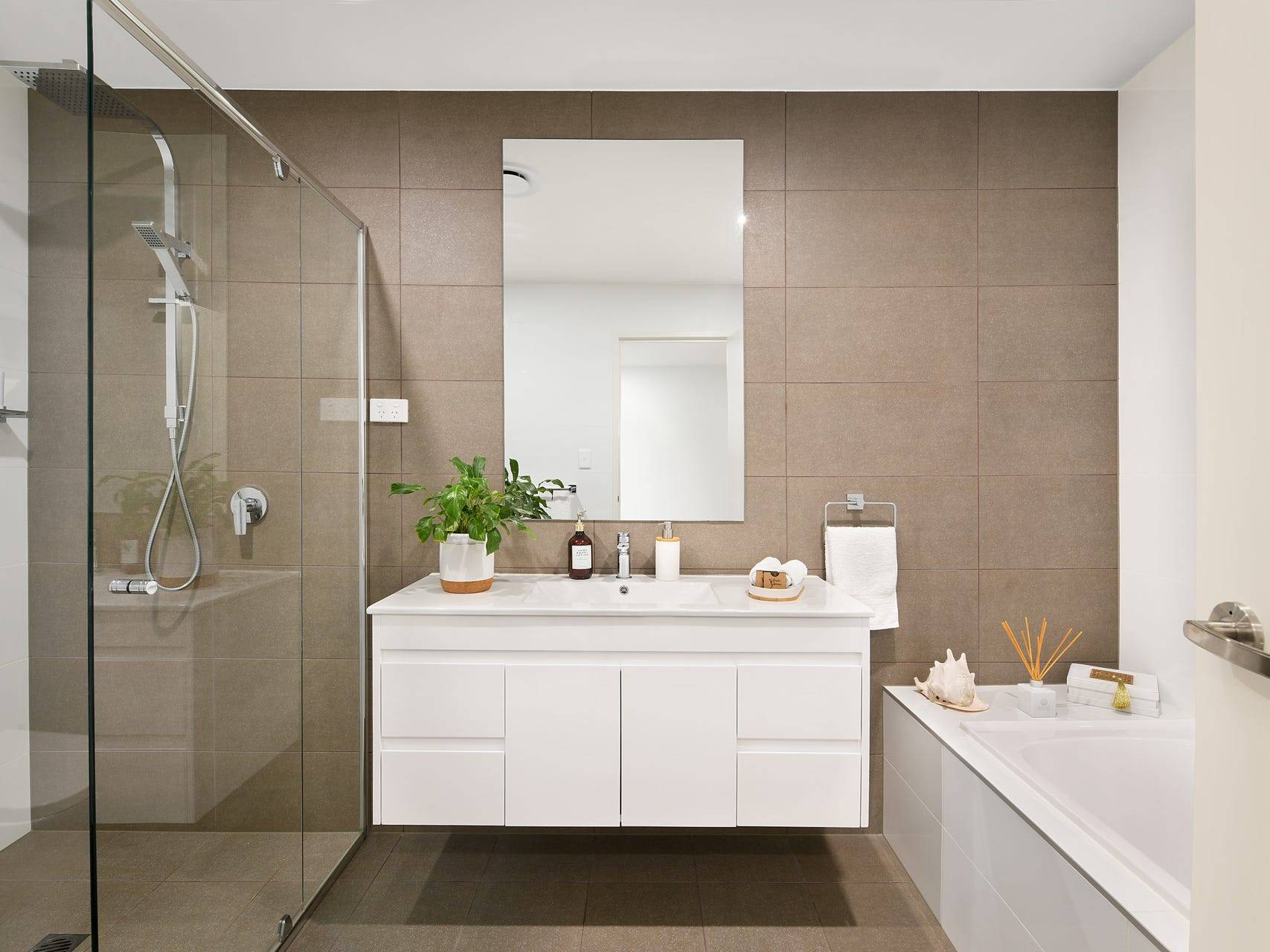 Features include gas to the kitchen, marble benchtops, and mirrored backsplash. High-end appliances in the unit include a Smeg oven and dishwasher, Fisher & Paykel dryer, and washer. Carpeted throughout the bedrooms and lounging areas for softer living, with the balconies tiled and sheltered for all-weather and comfort along with ducted- airconditioning. Beautiful earthy coloured large granite tiles feature in the bathrooms which are offset with white accessories, a tub, and a generous rain shower cubicle. The minimalist design and features allow for excellent interior components.