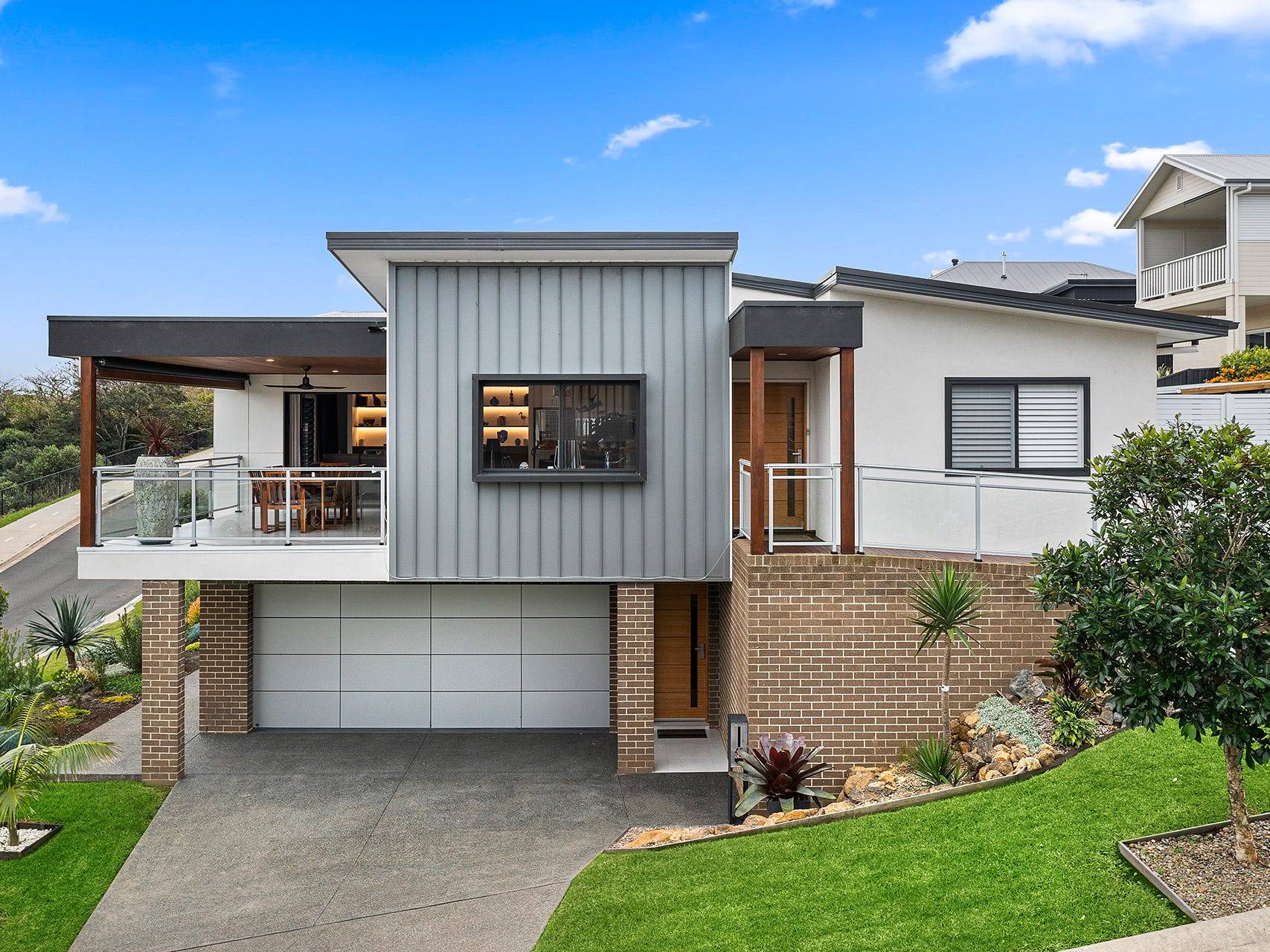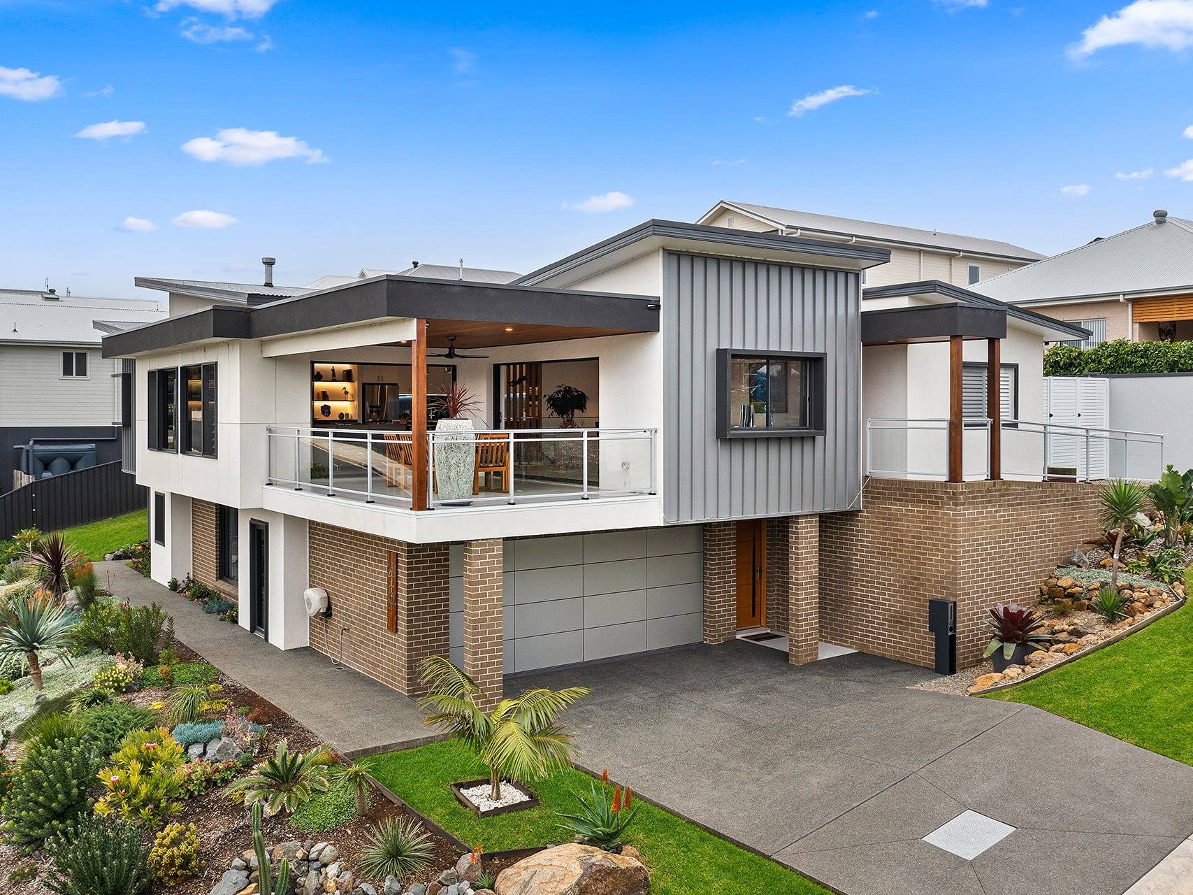 Sitting high on a corner block with a striking mix of brick and Colourbond cladding, this modern residence showcases native and exotic landscaping, making full use of the slope to cleverly provide accessible access to both levels. A large double garage occupies much of the lower level, while the main entrance invites you up the timber staircase to emerge in the centre of the vast open plan living area.