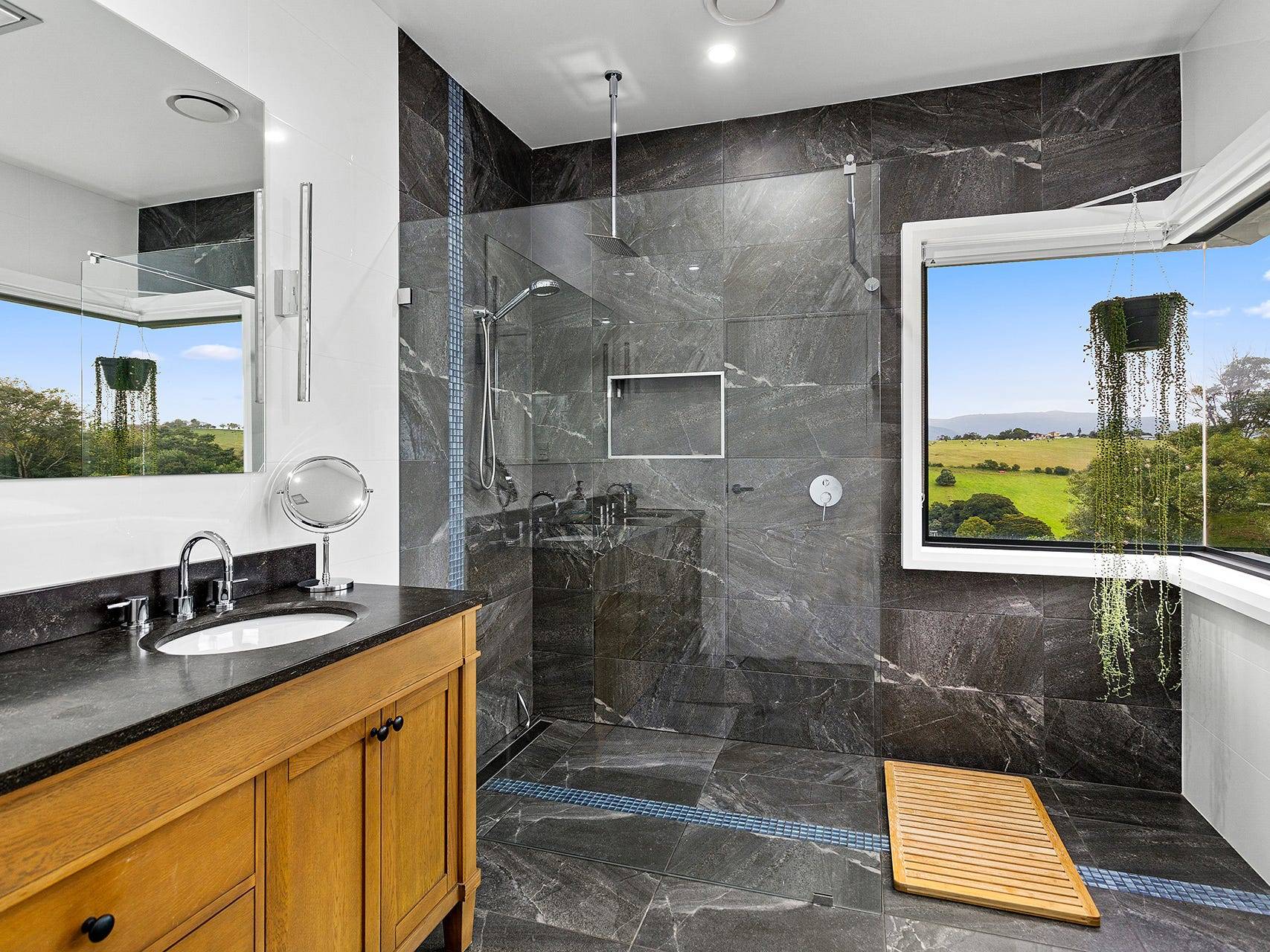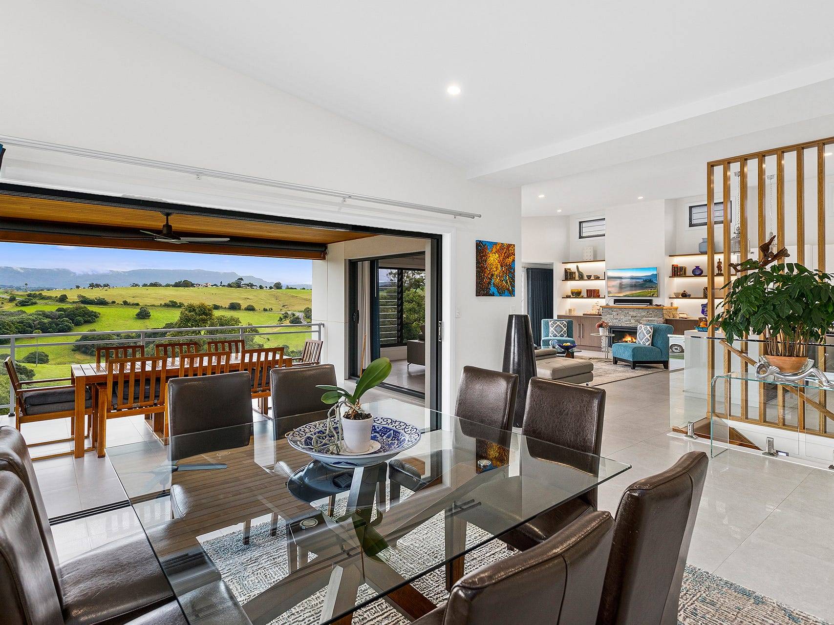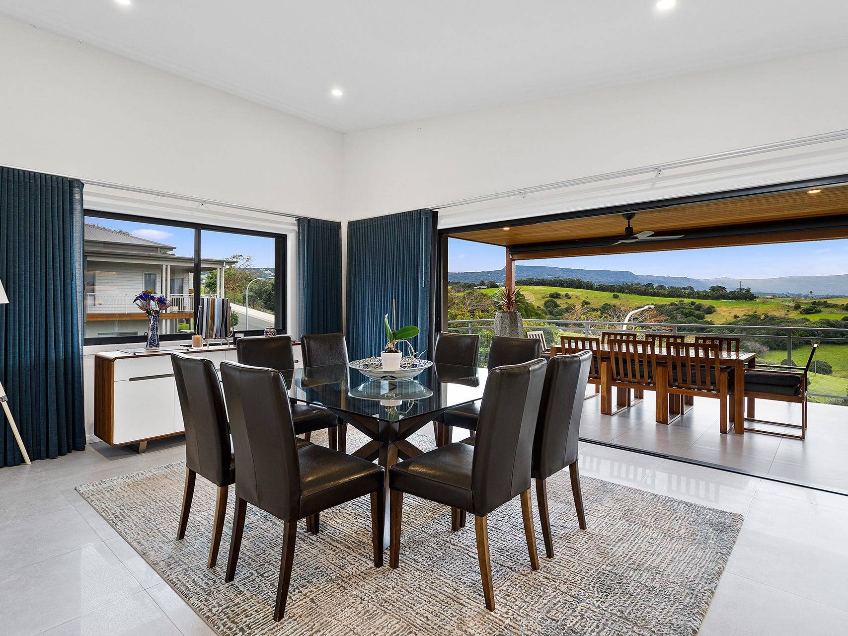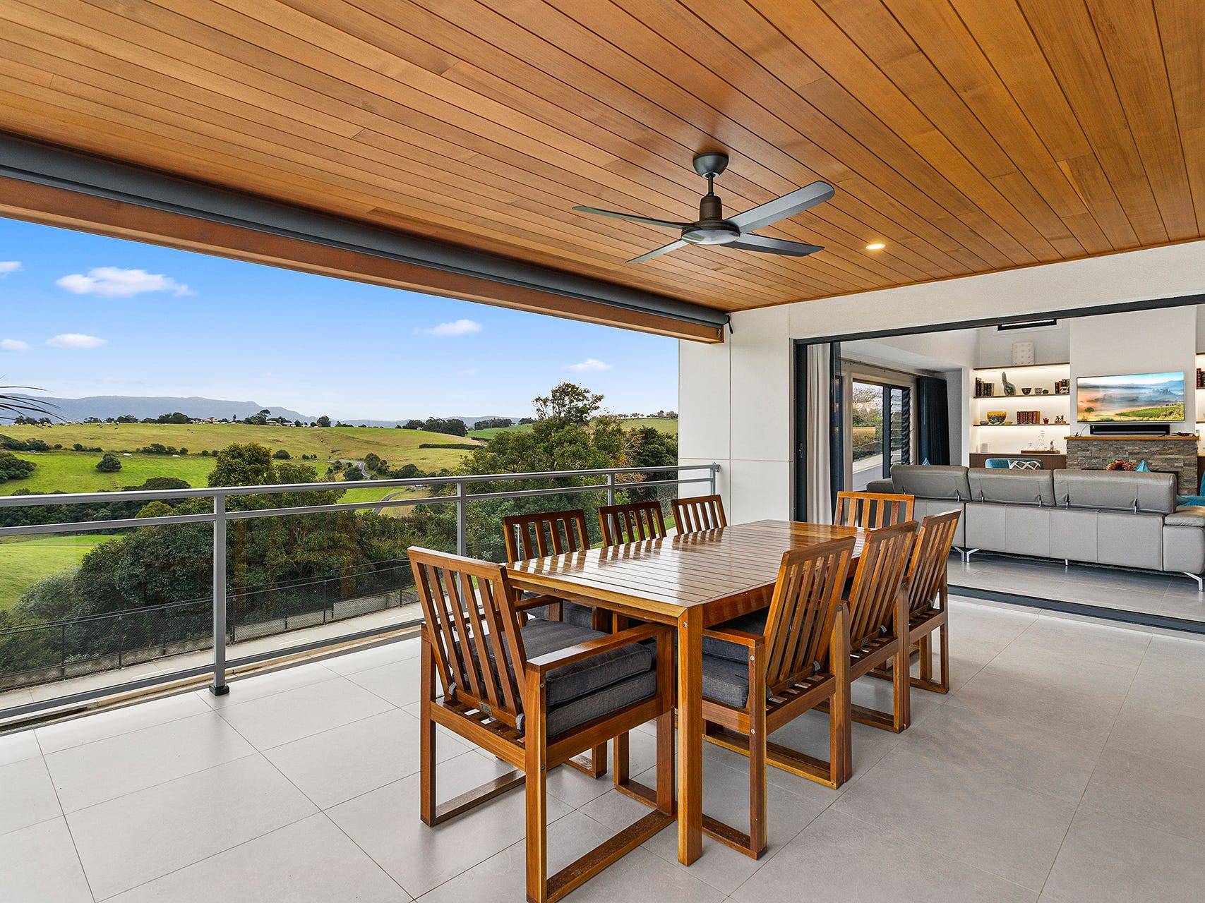 You've arrived – the absolute heart of this home, with large porcelain tiles underfoot and a soaring butterfly raked ceiling above, rising to great heights in each direction. The dining area and lounge both step effortlessly out to a covered entertaining area via stacker doors. Here, under the gentle breeze of the ceiling fan, you'll enjoy uninterrupted views towards Jamberoo and the mountains – the ultimate afternoon and sunset spot to relax or entertain.