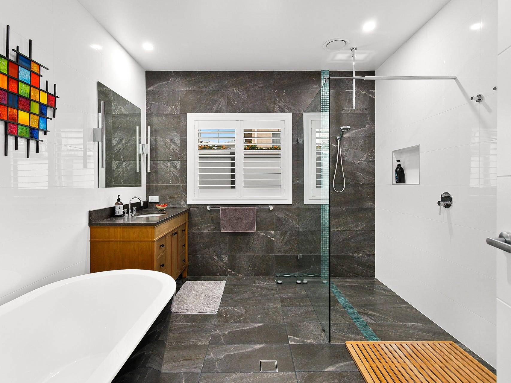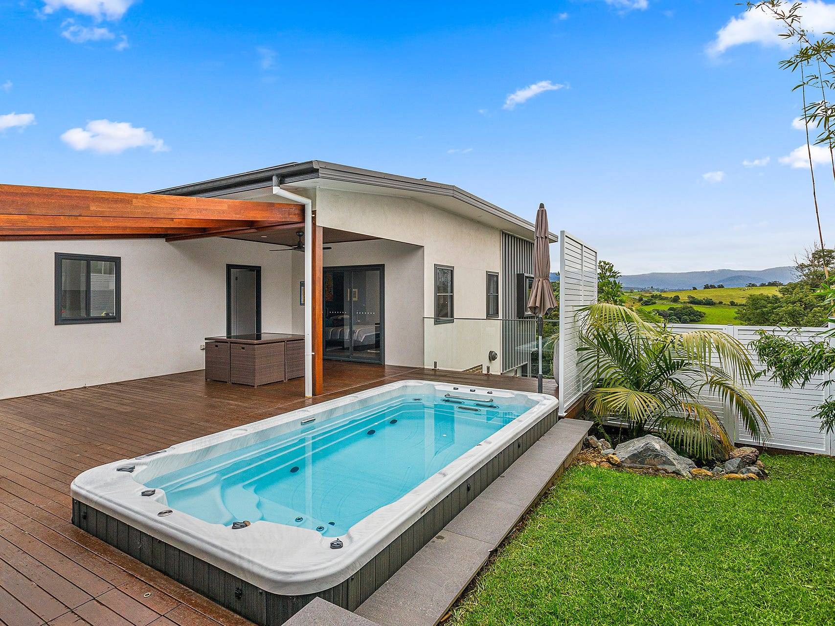 Two bedrooms, a main bathroom (with gorgeous freestanding black tub) and spacious laundry all feature on the way out to your private, bamboo-fringed Merbau deck and garden – ideal for catching all-day sun. An impressive swim spa and awning add to resort-style feel of this space, directly accessed from the master bedroom, which also includes walk-in wardrobe and luxe ensuite with oversized rain shower.