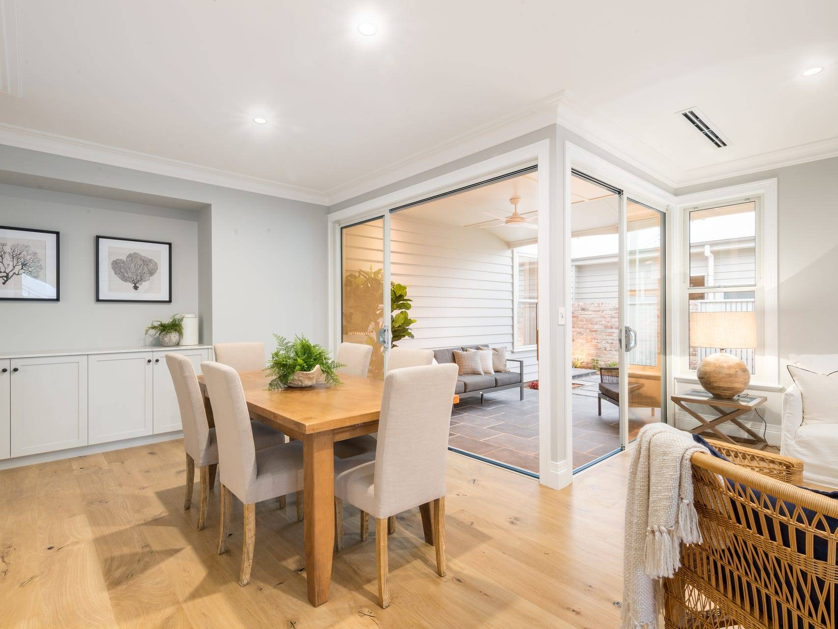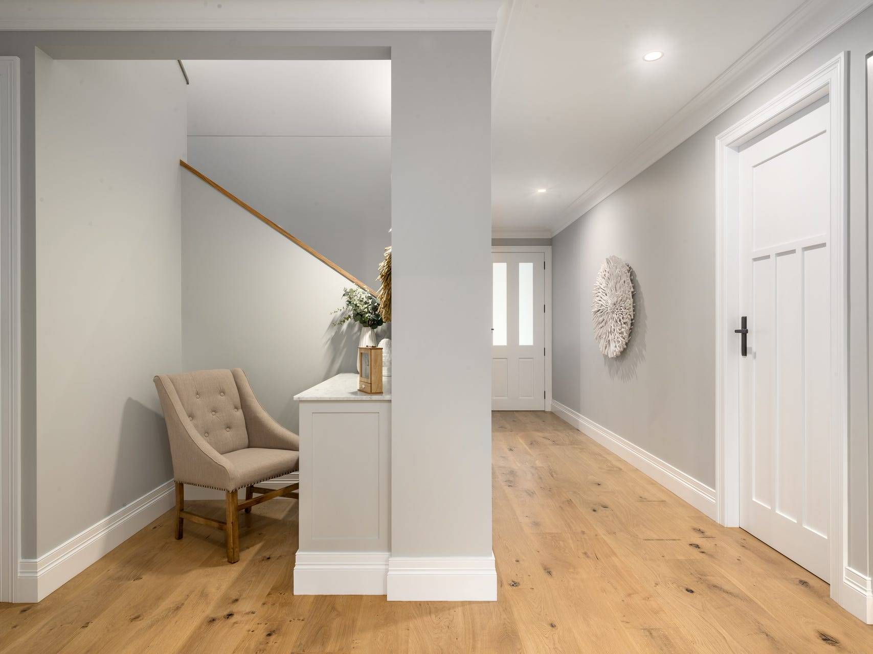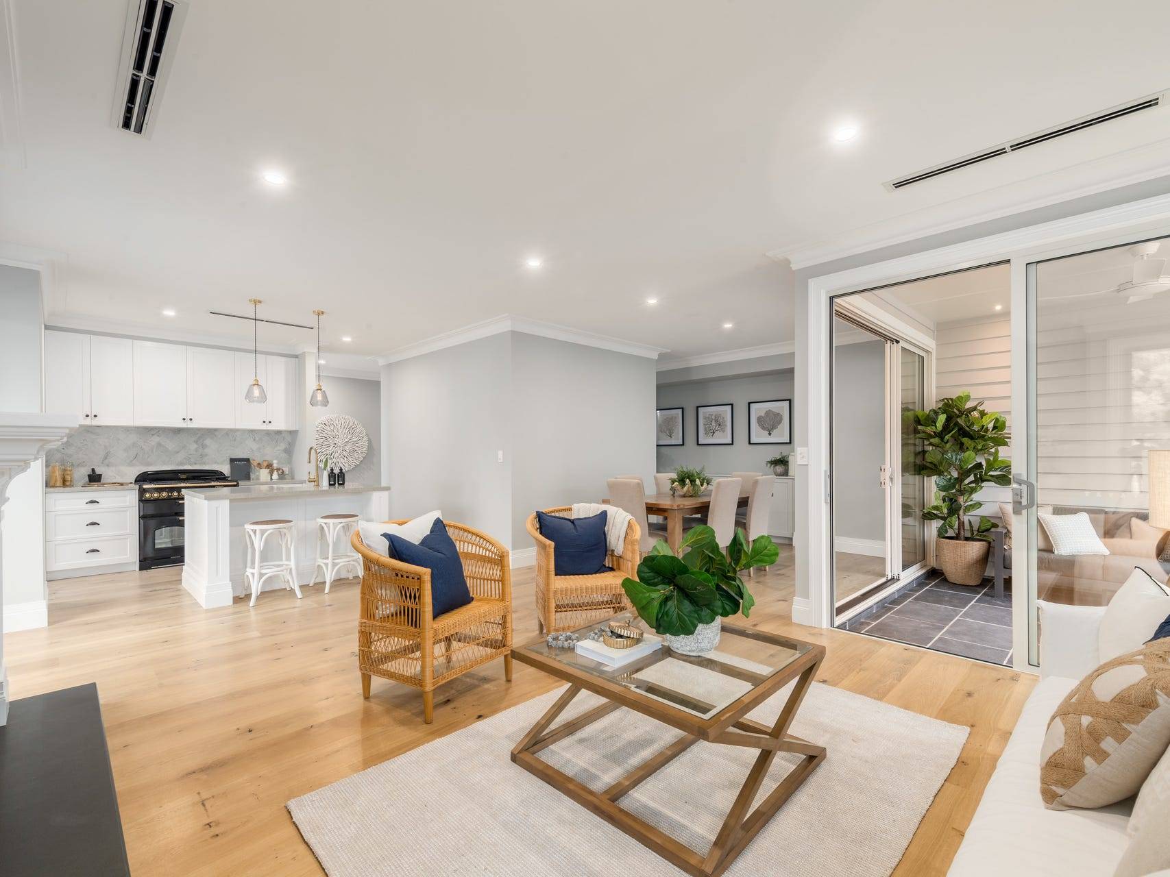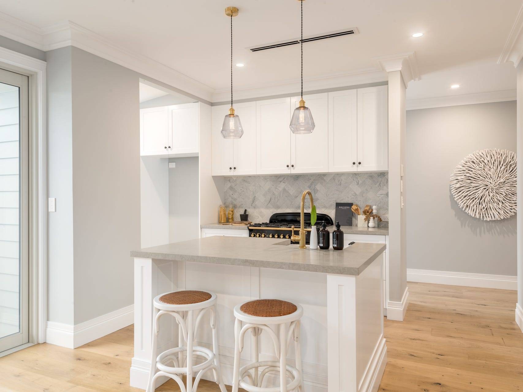 Each home offers an incredibly smart and seamless floorplan, designed to maximise indoor and outdoor living with minimum fuss. An oversized double garage welcomes you home, as you step through to solid European Oak floors throughout the open plan living, dining, and kitchen. It's clear that every detail has been thought of here – from the feature European light fittings, soaring high ceilings, and the all-year comfort of the open gas fireplace and ducted air-conditioning. The gourmet Hamptons-inspired kitchen is bathed in gorgeous natural light, showcasing stone benchtops and breakfast bar, Falcon stove, and custom cabinetry. A delicious combination.
