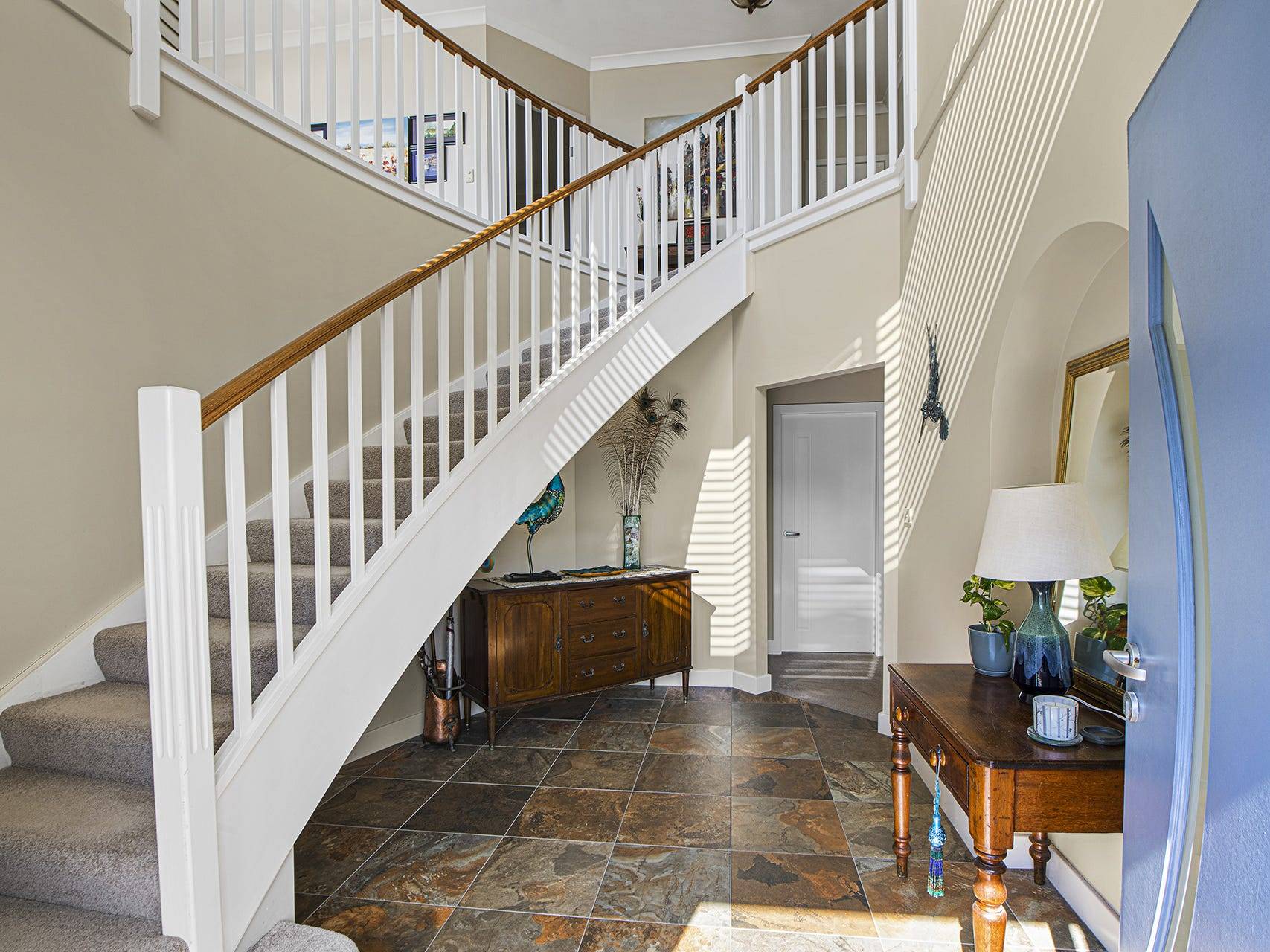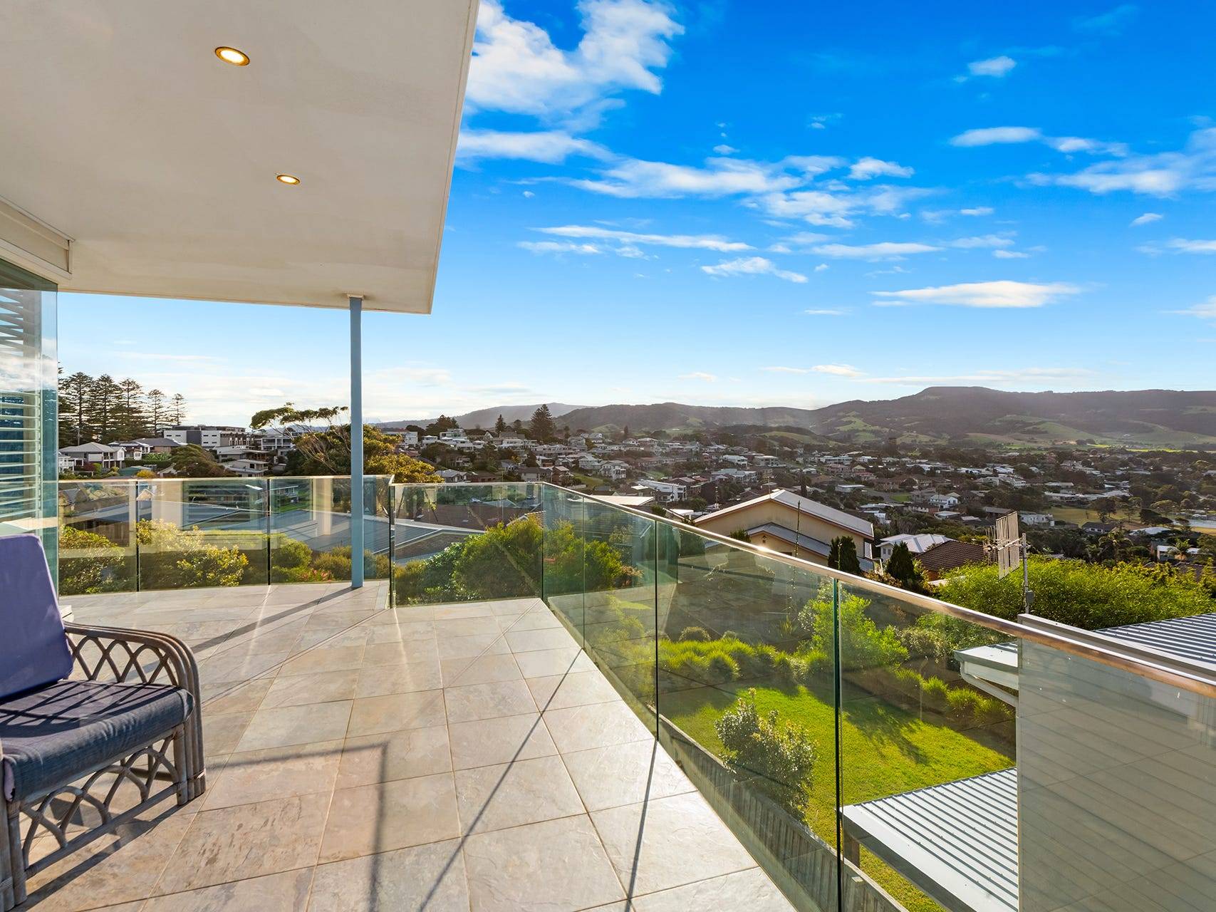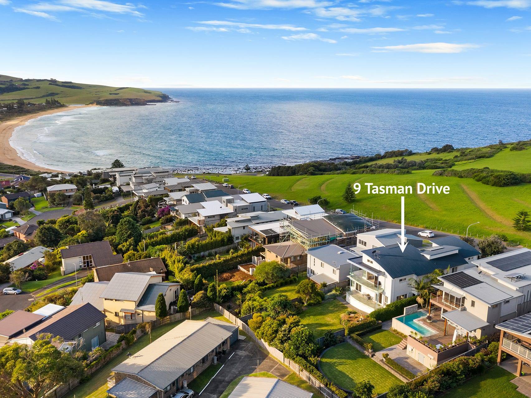 Welcome to 9 Tasman – a stunning 2011 master-built family home featuring four bedrooms, three bathrooms, & views for days. From the moment you arrive, it's clear this home has been designed with the location in mind – its curved lines & blue/white tones mirroring the waves of the popular surf break below.