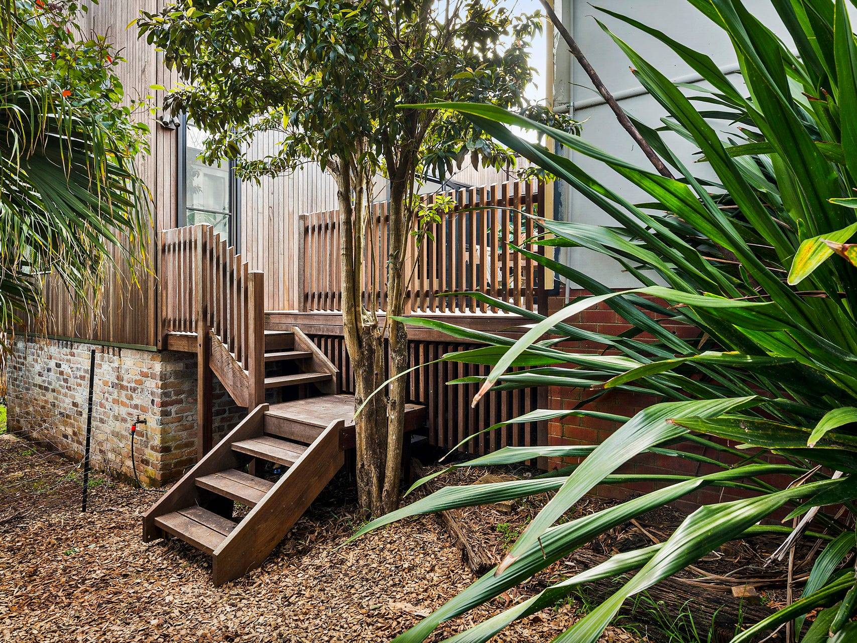 If you love cooking or entertaining, the 900mm SMEG oven, gas cooking, integrated dishwasher, Japanese tiles and quality fixtures will make preparing everything from a bite to a banquet a real pleasure. The kitchen is the centrepiece of this new addition – overlooking the soaring 4m-high living space, complete with side sconce lighting, timber fire place and giant arched window framing the mulberry tree beyond. It's here that you can also step out to an enclosed outdoor deck – flanked by the spotted gum cladding and Aneete sashless windows.