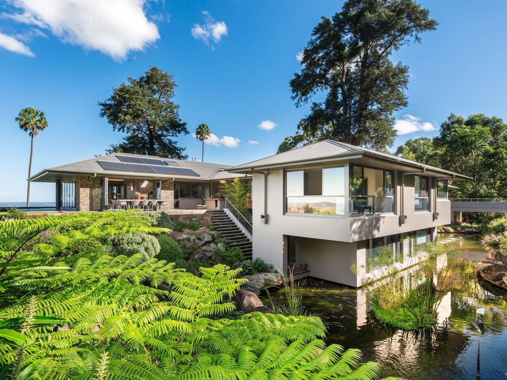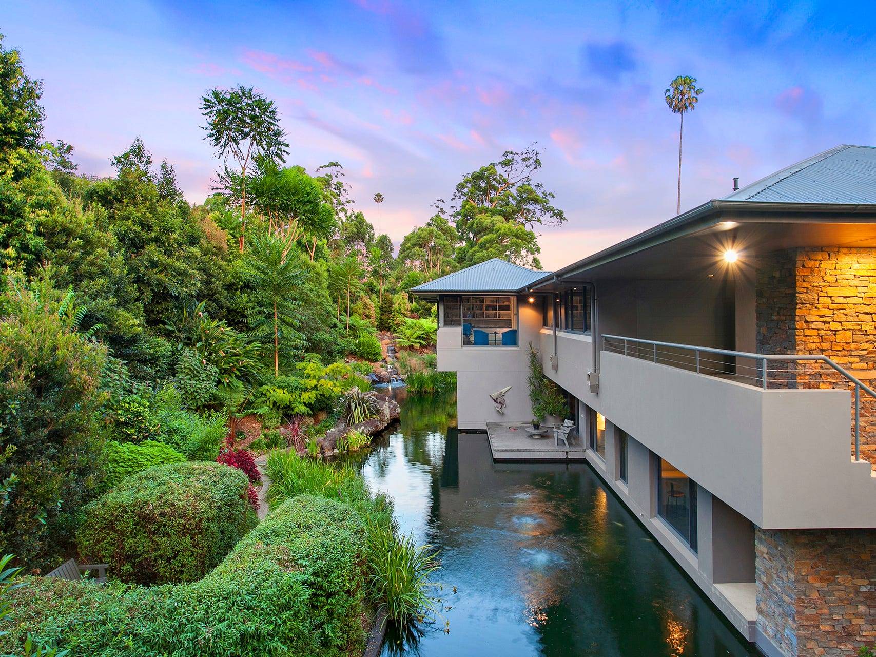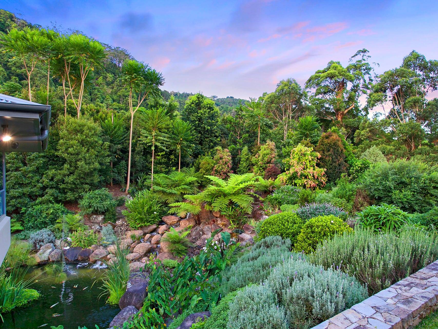 Influenced by a visit to the Guggenheim Museum, this stunning home appears to float upon a vast Koi pond viewed from all the luxuriously appointed bedrooms each with ensuites. Light filled lounge rooms featuring bi-folds that open to garden on all sides creating a seamless indoor to outdoor flow. Stroll onto your private pontoon hovering above the pond, and relax in the Zen like tranquility of dancing water reflections, all nestled in a rainforest garden. A backdrop of rainforest escarpment to the west offers protection and natural beauty, an ecosystem of intricate flora and fauna, waterfalls, and an awe inspiring gorge that provides fresh spring water to the property.