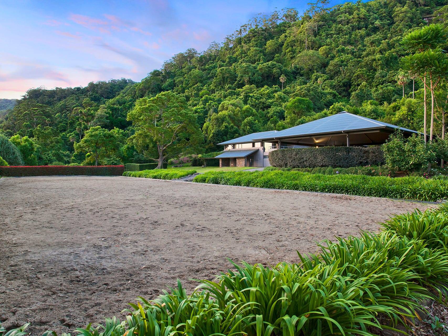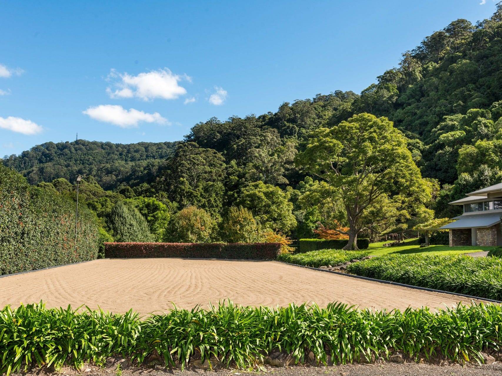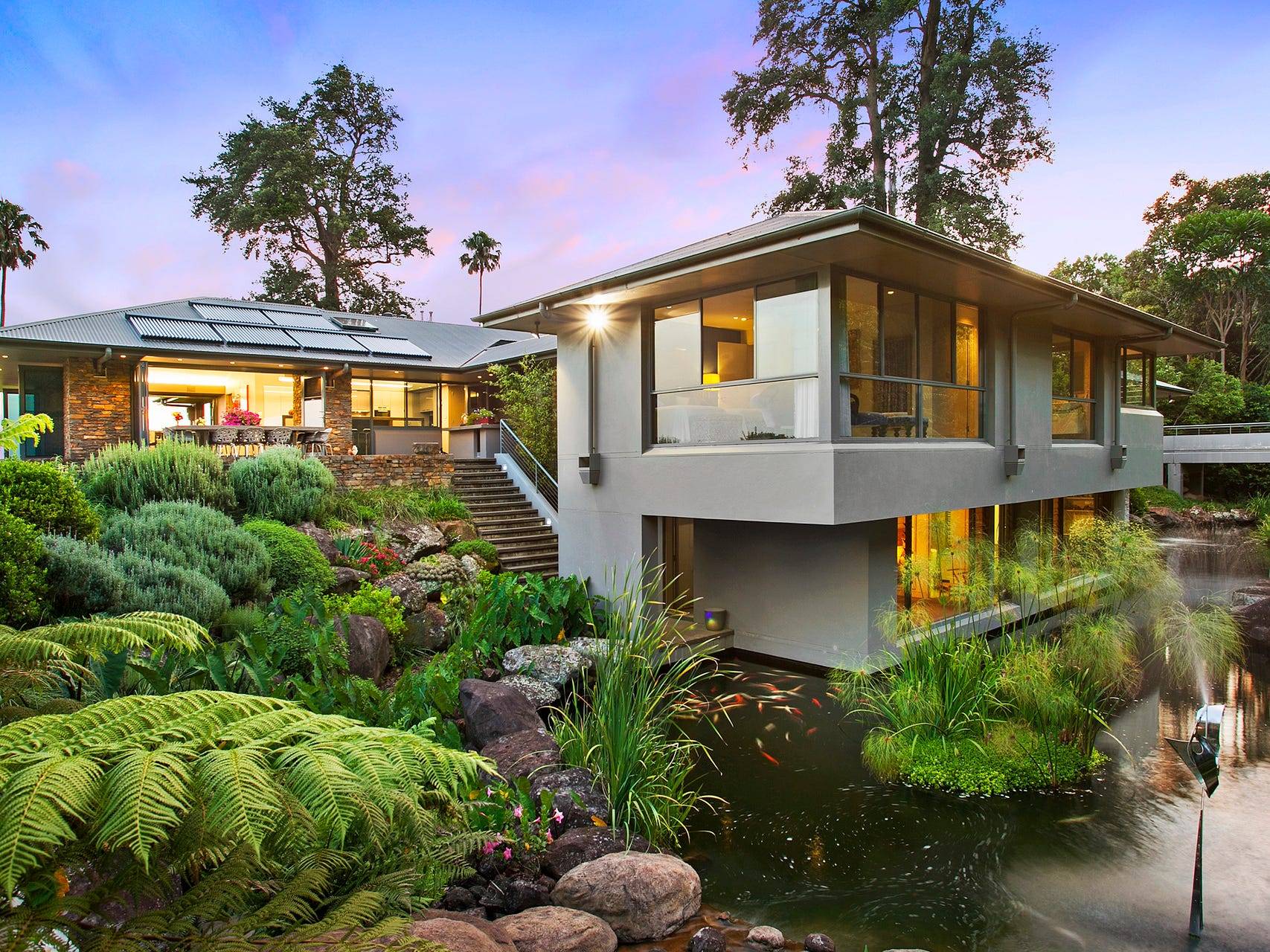 Influenced by a visit to the Guggenheim Museum, this stunning home appears to float upon a vast Koi pond viewed from all the luxuriously appointed bedrooms each with ensuites. Light filled lounge rooms featuring bi-folds that open to garden on all sides creating a seamless indoor to outdoor flow. Stroll onto your private pontoon hovering above the pond, and relax in the Zen like tranquility of dancing water reflections, all nestled in a rainforest garden. A backdrop of rainforest escarpment to the west offers protection and natural beauty, an ecosystem of intricate flora and fauna, waterfalls, and an awe inspiring gorge that provides fresh spring water to the property.