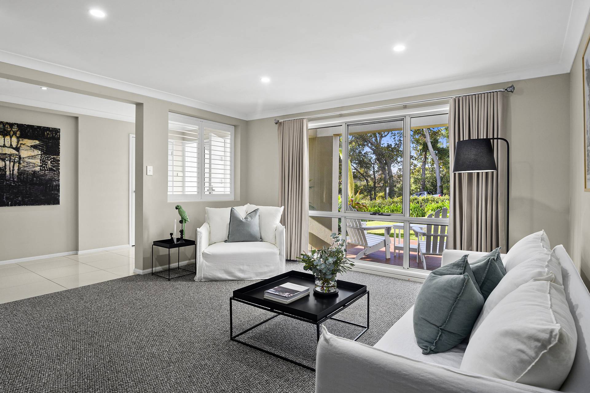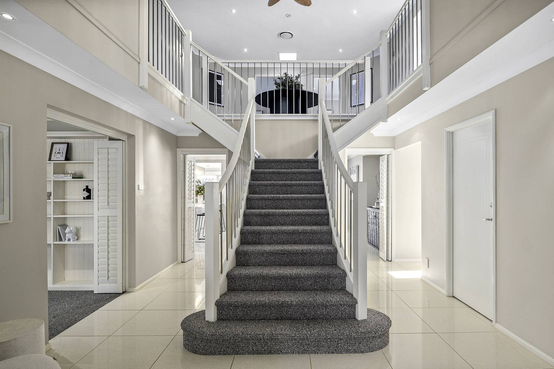 Stepping into this impressive two-storey residence, you are greeted by an entrance hall that sets the tone for a ‘wow’ lifestyle experience - a statement staircase rising dramatically into a central atrium, the light-filled heart of the home and a space that is both visually striking as well as practical. A generous floorplan makes for an effortless flow throughout, starting with the formal reception rooms to the left of the foyer, consisting of a spacious and light-filled living room and an adjoining sitting room/study featuring custom joinery. Exuding a sense of calm and sophistication, thanks to ample natural light and a colour palette of understated, warm neutrals featured throughout, the overall effect is one of tranquil elegance.  Access to the triple-car garage is on the opposite side of the foyer.