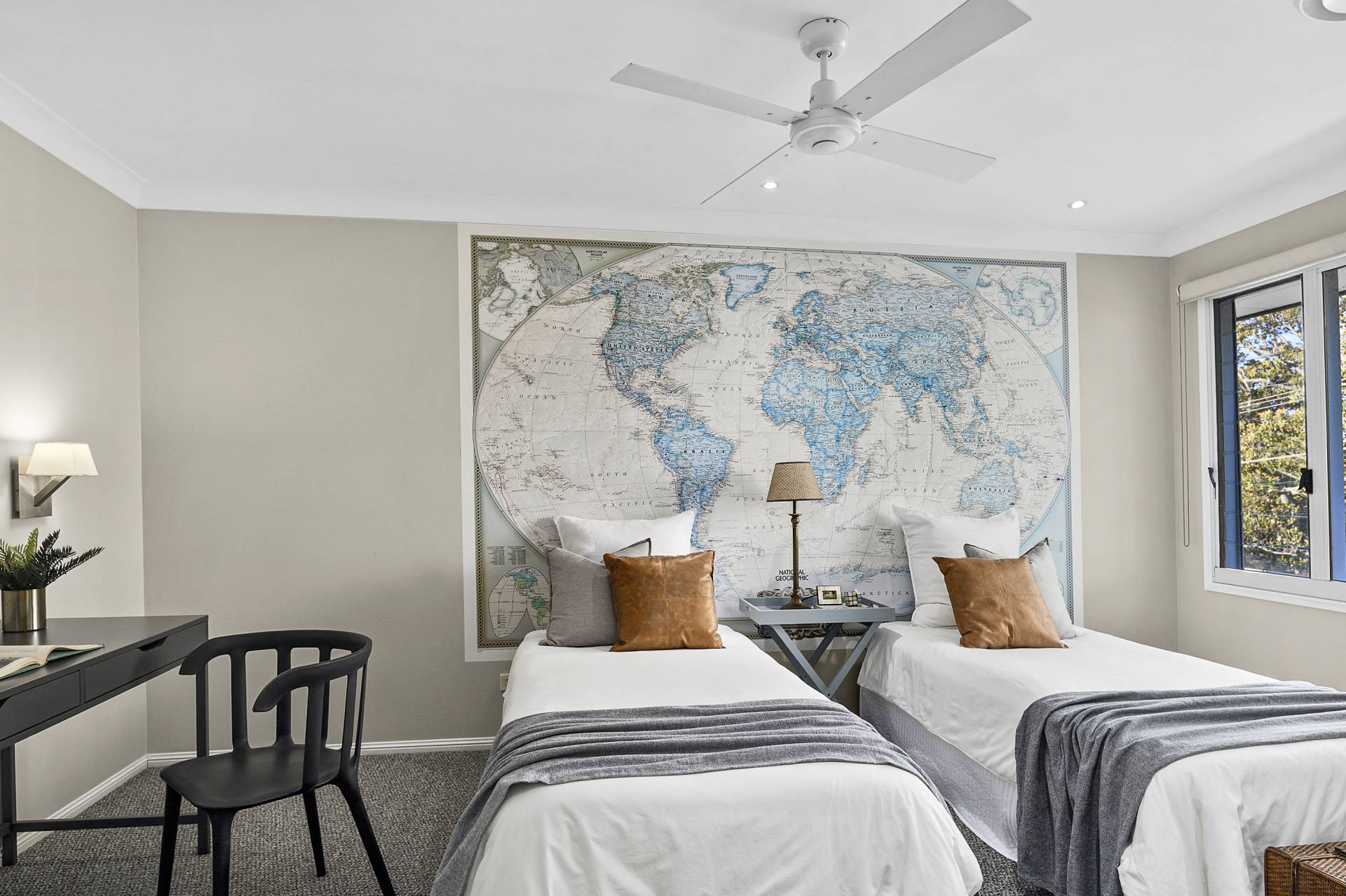 Upstairs, an enormous landing does double duty as a rumpus space, and wraps around the atrium to form a gallery from which are accessed the four bedrooms, the family bathroom (with bathtub and separate shower), a separate toilet and linen cupboards.  All bedrooms feature built-in wardrobes and generous windows with garden views.