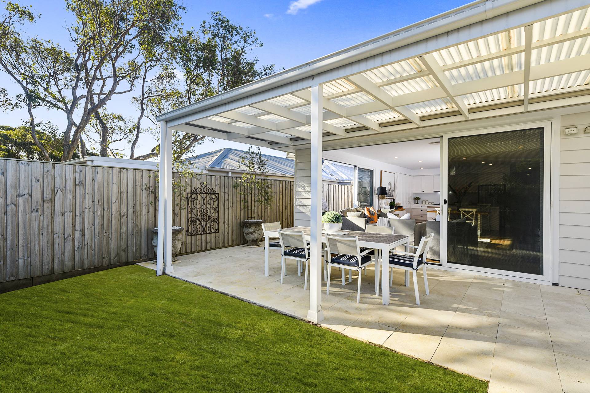 Moving past the laundry and guest powder room, the hallway leads to the large open-plan kitchen, living and dining area – a space flooded with natural light thanks to two walls of floor-to-ceiling glass that bring the outdoors in - thoughtfully designed and laid out in such a way as to provide for a seamless flow. Taking every advantage of the space, the living areas provide ample room for entertaining and open onto a pergola-covered terrace and low maintenance, fully fenced and secure garden with lawn, perfect for summertime BBQs and outdoor gatherings.