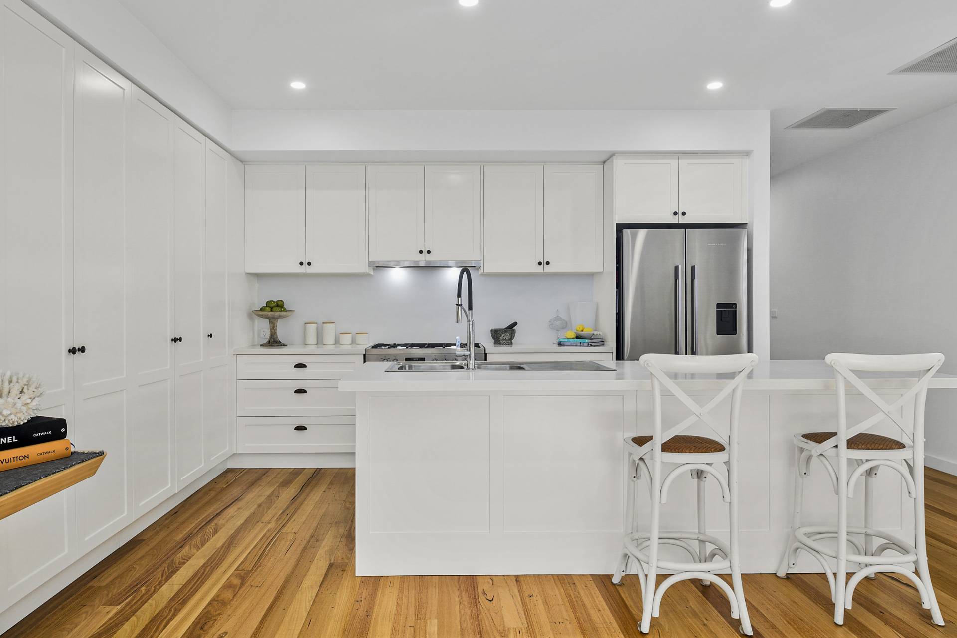 The kitchen is a truly delightful space with its island bench a magnet for drawing together family and friends. High-end stainless-steel appliances, heaps of clever storage to be found behind slick white cabinetry and Caesarstone benchtops combine to make for a kitchen that’s a joy to spend time in, whether cooking and sharing meals or simply enjoying some leisurely downtime savouring a morning or afternoon bevvie.