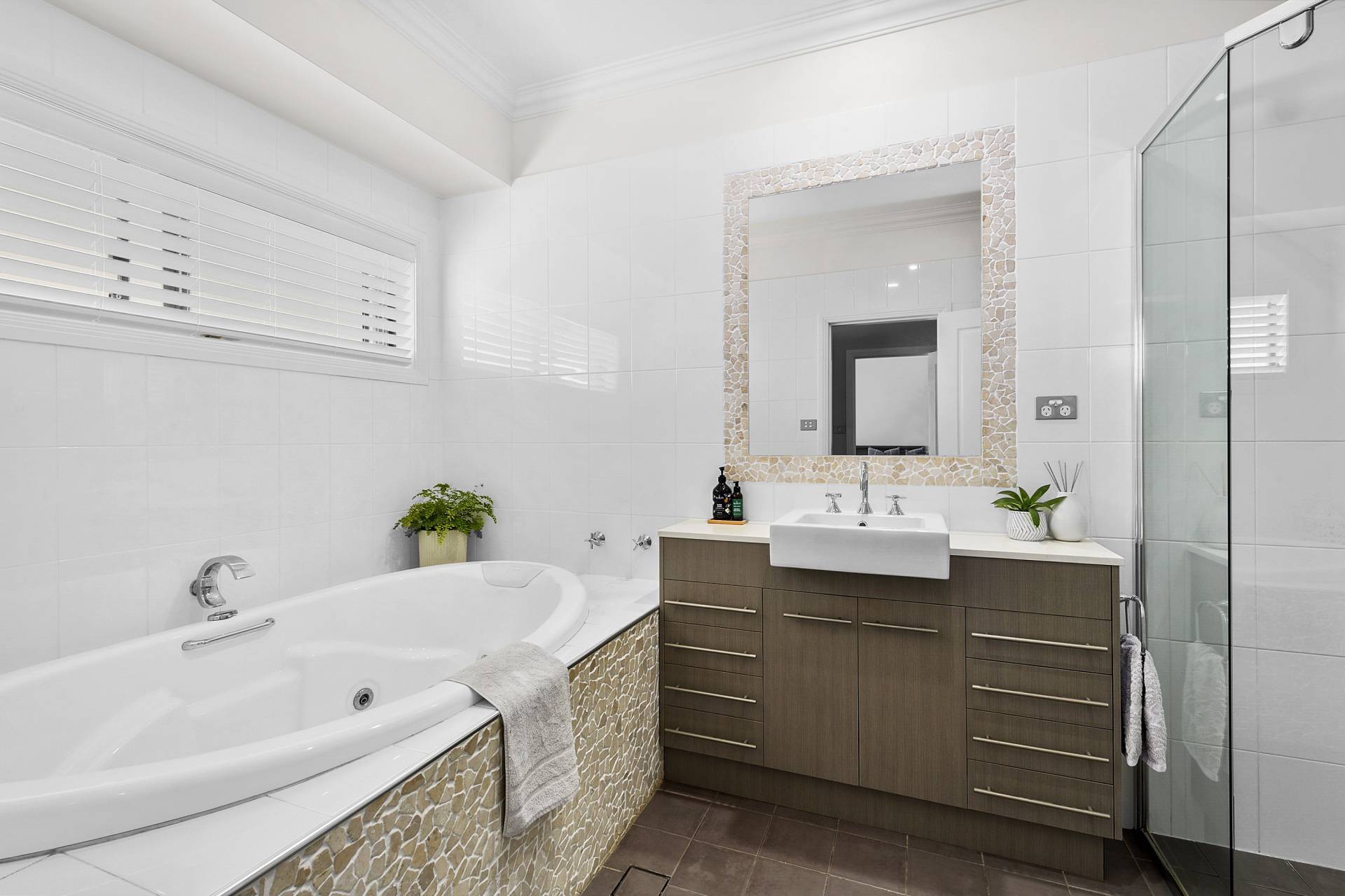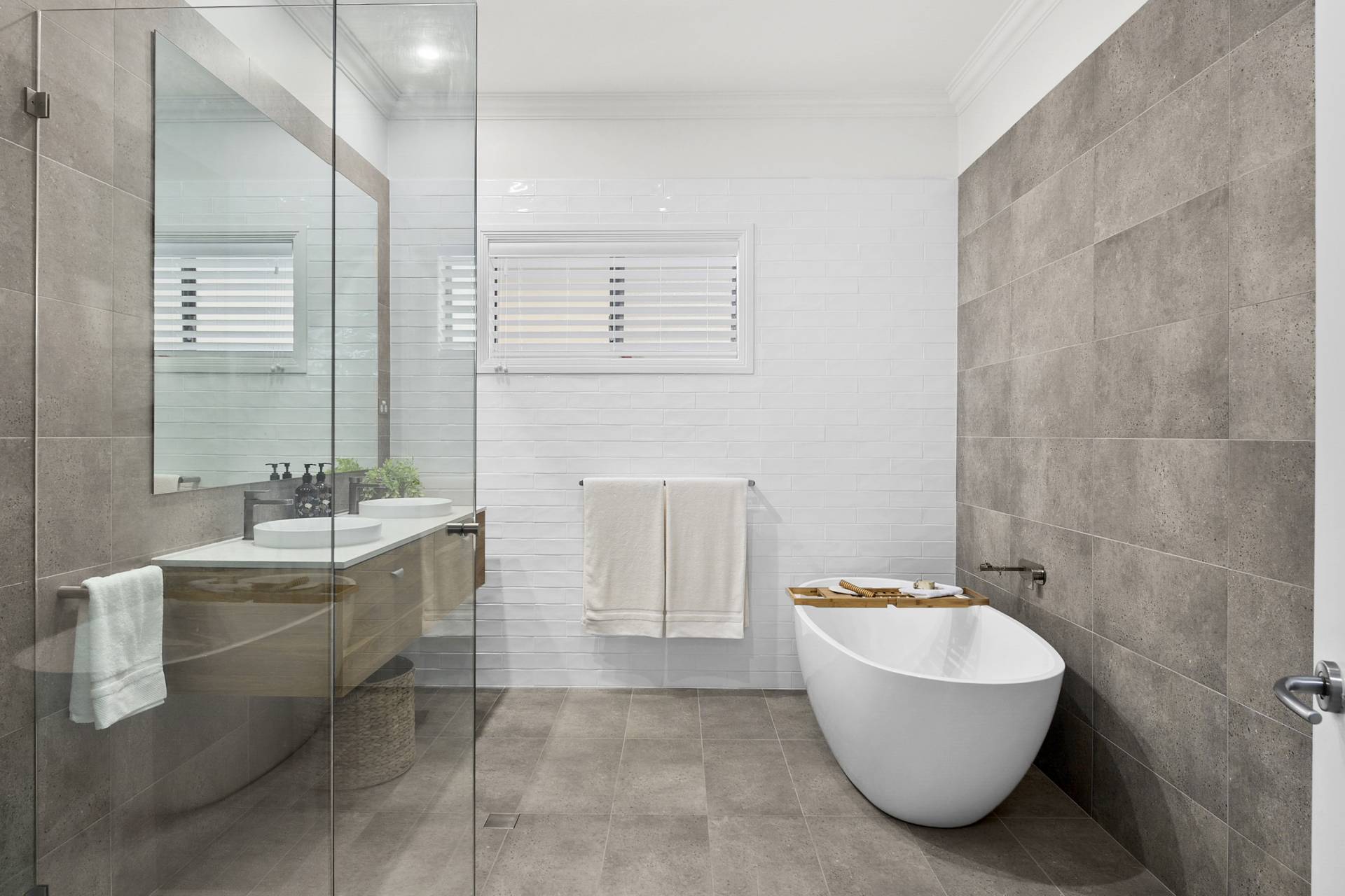 For utmost privacy, the home’s four bedrooms are situated at the back of the residence and are accessed from a gallery-style hallway running the length of the house. The principal bedroom features generous walk-in wardrobes and ensuite complete with bathtub. Two of the double bedrooms also feature walk-in robes providing plentiful storage, and both the principle ensuite and main family bathroom feature sleek finishes for a modern and luxe look and feel,  A very spacious laundry/mud room with adjoining powder room complete the offering.