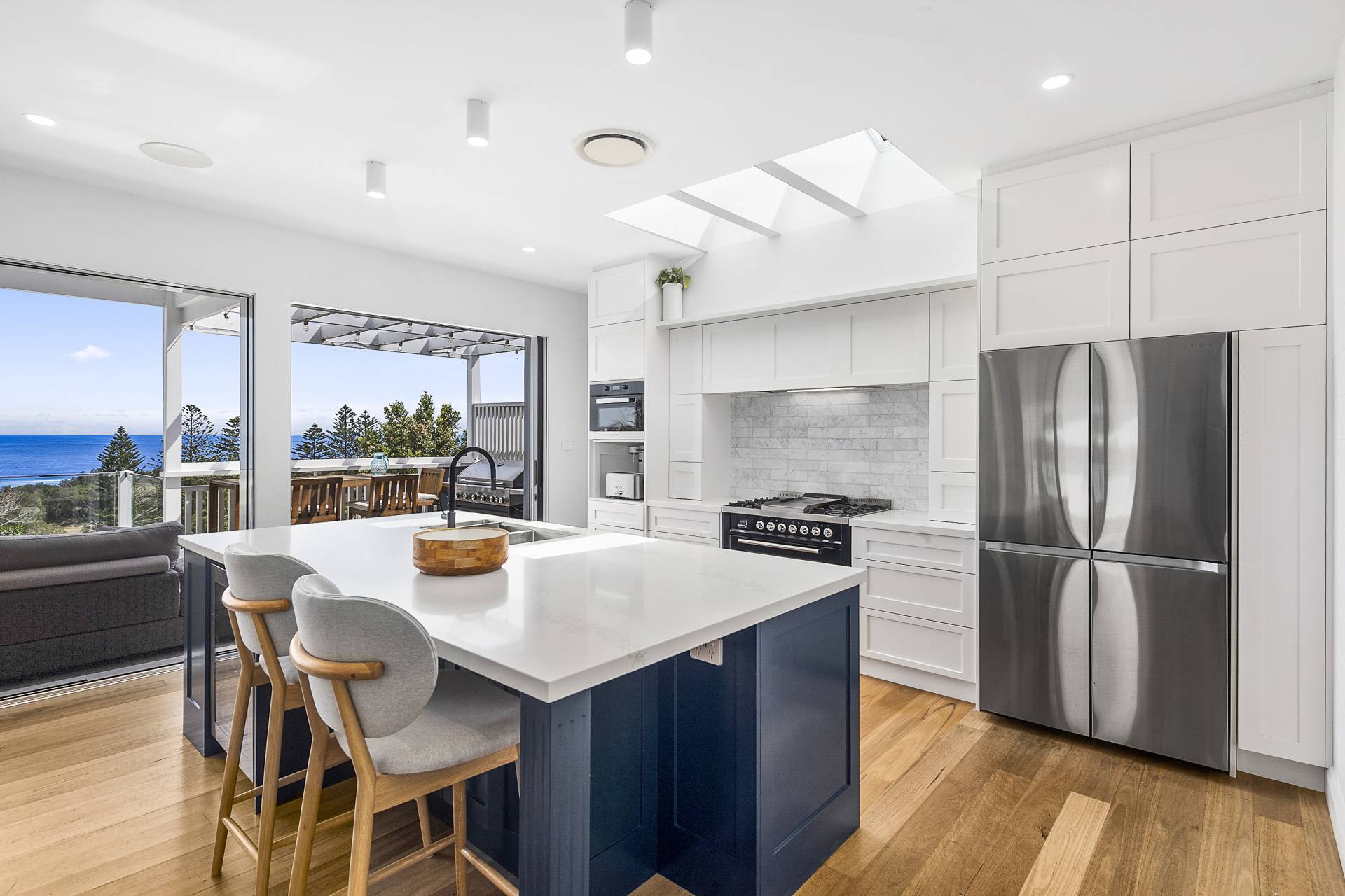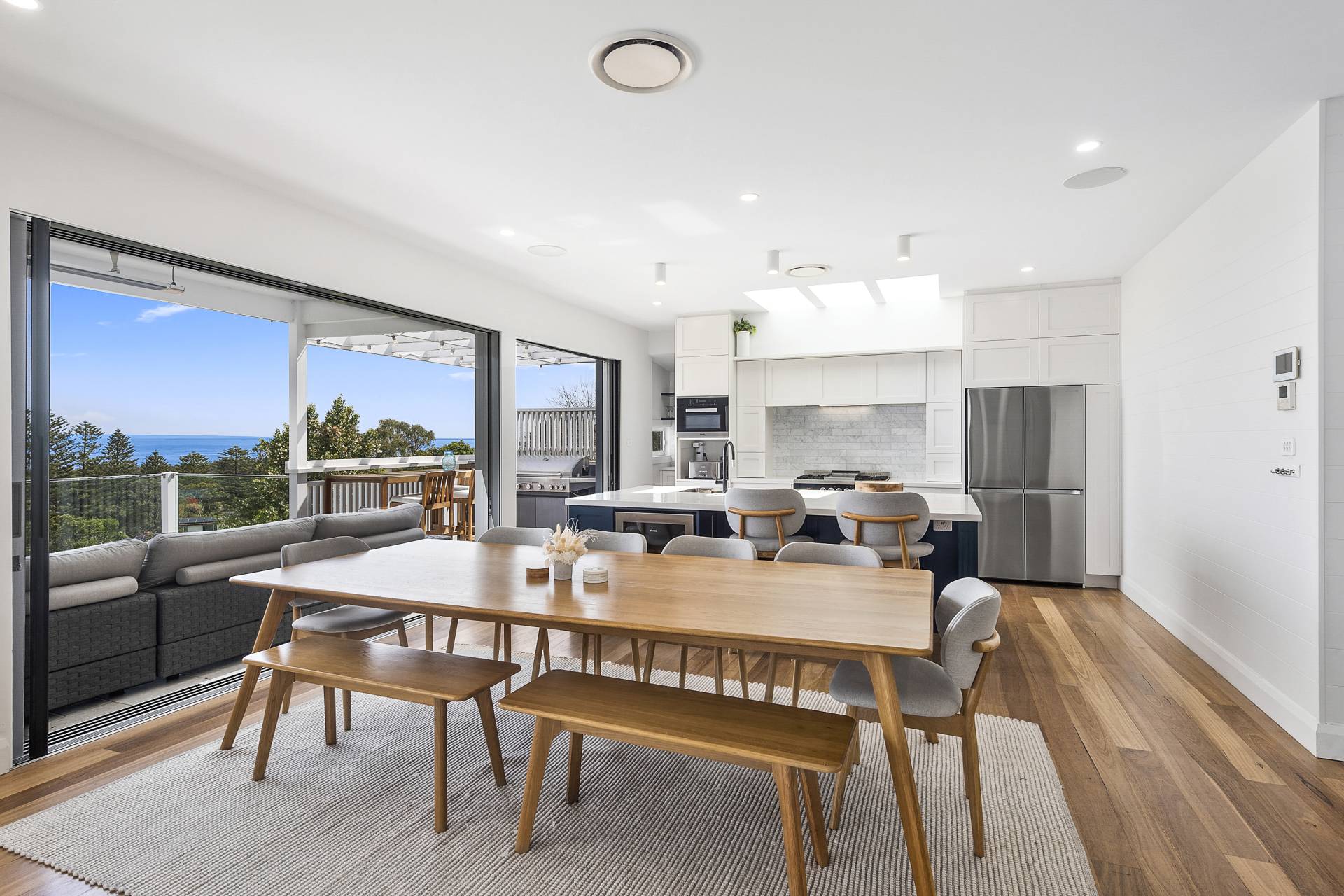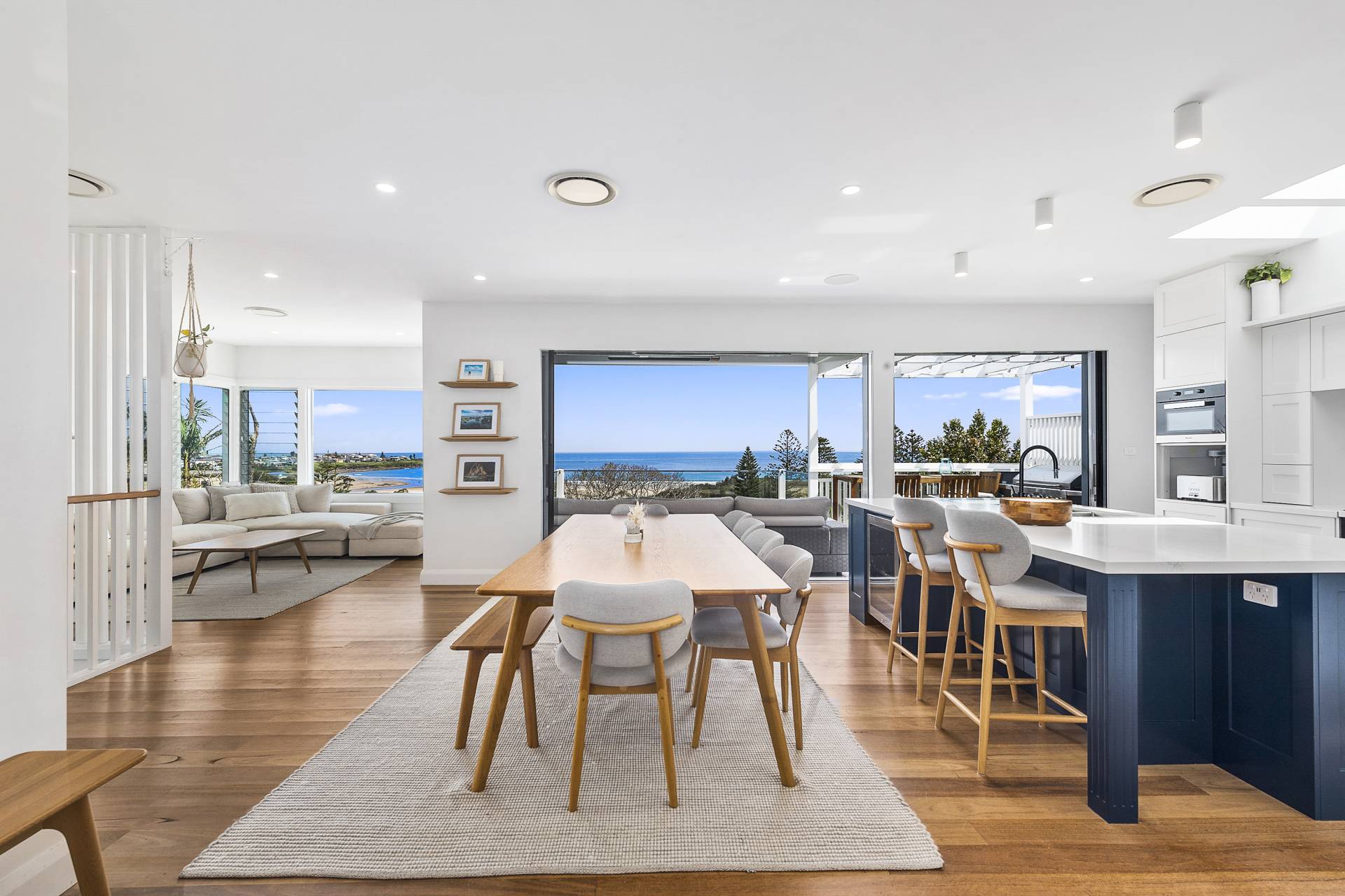 From the street, the unassuming facade exudes a quaint coastal appeal, and gives no indication of the expansive interior that unfolds across multiple levels. Stepping through the front door from the double carport and into the upper-level, open plan living, dining and kitchen space, visitors to the property are instantly greeted by the aforementioned view, thanks to a bank of windows spanning the width of the house. These same windows ensure that the living areas are bathed in natural light, creating a seamless connection between the home and its breathtaking backdrop and which open onto a vast covered balcony.