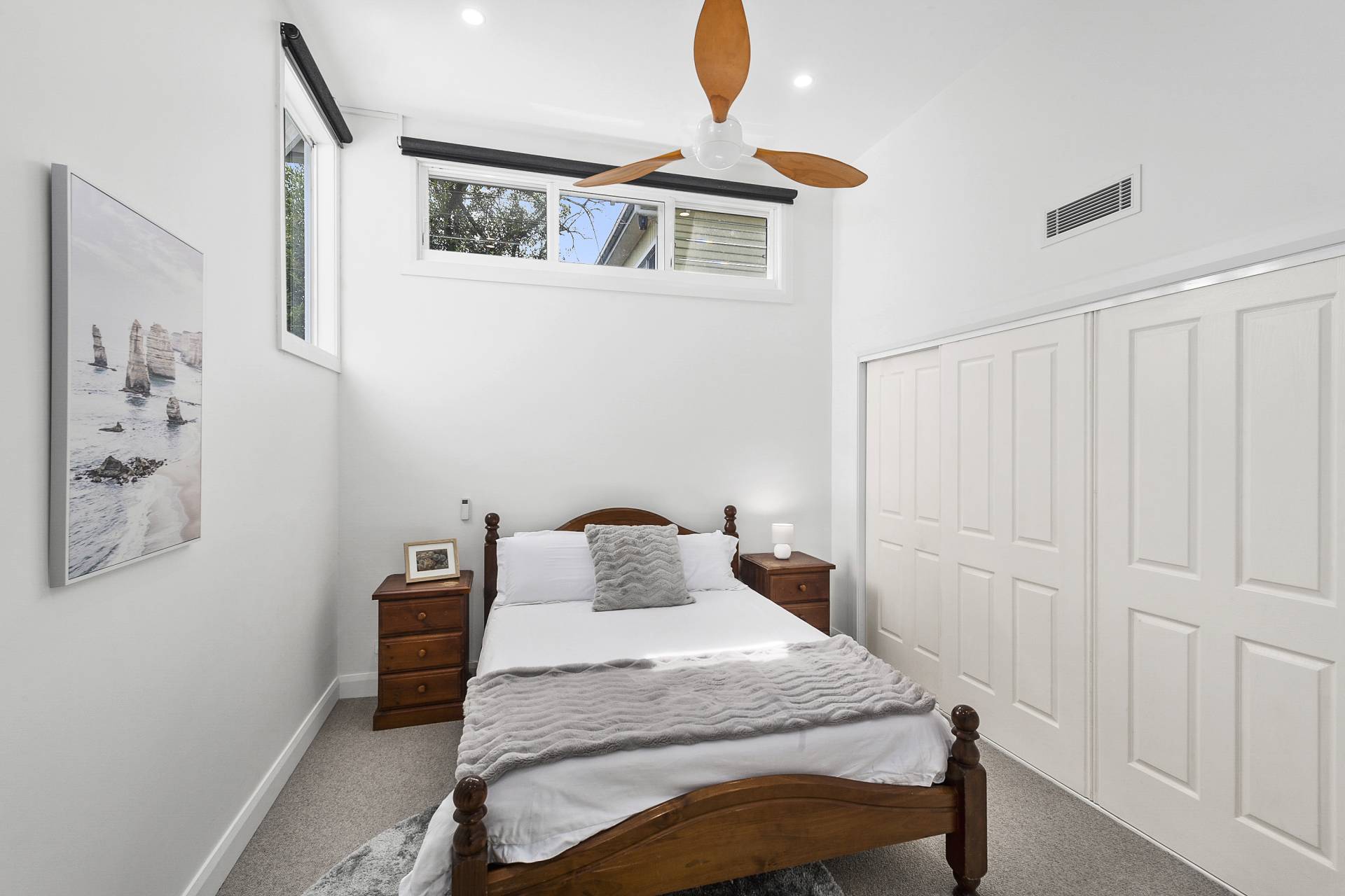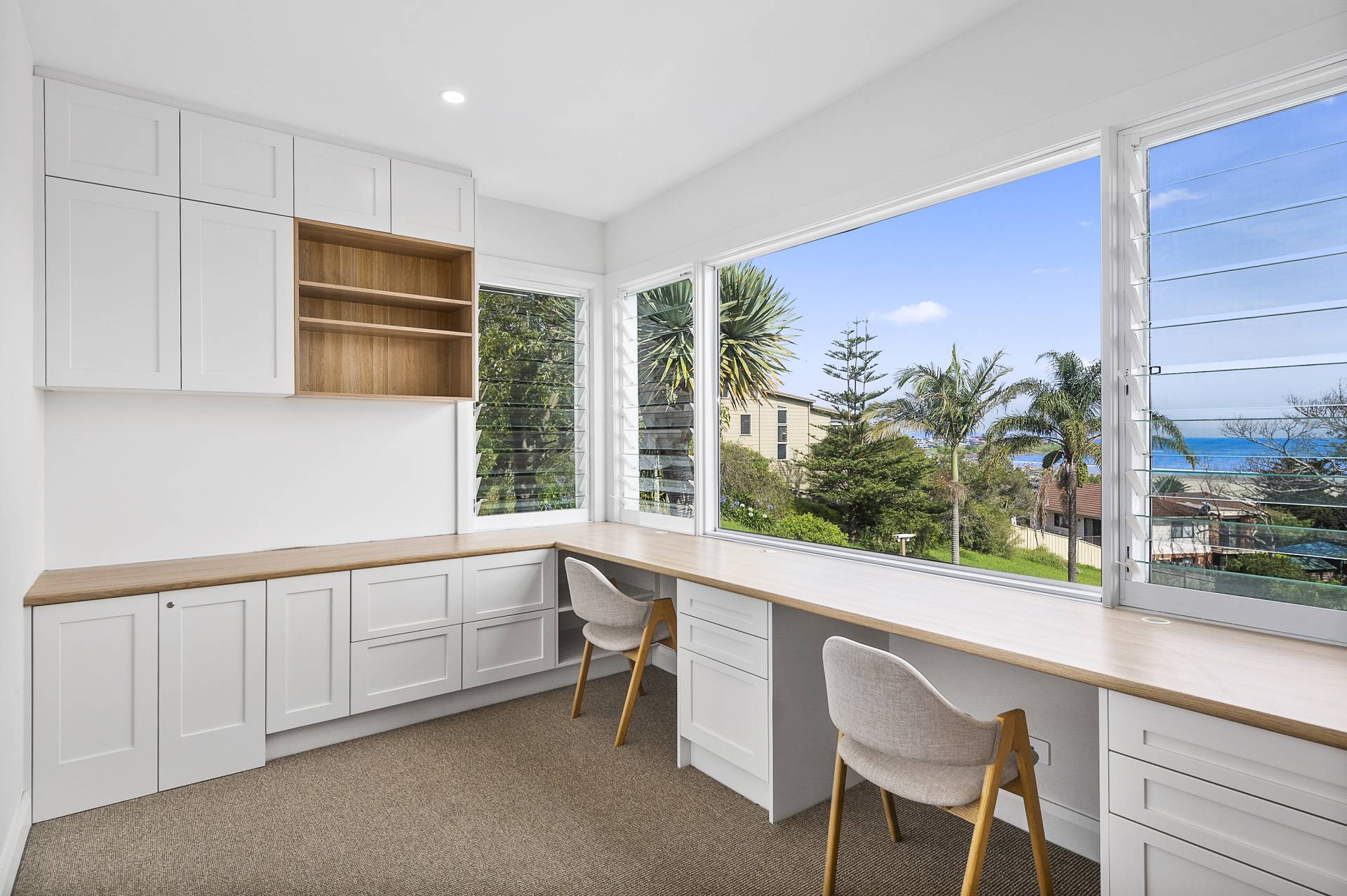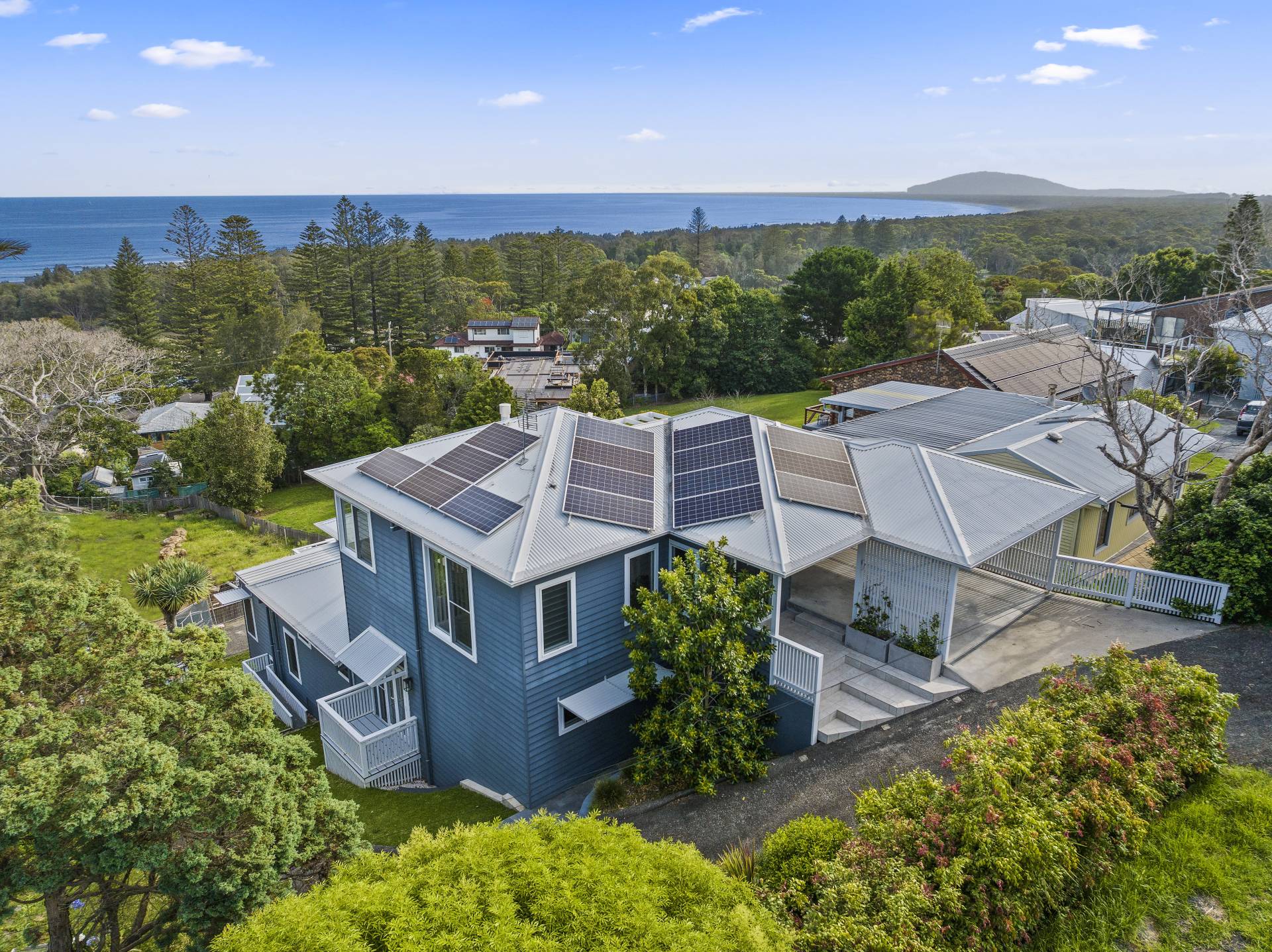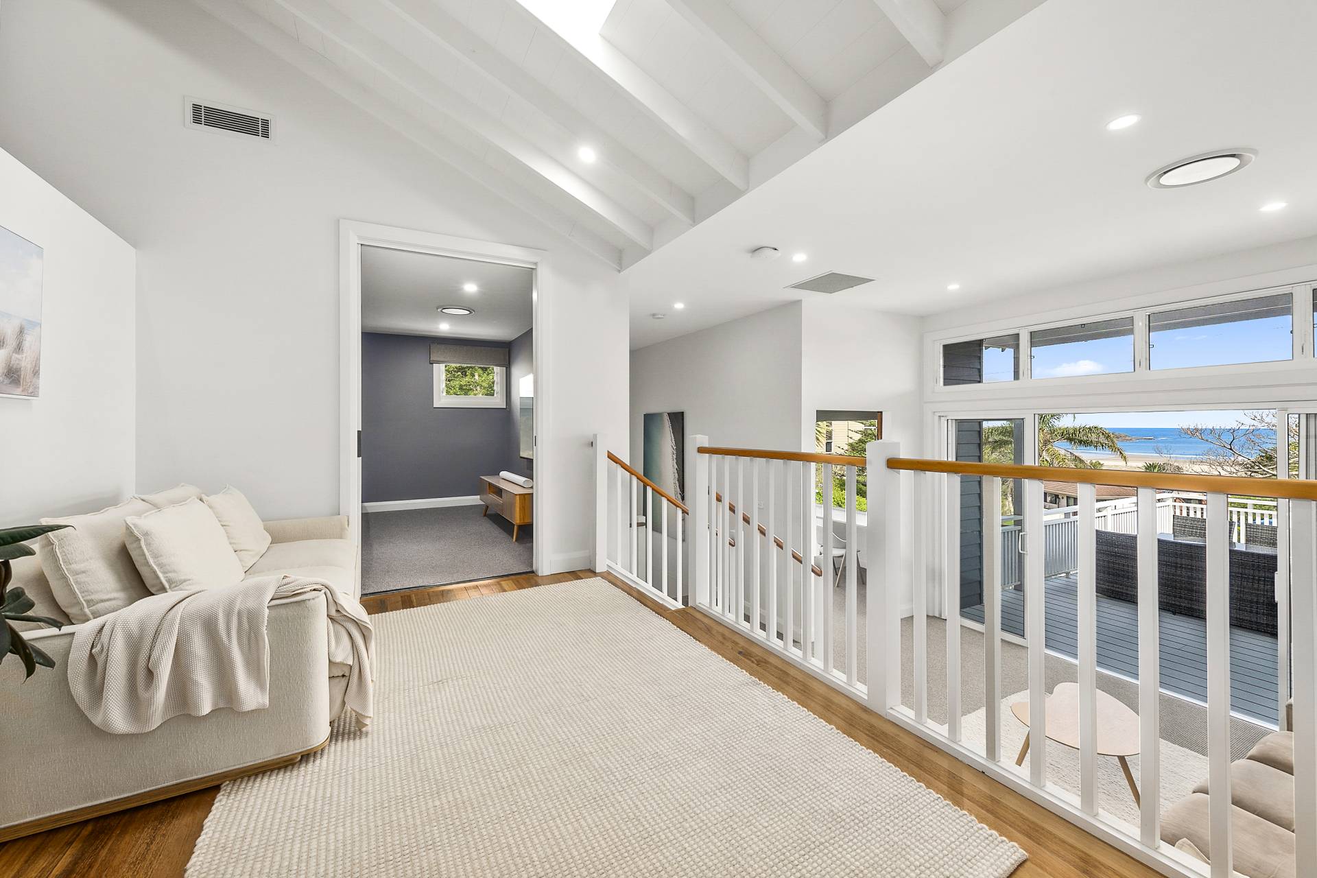 From the street, the unassuming facade exudes a quaint coastal appeal, and gives no indication of the expansive interior that unfolds across multiple levels. Stepping through the front door from the double carport and into the upper-level, open plan living, dining and kitchen space, visitors to the property are instantly greeted by the aforementioned view, thanks to a bank of windows spanning the width of the house. These same windows ensure that the living areas are bathed in natural light, creating a seamless connection between the home and its breathtaking backdrop and which open onto a vast covered balcony.