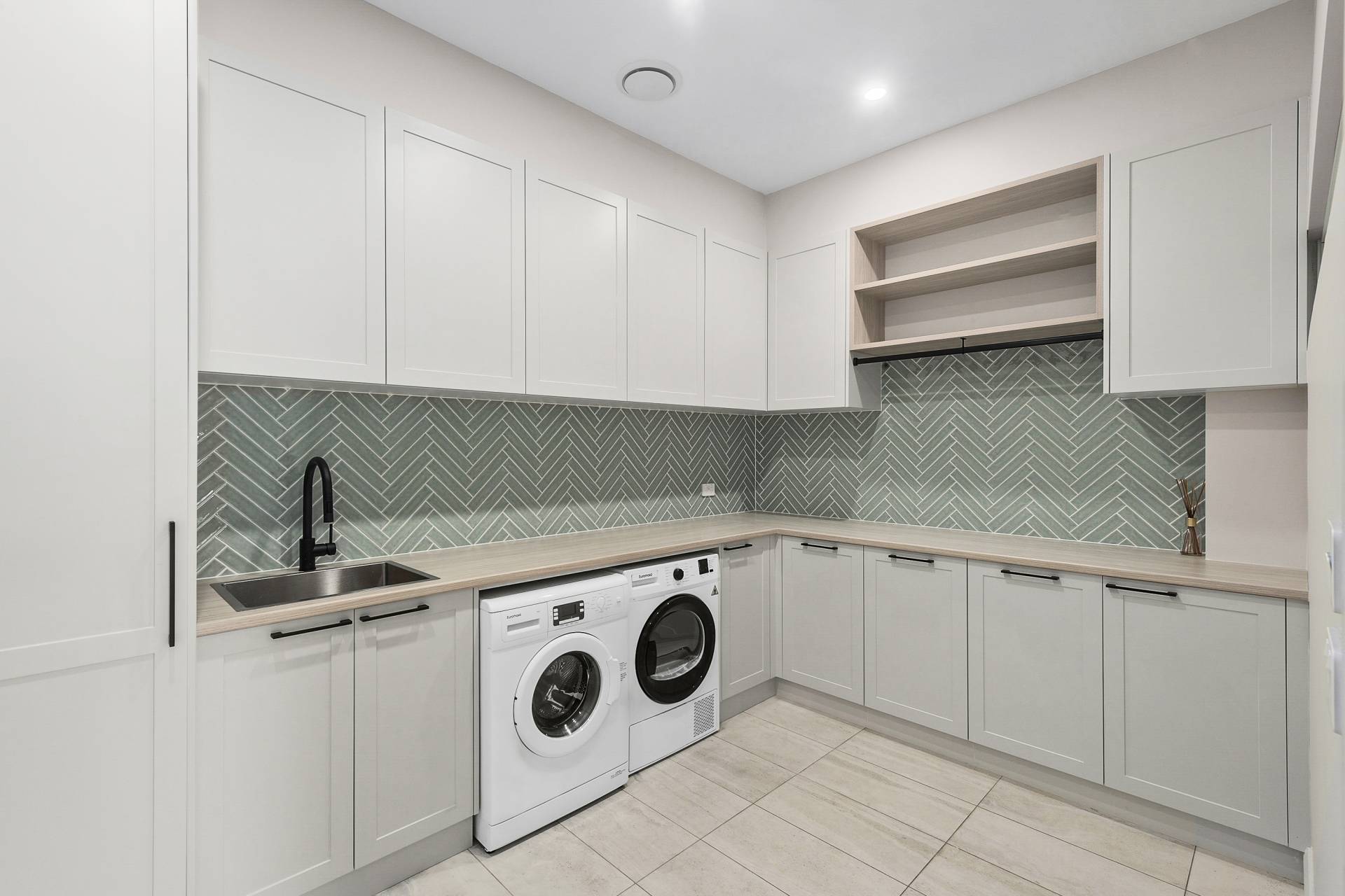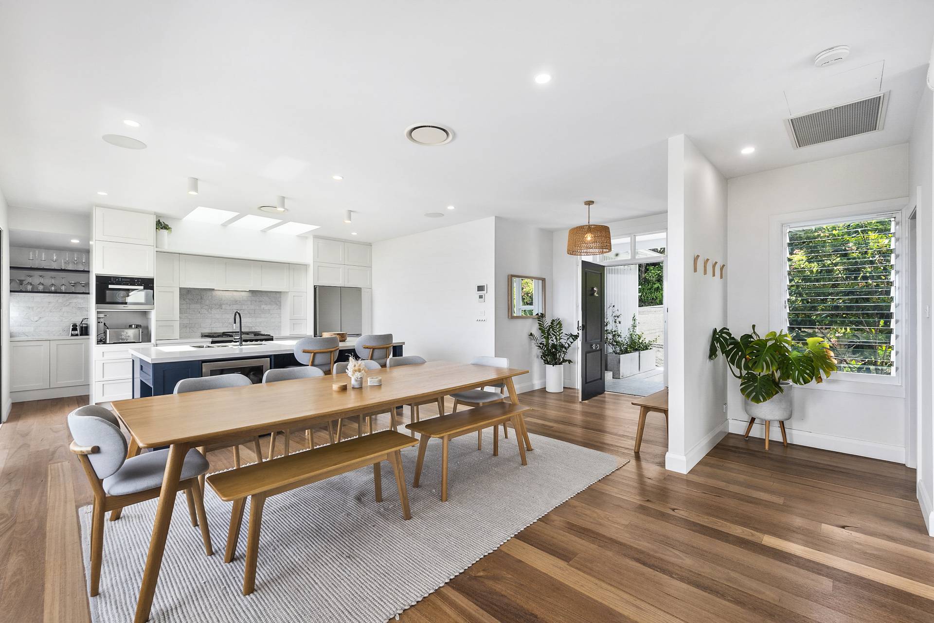 In the main living room, a gas fireplace adds warmth and ambiance, ensuring comfort during the cooler months. The gourmet kitchen is equipped with quality stainless steel appliances (including under bench wine fridge) and cleverly incorporates a butler’s pantry and generous storage. Thoughtful touches extend to the four-legged members of the family, with built-in water bowls in the kitchen island and a discreet doggy door and ramp leading to a garden space.