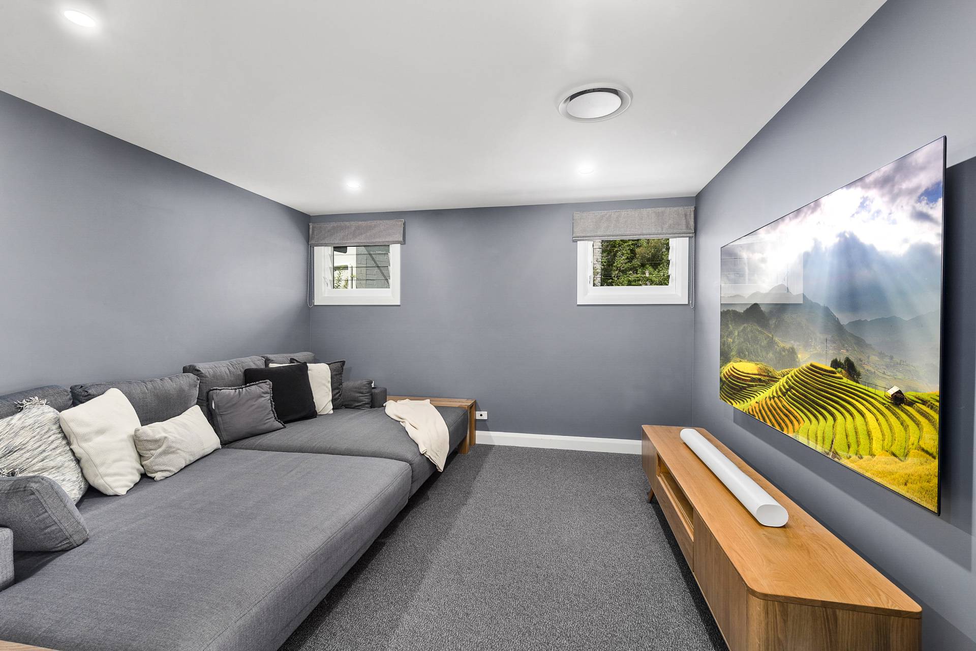 The lower deck and swim spa is also accessible from the dedicated media room (perfect for movie nights), a generously sized rumpus room and a meticulously crafted home office with built-in cabinetry which can be closed off for added privacy behind a feature chevron-design barn door.  Multiple storage rooms, expansive laundry and mud rooms complete the interior offerings, with an additional two parking spaces and access to a workroom and even more storage located on the lowest level with access below the deck.