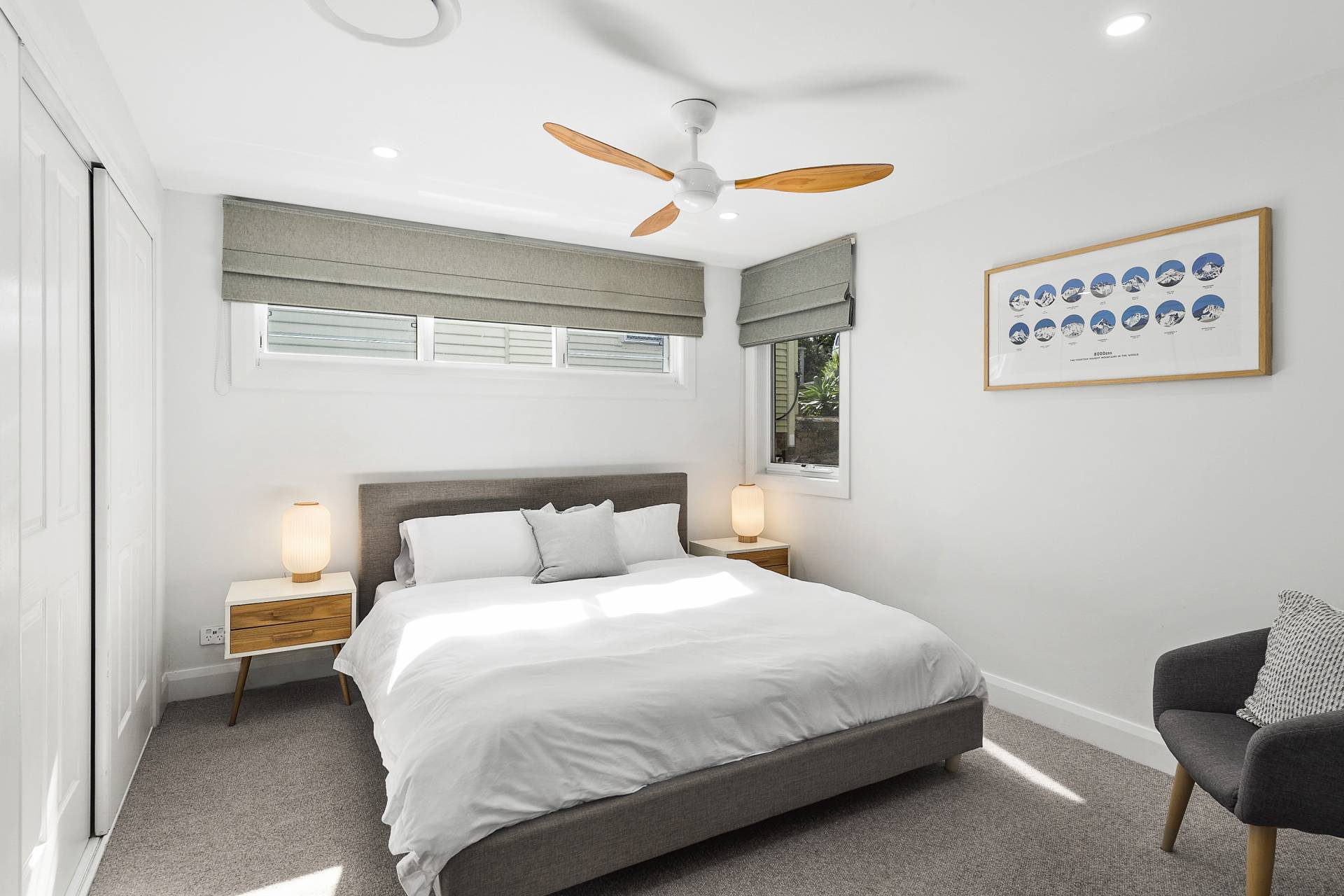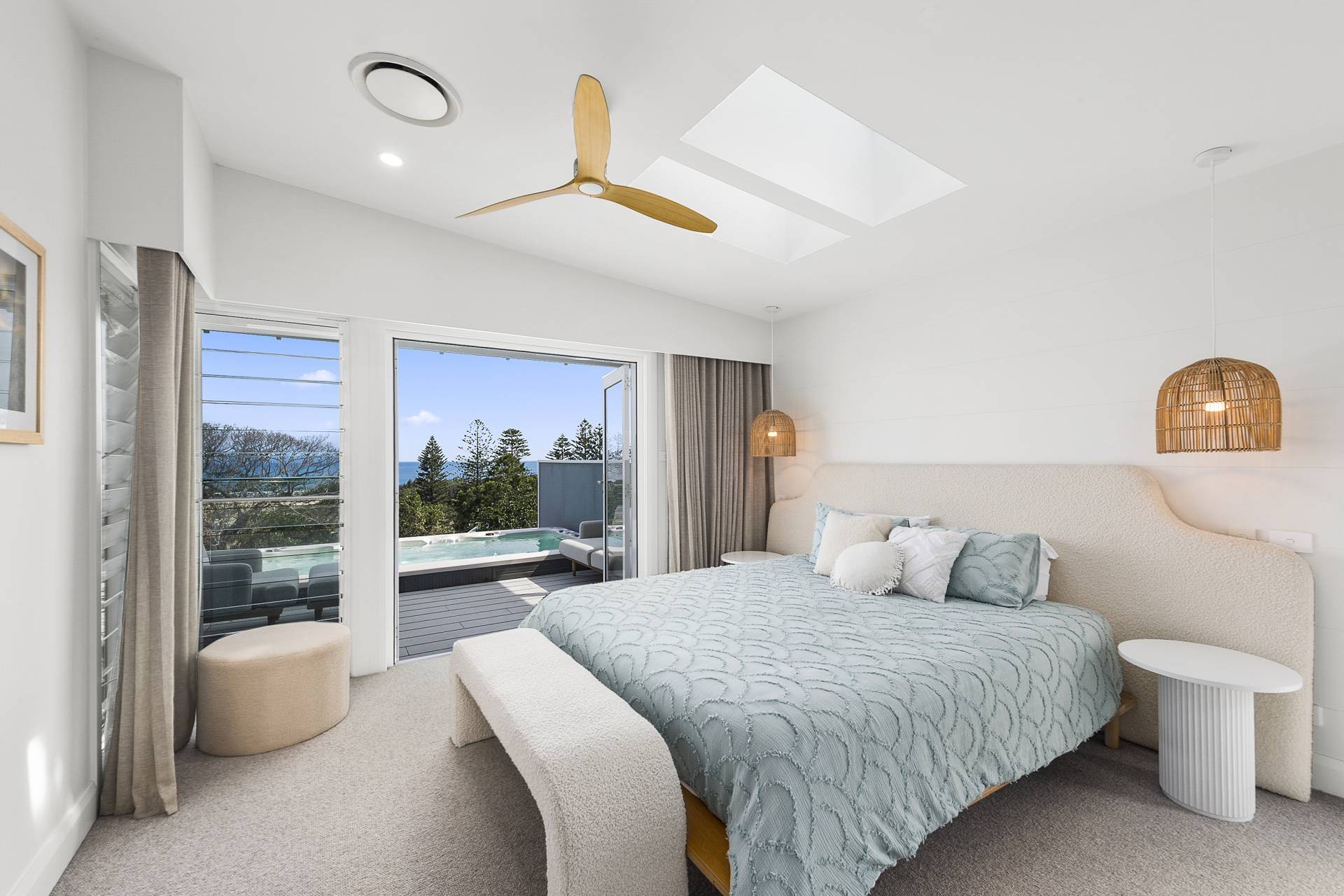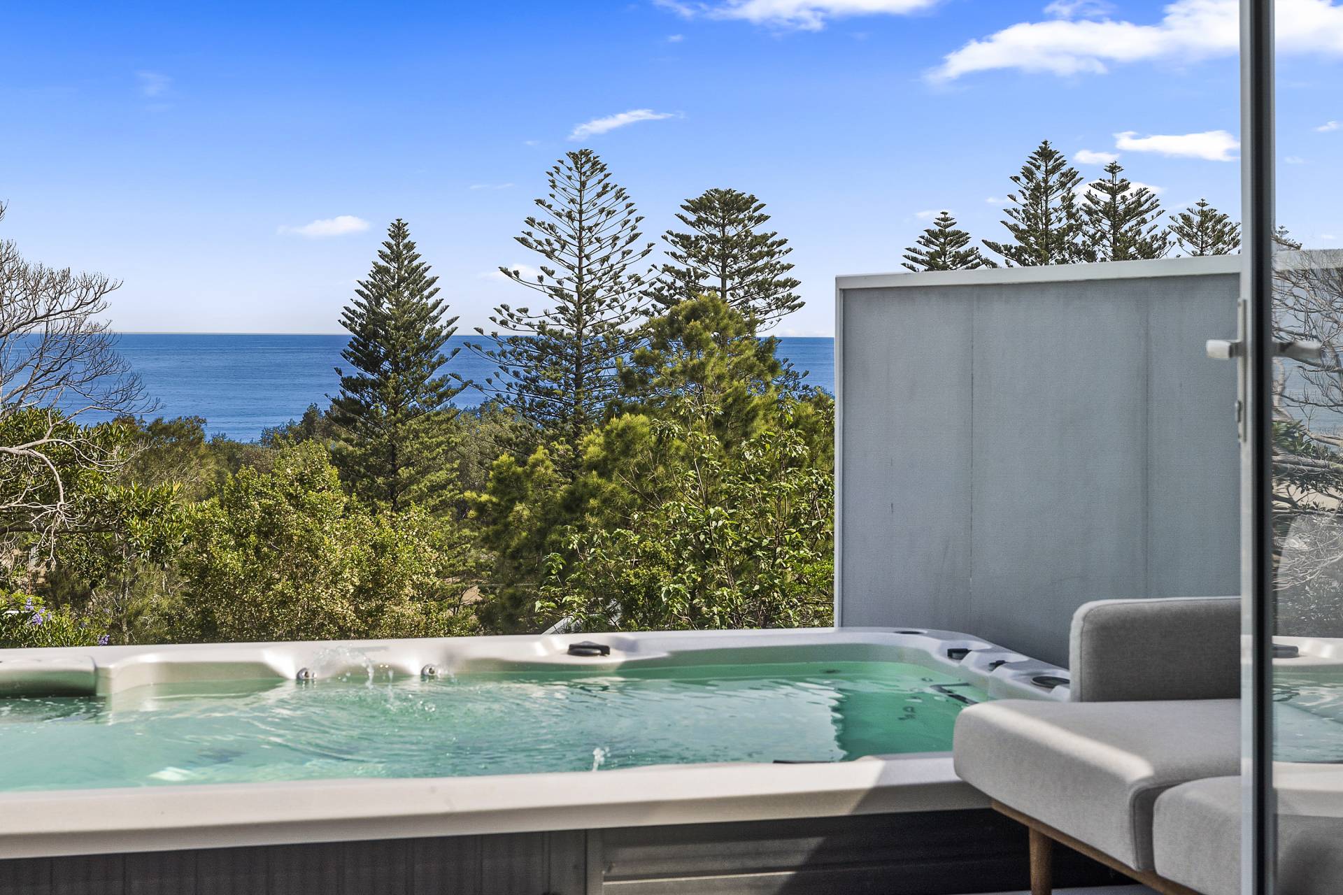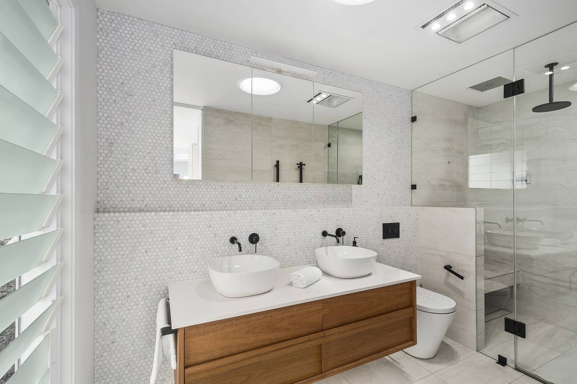 The ingenious design continues on the lower levels, with three generously sized double bedrooms all with built-in or walk-in wardrobes, one a guest room with ensuite bathroom, the other two sharing a ‘jack and jill’ family bathroom. The fourth, principal bedroom suite reigns supreme, boasting an oversized walk-in robe with elegant, bespoke cabinetry, an ensuite with a luxurious steam shower, a private balcony, as well as direct access to the lower deck which features an inviting swim spa…a true sanctuary within a sanctuary.