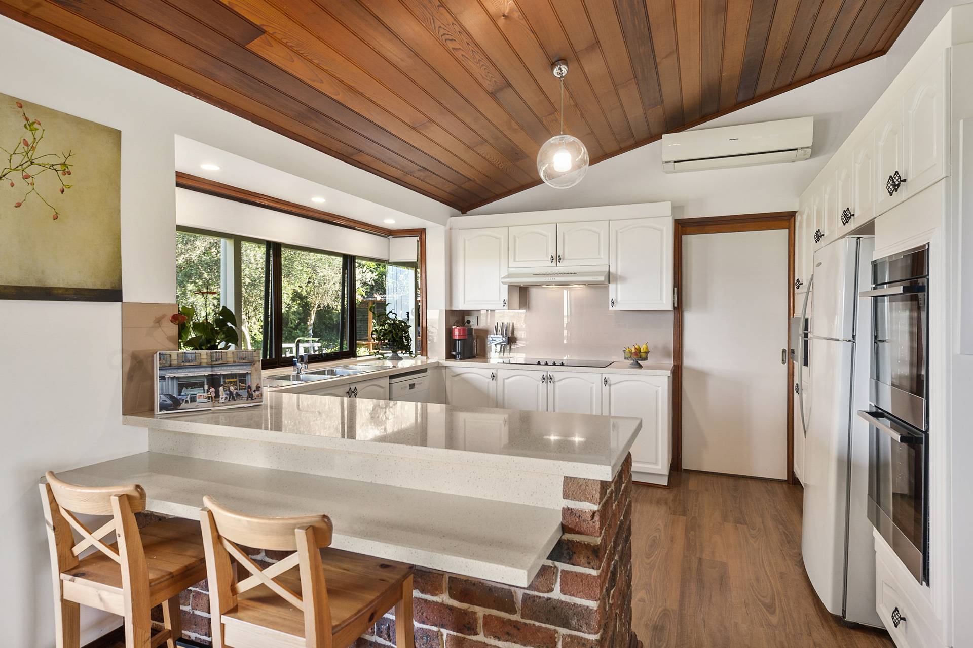 Clad in brick, the single-storey design maximises space thanks to its intelligent floorplan and easy flow; The entry foyer open on two sides – to the left leading into the family living and dining rooms adjoining the kitchen, while to the right, the formal living room.  Raked ceilings clad in timber are a feature throughout.