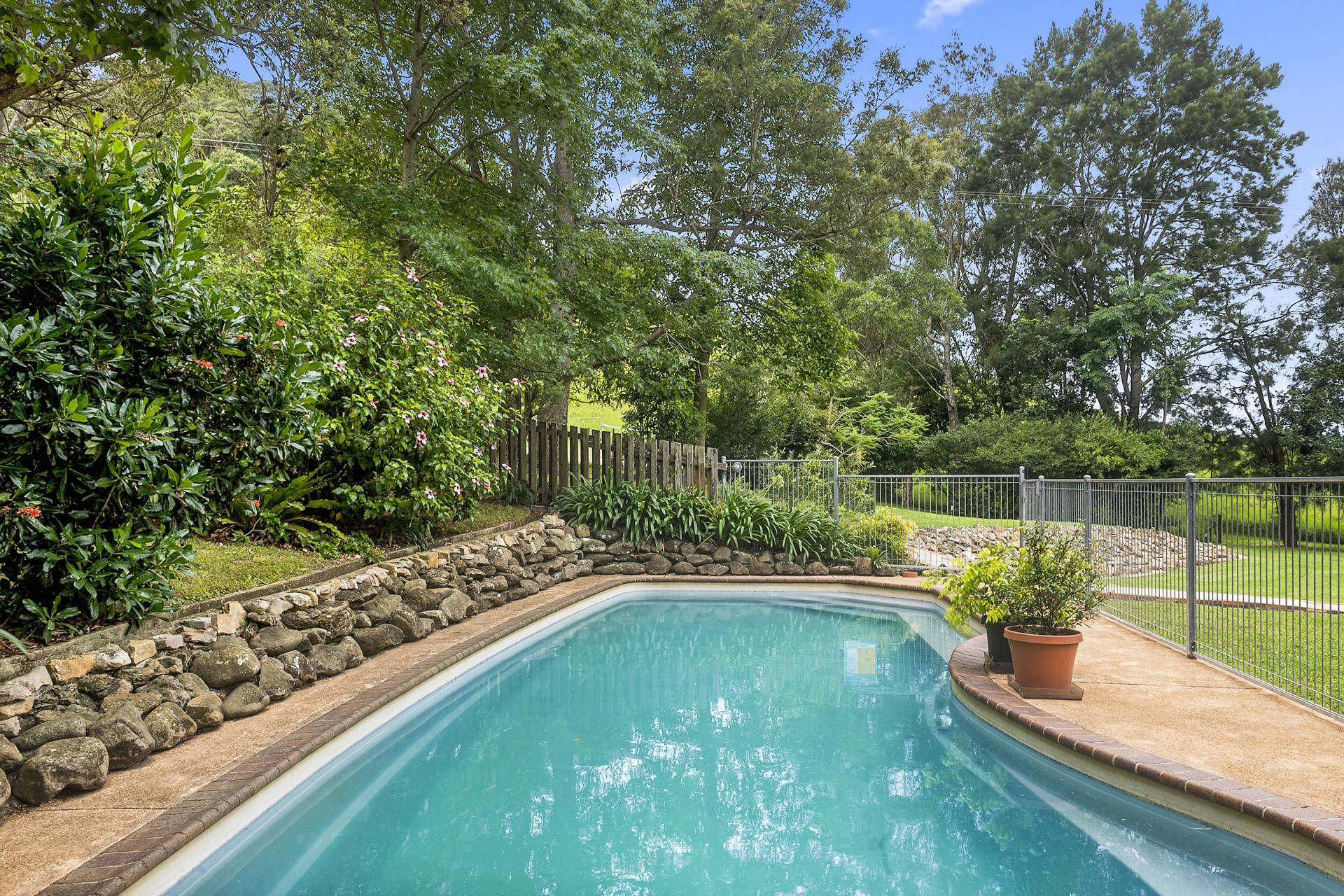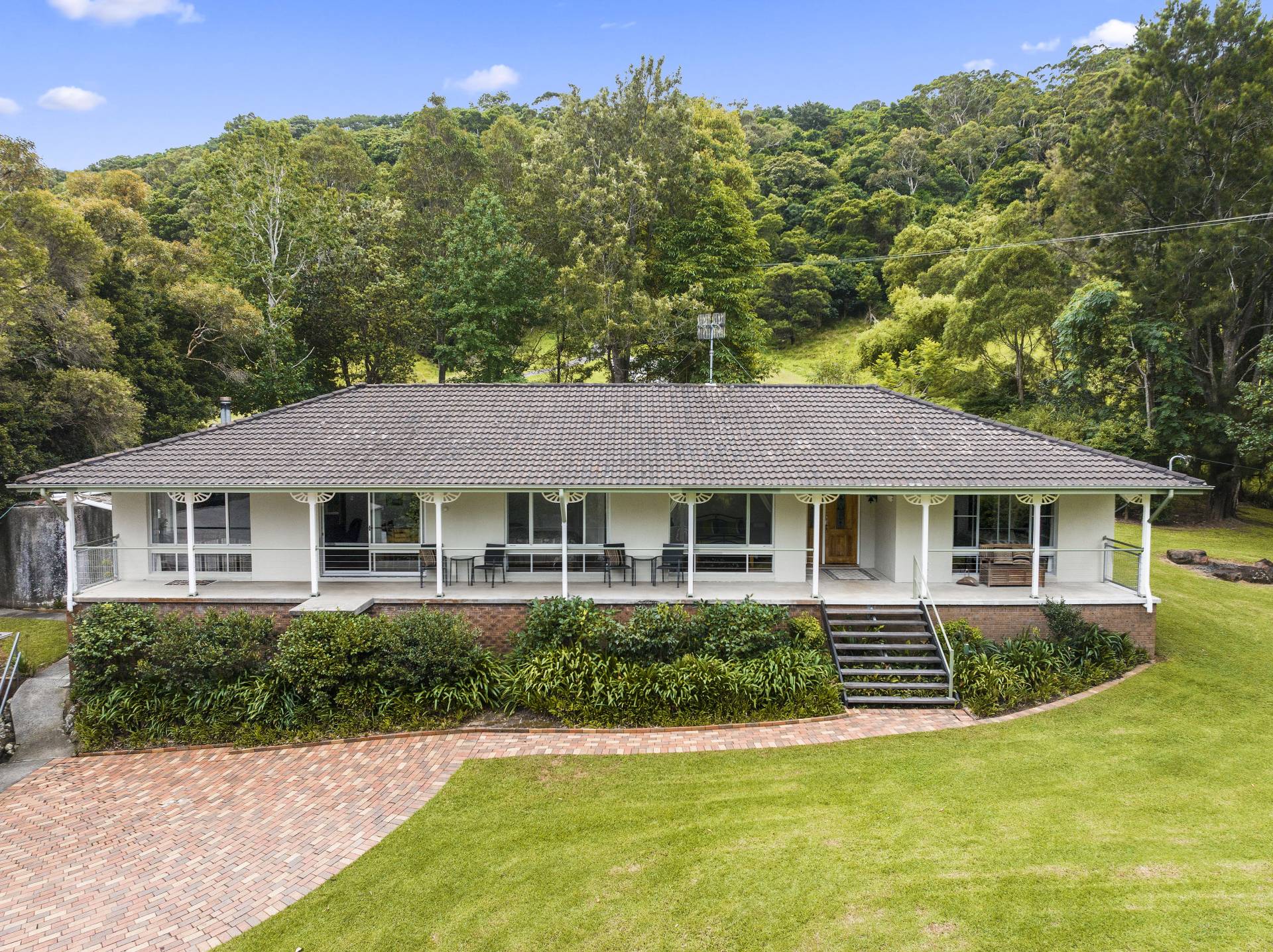 On approach, lush greenery and peaceful ambiance immediately captivate the senses. A hedge-lined road frontage ensures complete privacy, and a welcoming, paved driveway leads you onto the beautifully landscaped property brimming with vibrant flowers and mature trees - the immediate impression is one of serenity, with a substantial remnant rainforest providing a beautiful backdrop.