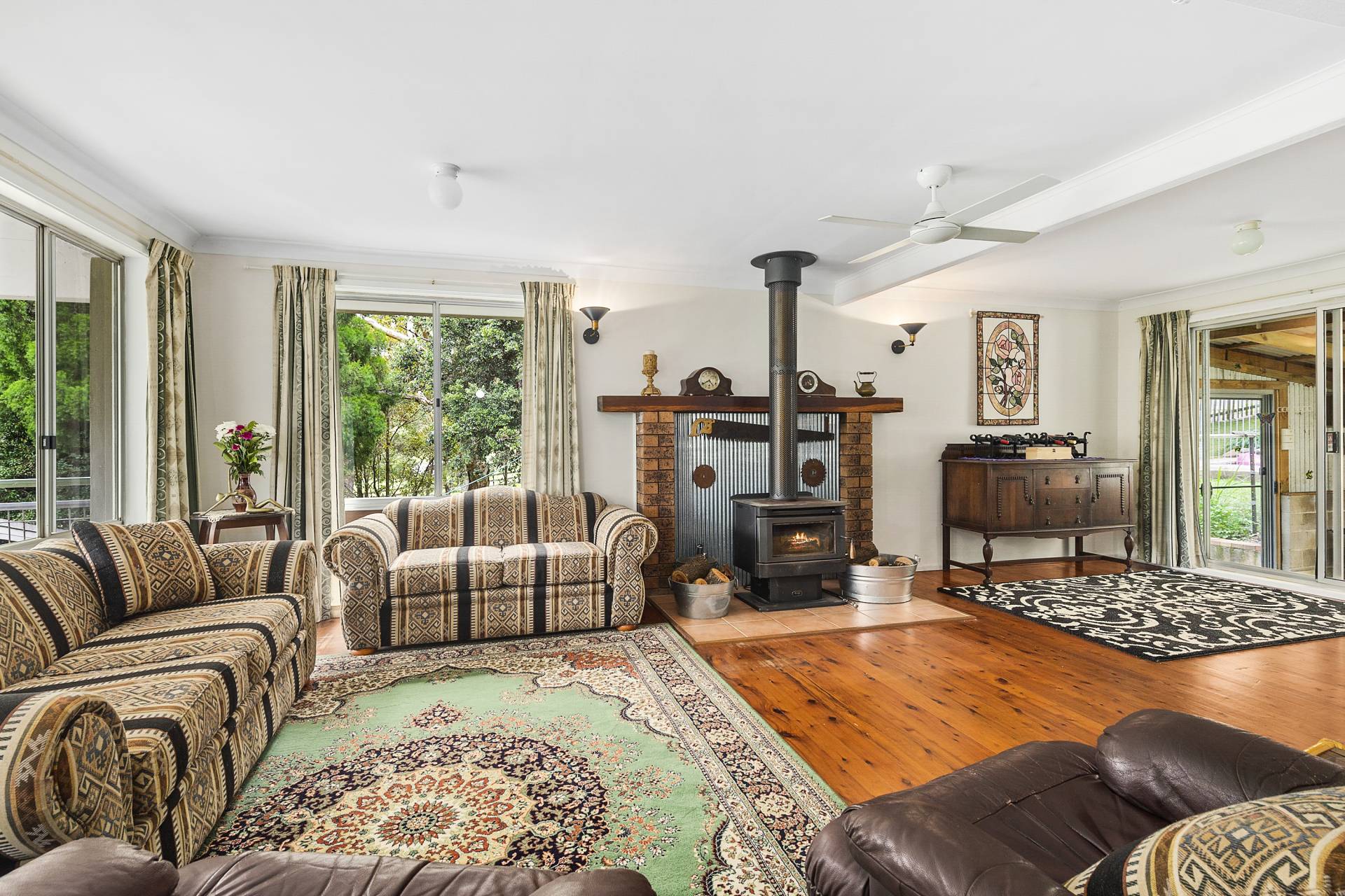 The home is situated on the property to take advantage of the sweeping district views, a deep verandah spanning the entire frontage and providing the perfect setting for entertaining or quiet contemplation.  A generous entrance hall leads on to a spacious and thoughtfully designed floor plan all on a single level and ensuring ample room for the entire family. The open concept living area seamlessly connects the kitchen, dining and lounge spaces, making it perfect for both relaxation and entertaining. Large expanses of glass lead to the verandah from the living room, flooding the space with natural light, while a wood burning fireplace ensures an inviting and warm atmosphere during cooler weather.