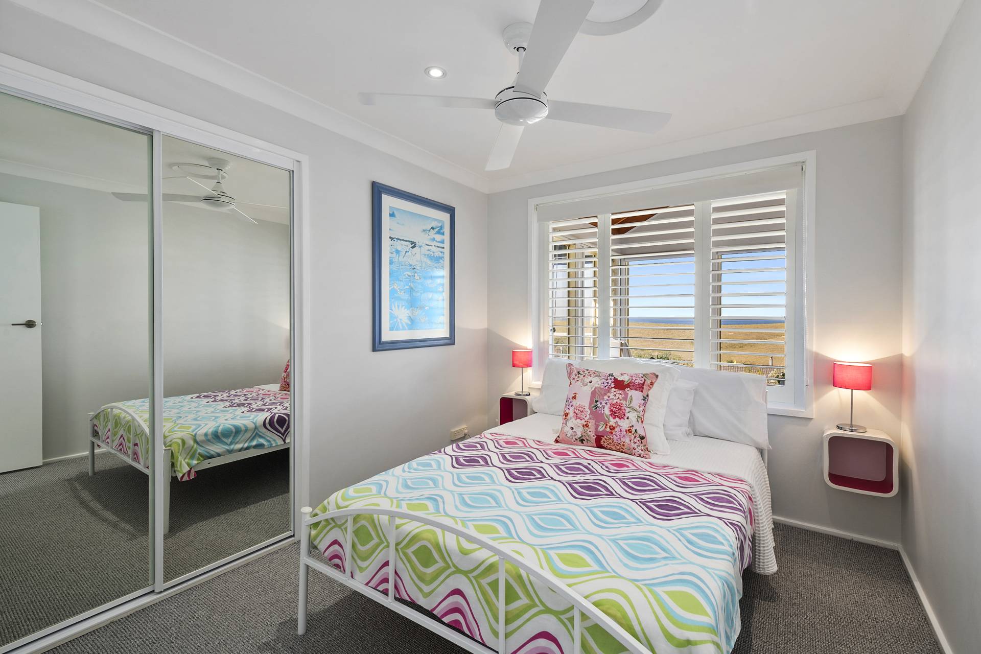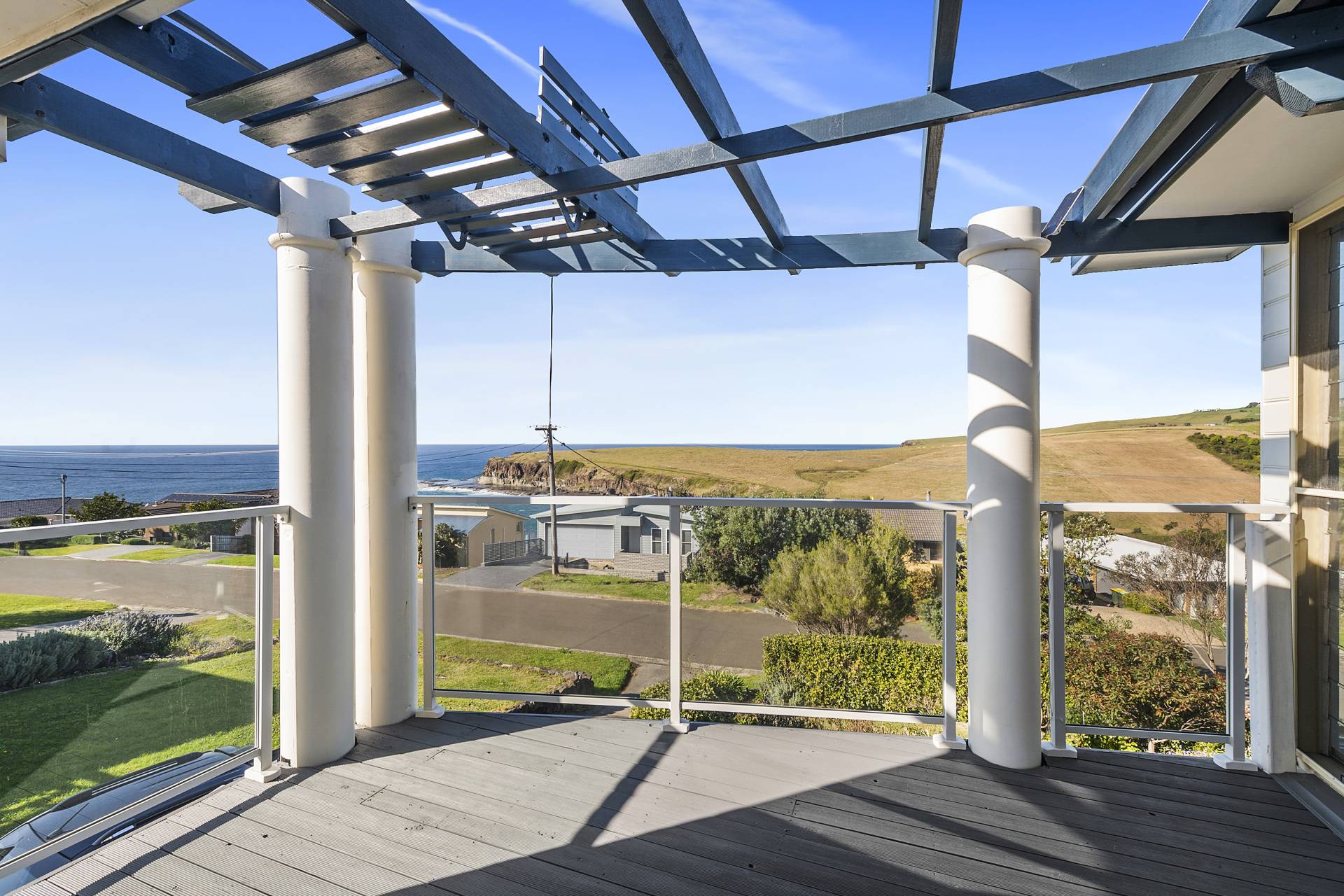 The living and dining area opens onto a covered terrace, seamlessly blending indoor and outdoor living and offers direct access to the rear garden, whilst at the front of the home, wide balconies and a fully enclosed sunroom offer expansive views over Loves Bay, creating a picturesque backdrop to everyday living; imagine enjoying your morning coffee while watching the sunrise over the ocean or hosting dinner parties with the sound of waves in the background.
