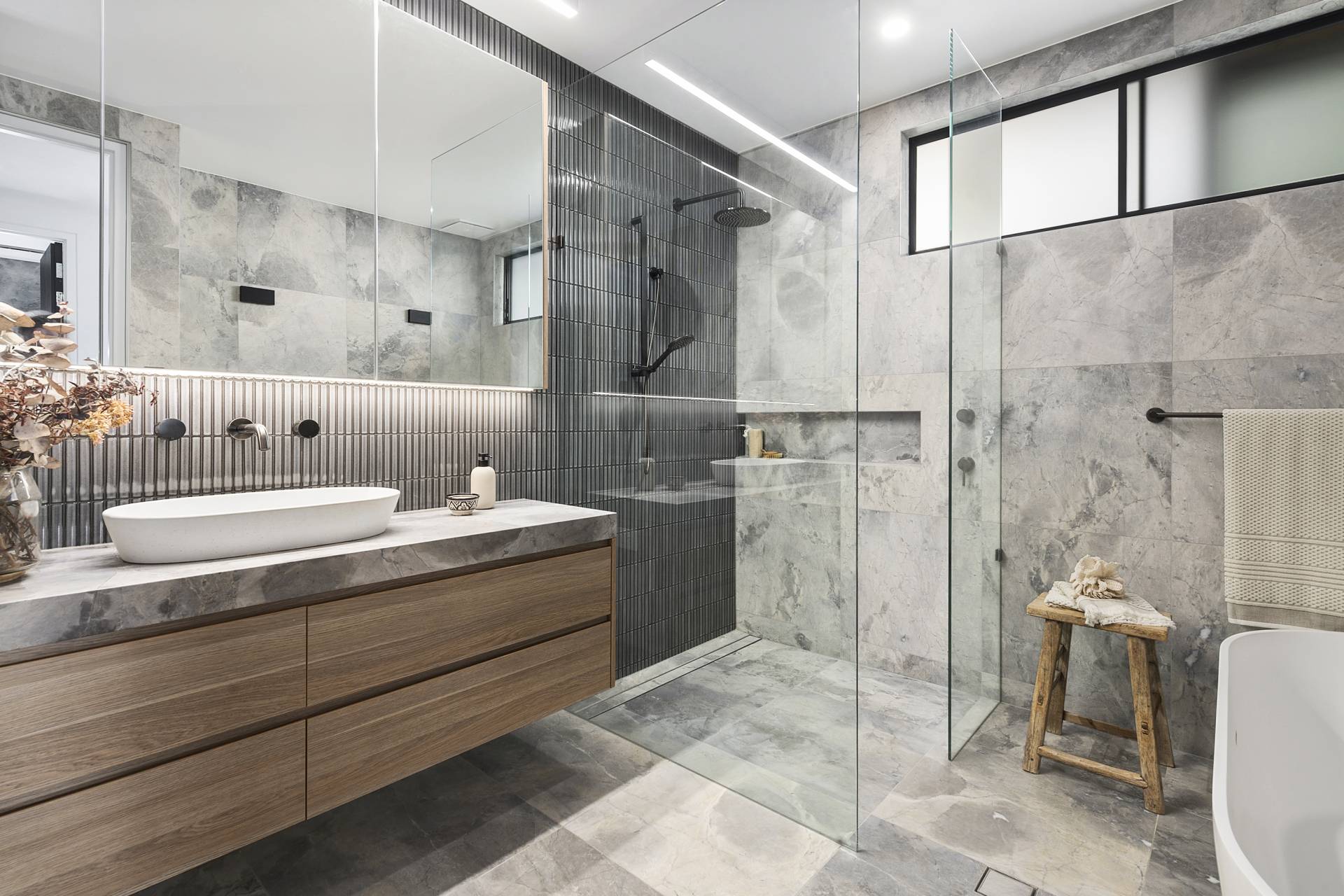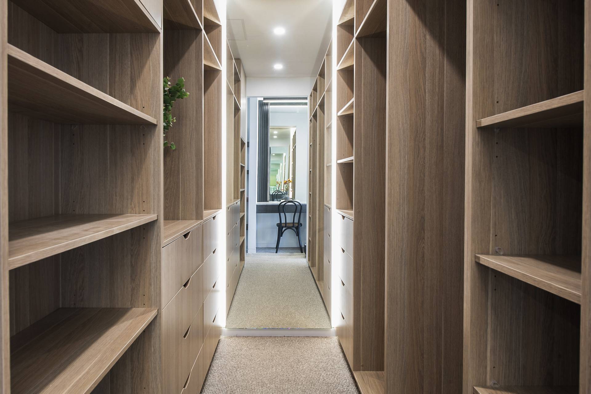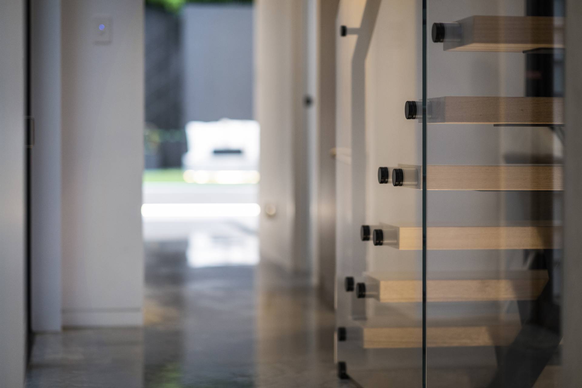 Stepping into the entry foyer, the glass-balustraded staircase with floating treads of Tasmanian Oak services all three levels and sets the tone of the interiors throughout – sculptural, airy and unashamedly contemporary. An elevator also services all three levels, ensuring the home is easily accessible for all ages and mobility levels.