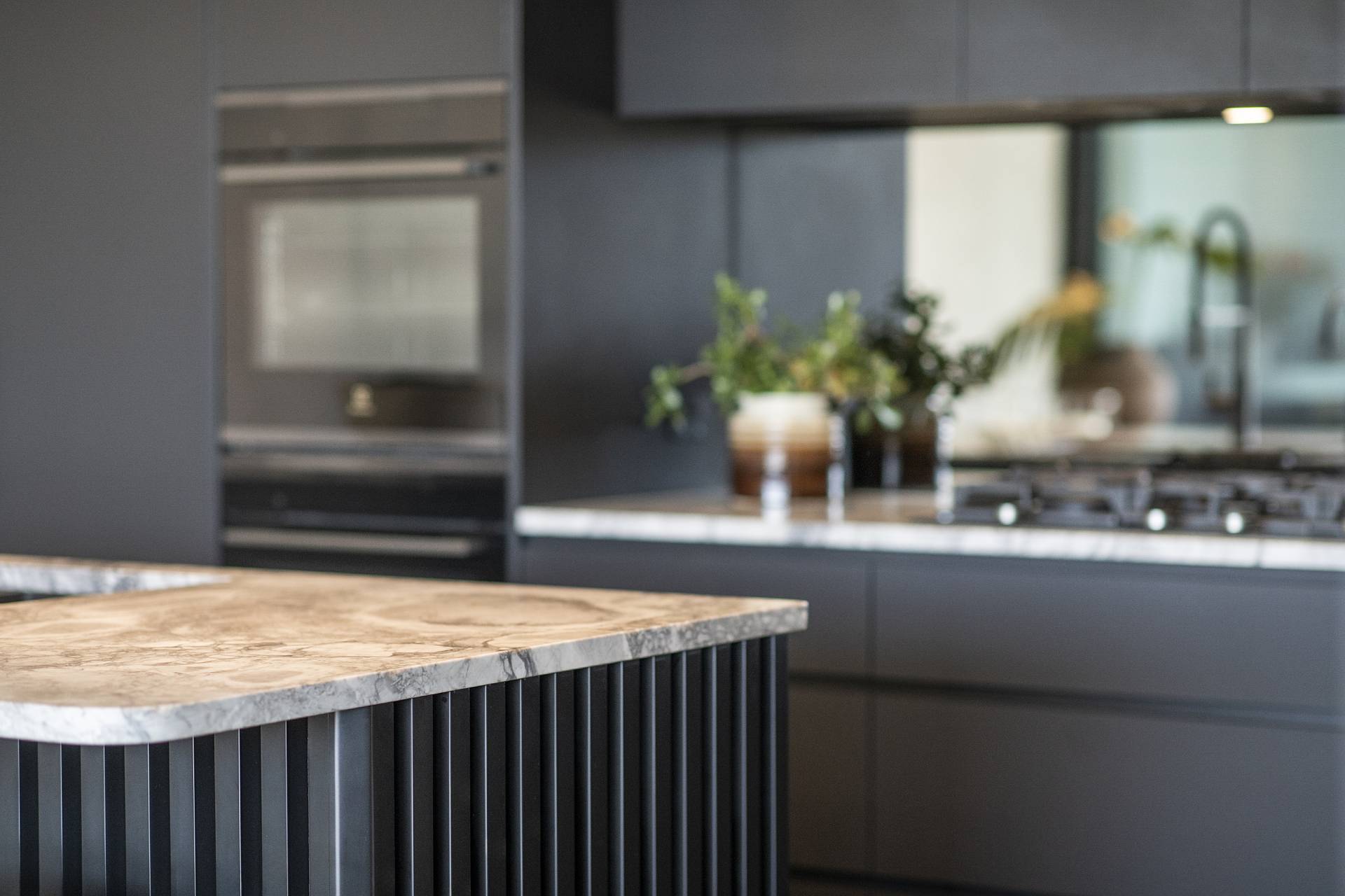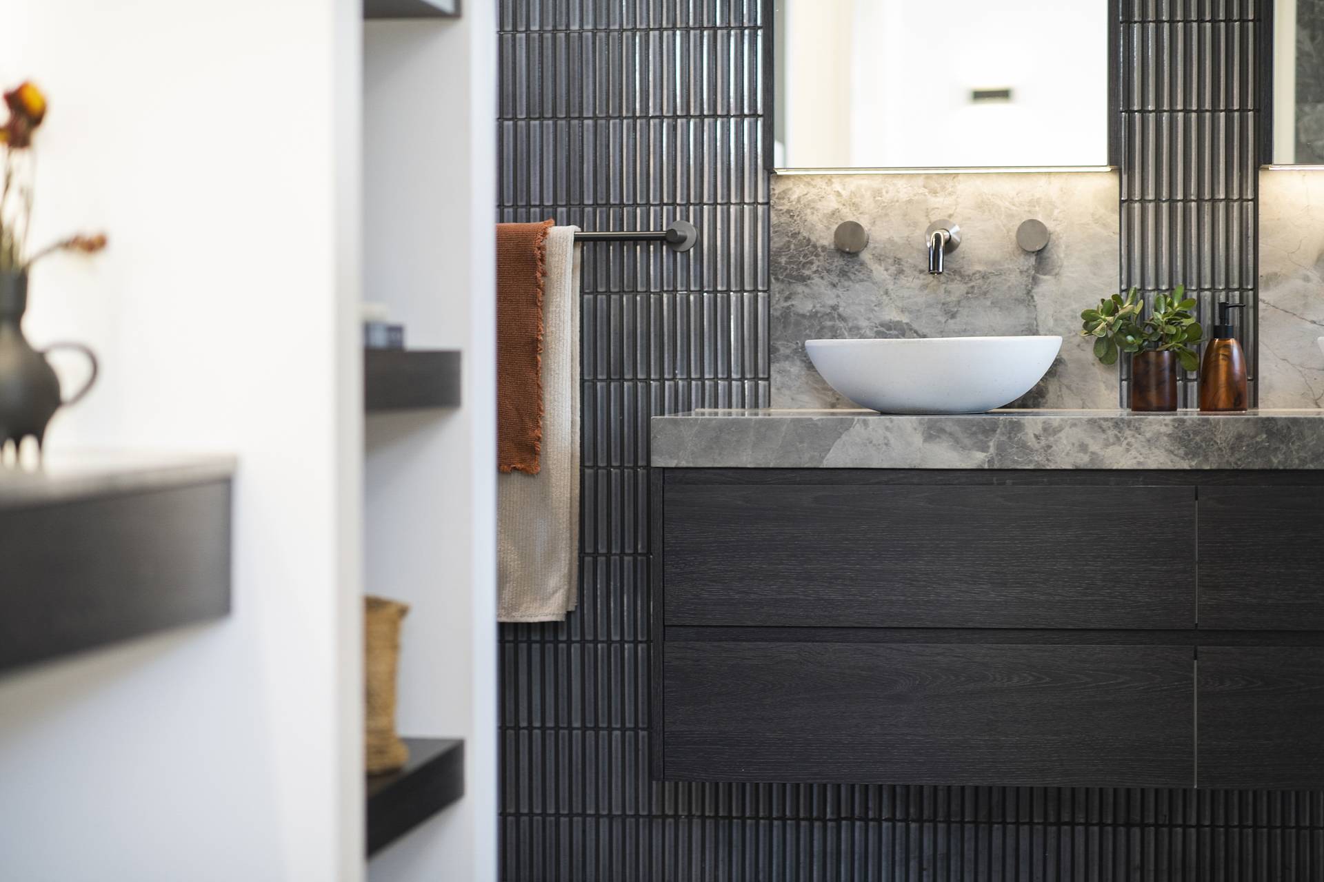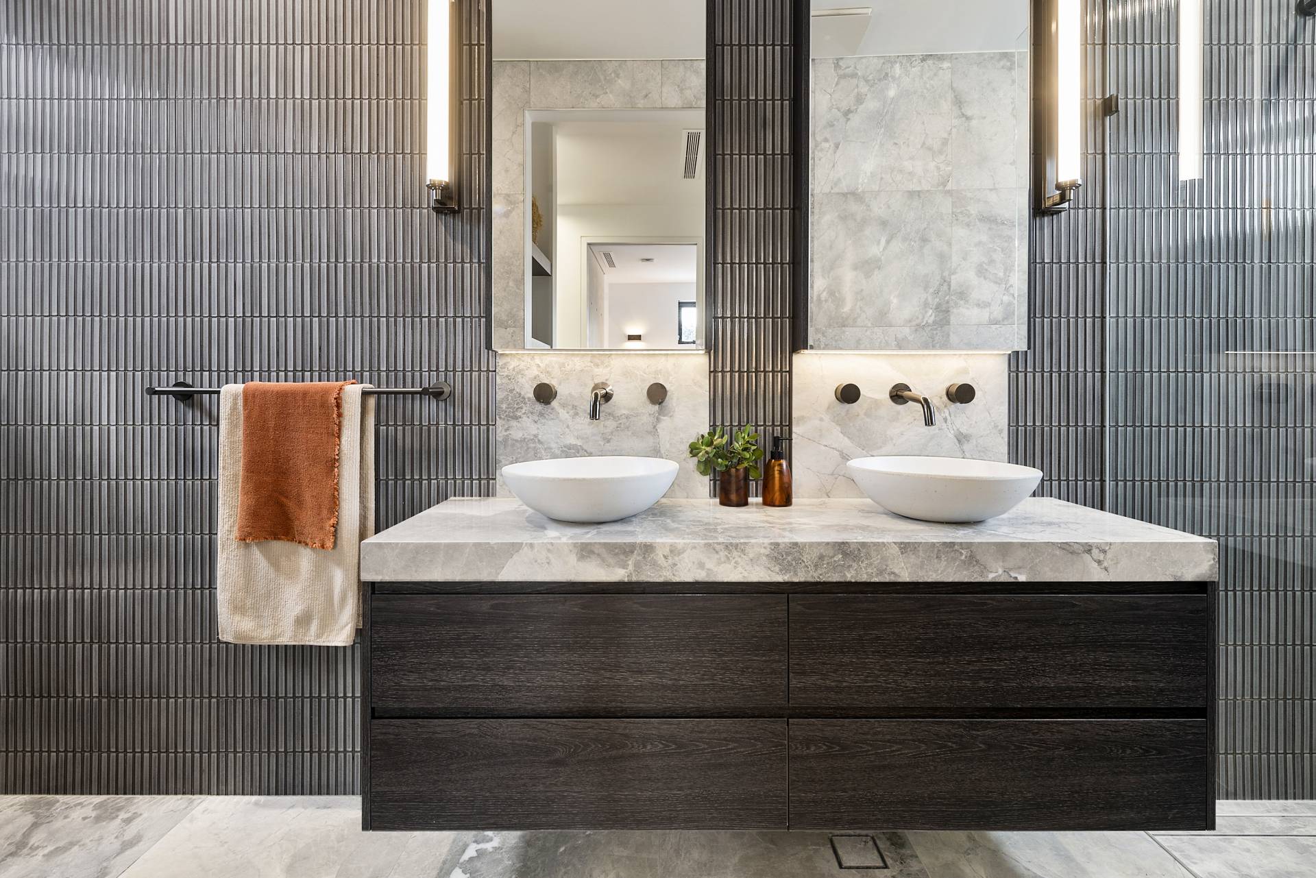 Stepping into the entry foyer, the glass-balustraded staircase with floating treads of Tasmanian Oak services all three levels and sets the tone of the interiors throughout – sculptural, airy and unashamedly contemporary. An elevator also services all three levels, ensuring the home is easily accessible for all ages and mobility levels.