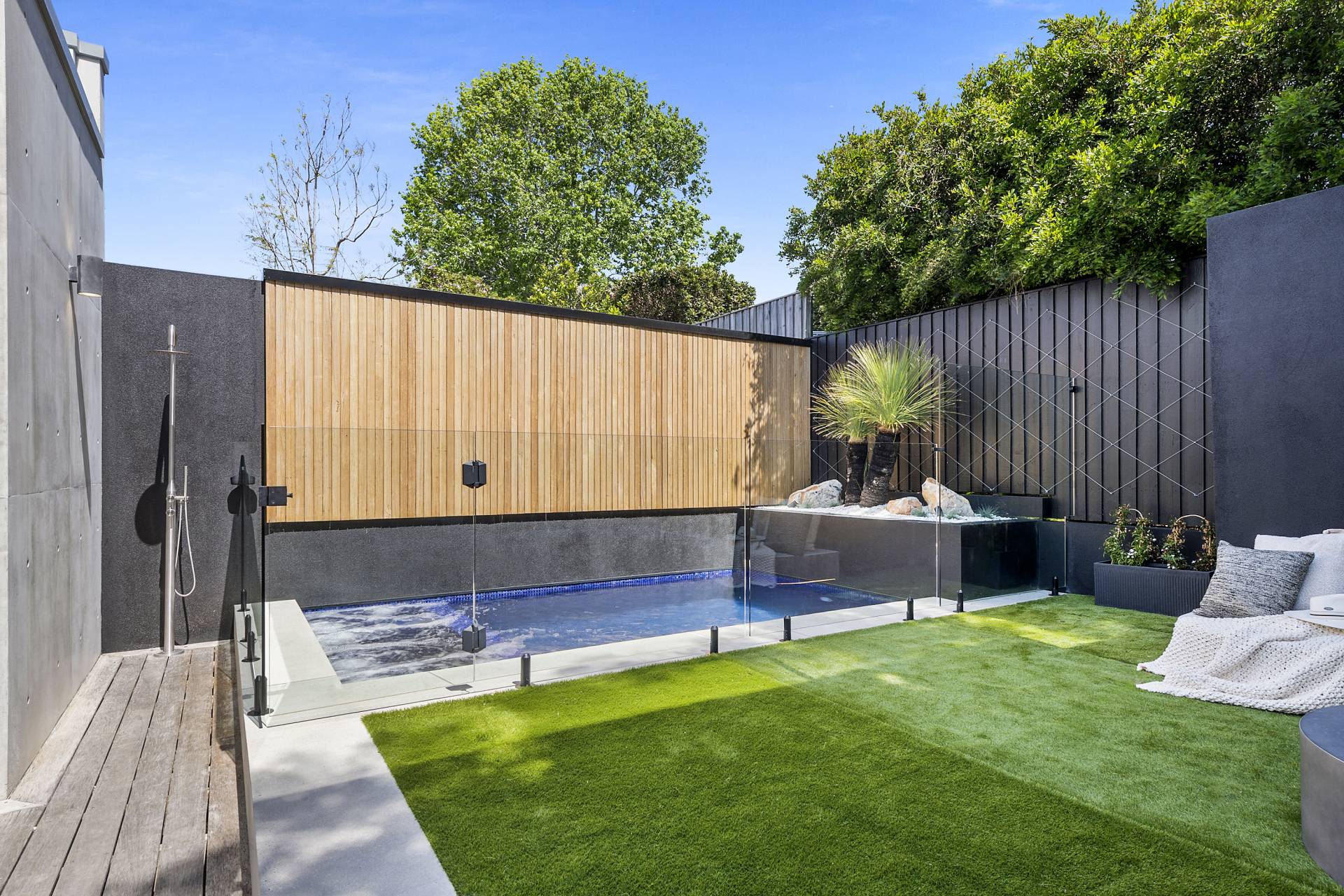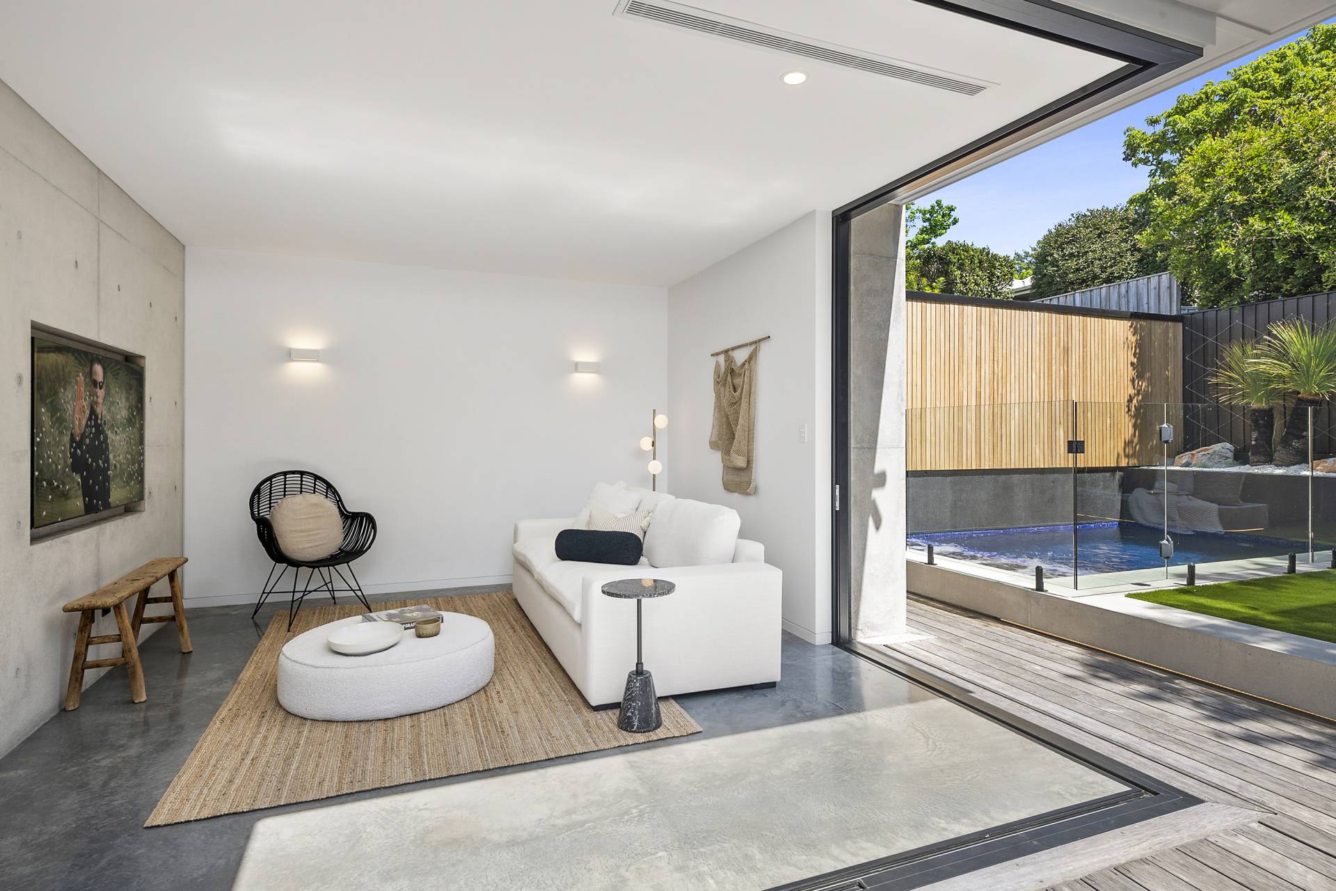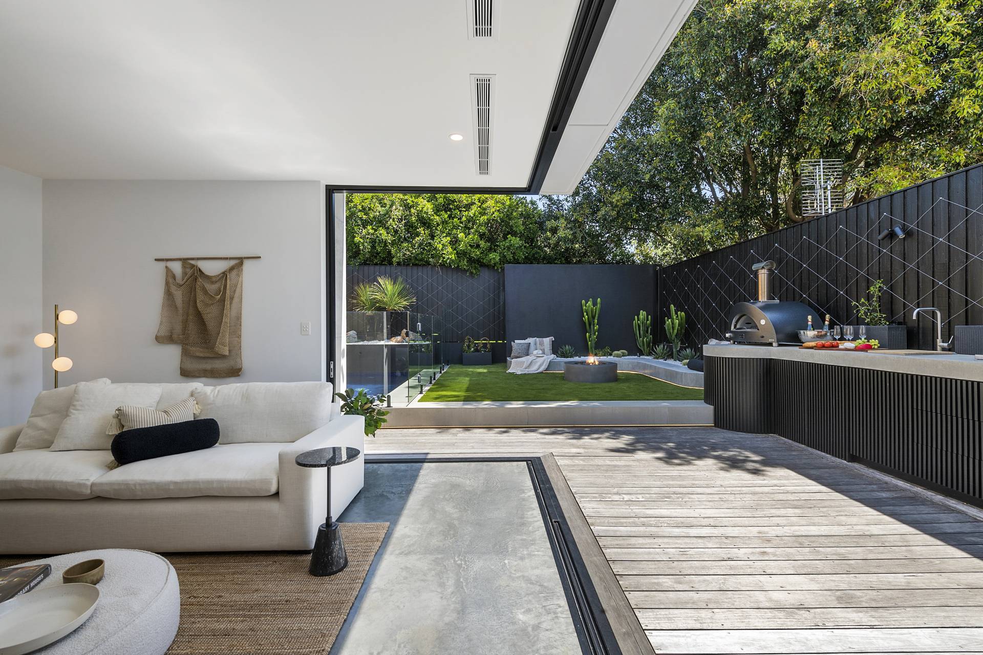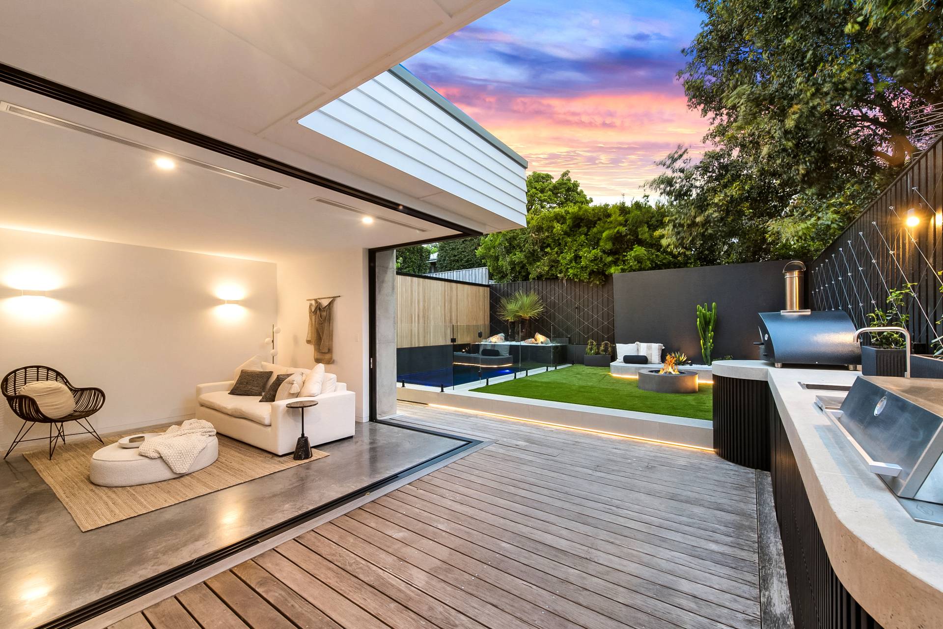 The family/TV/rumpus room features double-glazed stack sliding walls of glass that fully recess, opening the room to the rear garden, a bijou space designed for private relaxation as well as entertaining with a capital ‘E’. Featuring an outdoor kitchen complete with BBQ, pizza oven, wok burner, stainless steel integrated bar fridge, hot & cold water plumbed sink, all set into a custom-made concrete benchtop, while bespoke seating curves around an ethanol-fuel firepit; from here it’s an easy hop to the plunge pool and spa, heating for which can also be controlled remotely using your smartphone. A recessed LED landscape lighting system (also remotely controllable) and a hot and cold running shower complete the picture.