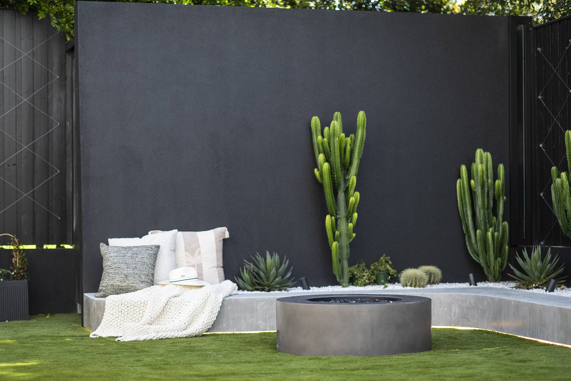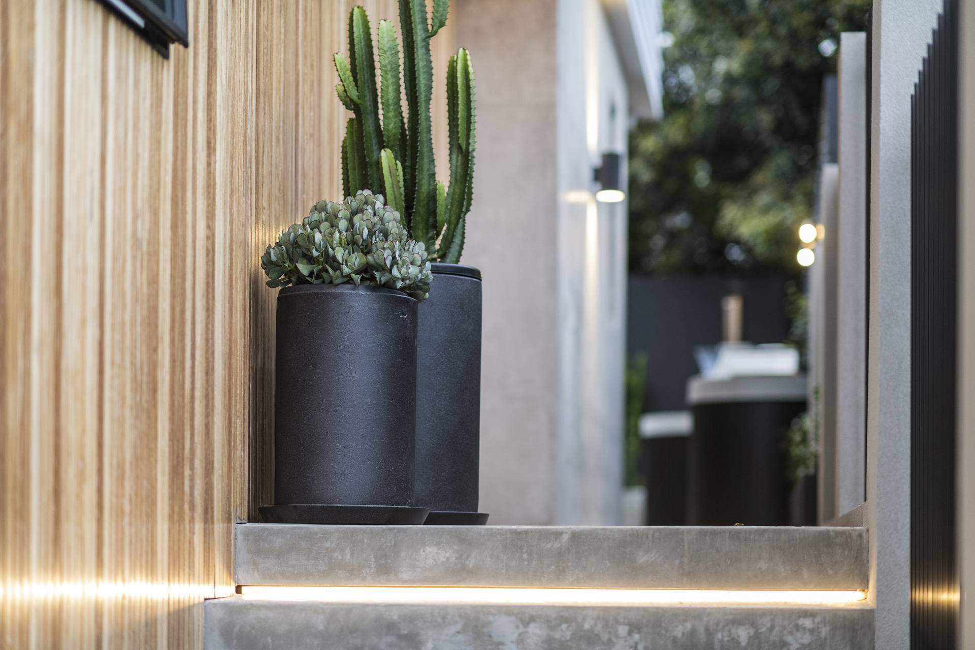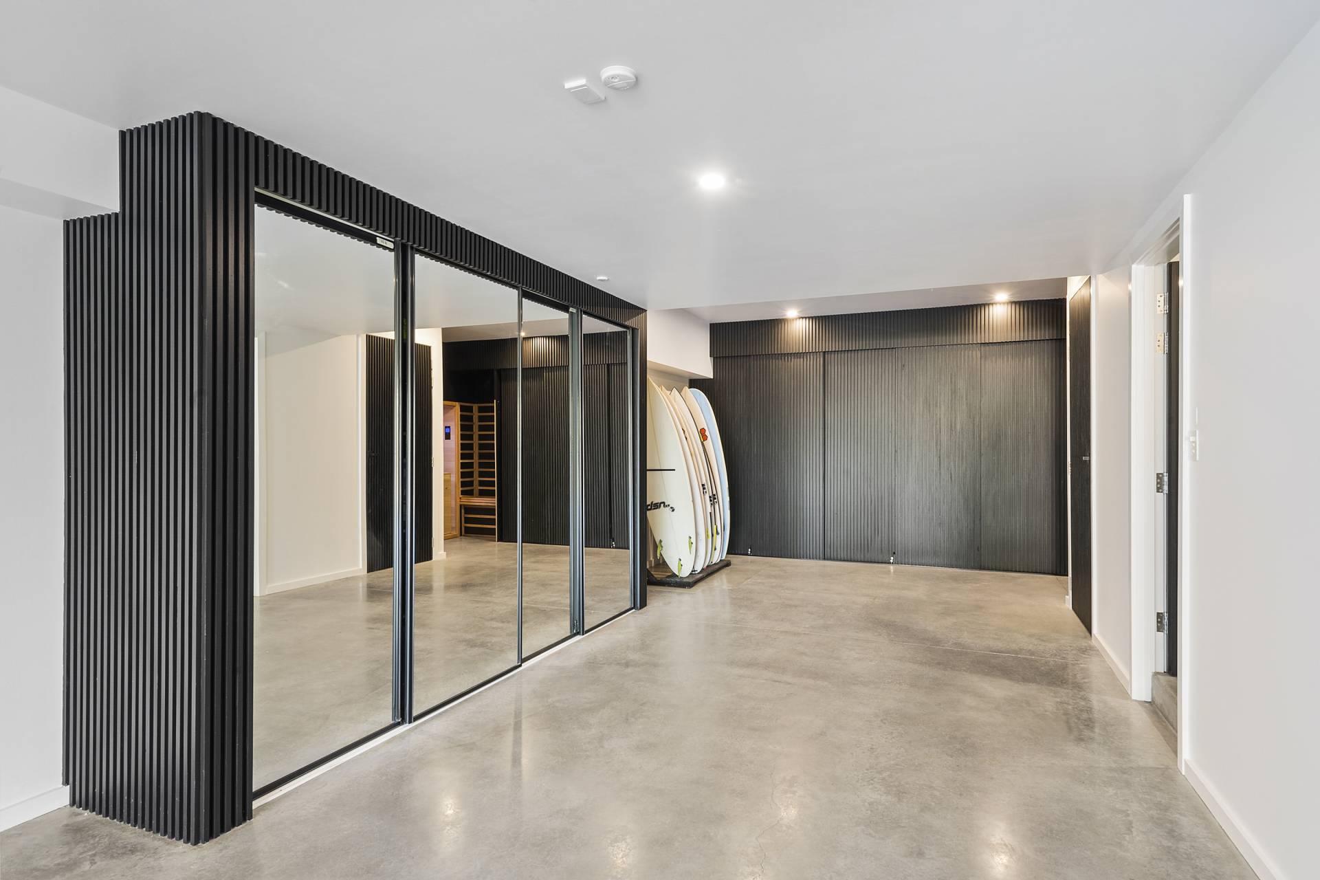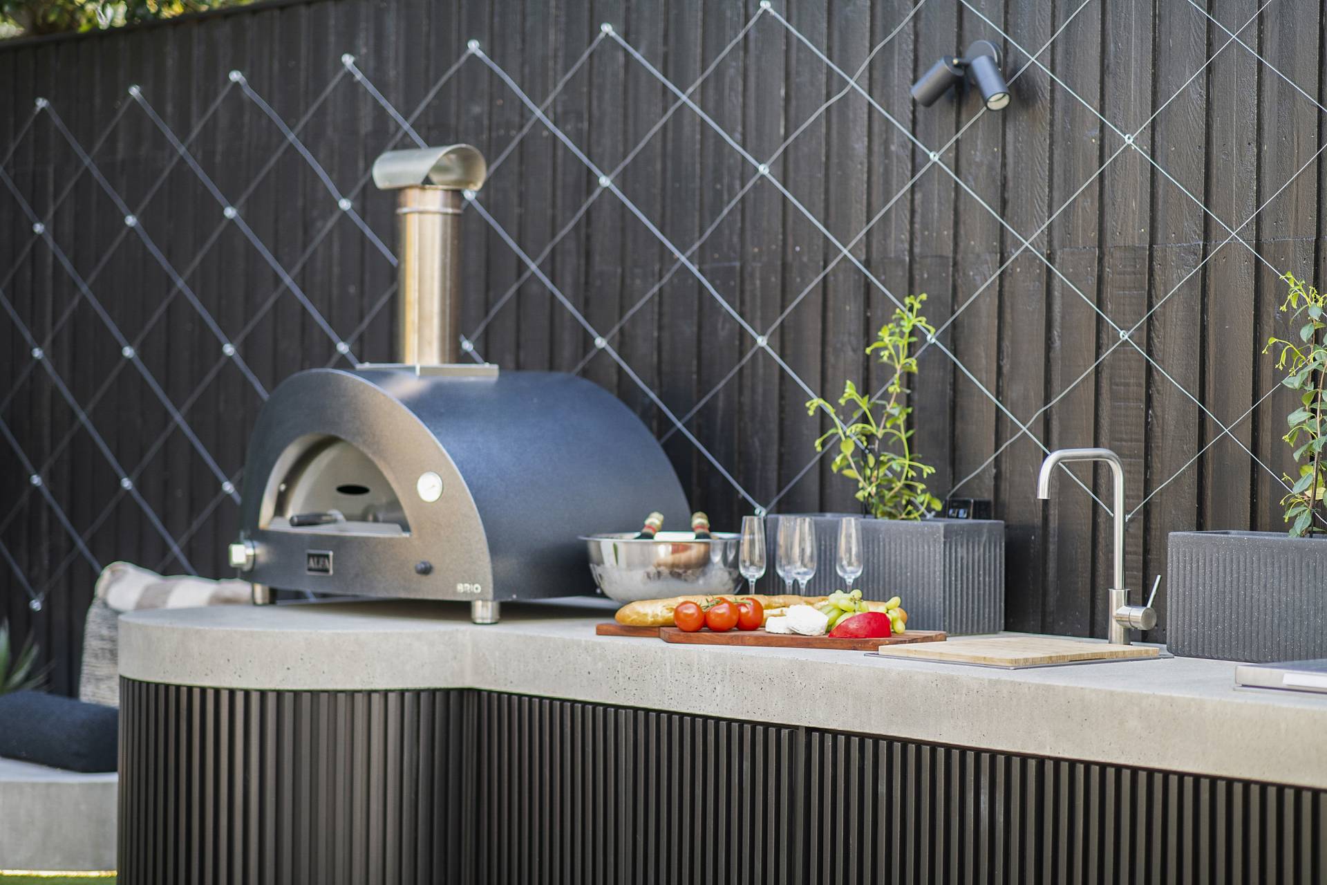 The family/TV/rumpus room features double-glazed stack sliding walls of glass that fully recess, opening the room to the rear garden, a bijou space designed for private relaxation as well as entertaining with a capital ‘E’. Featuring an outdoor kitchen complete with BBQ, pizza oven, wok burner, stainless steel integrated bar fridge, hot & cold water plumbed sink, all set into a custom-made concrete benchtop, while bespoke seating curves around an ethanol-fuel firepit; from here it’s an easy hop to the plunge pool and spa, heating for which can also be controlled remotely using your smartphone. A recessed LED landscape lighting system (also remotely controllable) and a hot and cold running shower complete the picture.