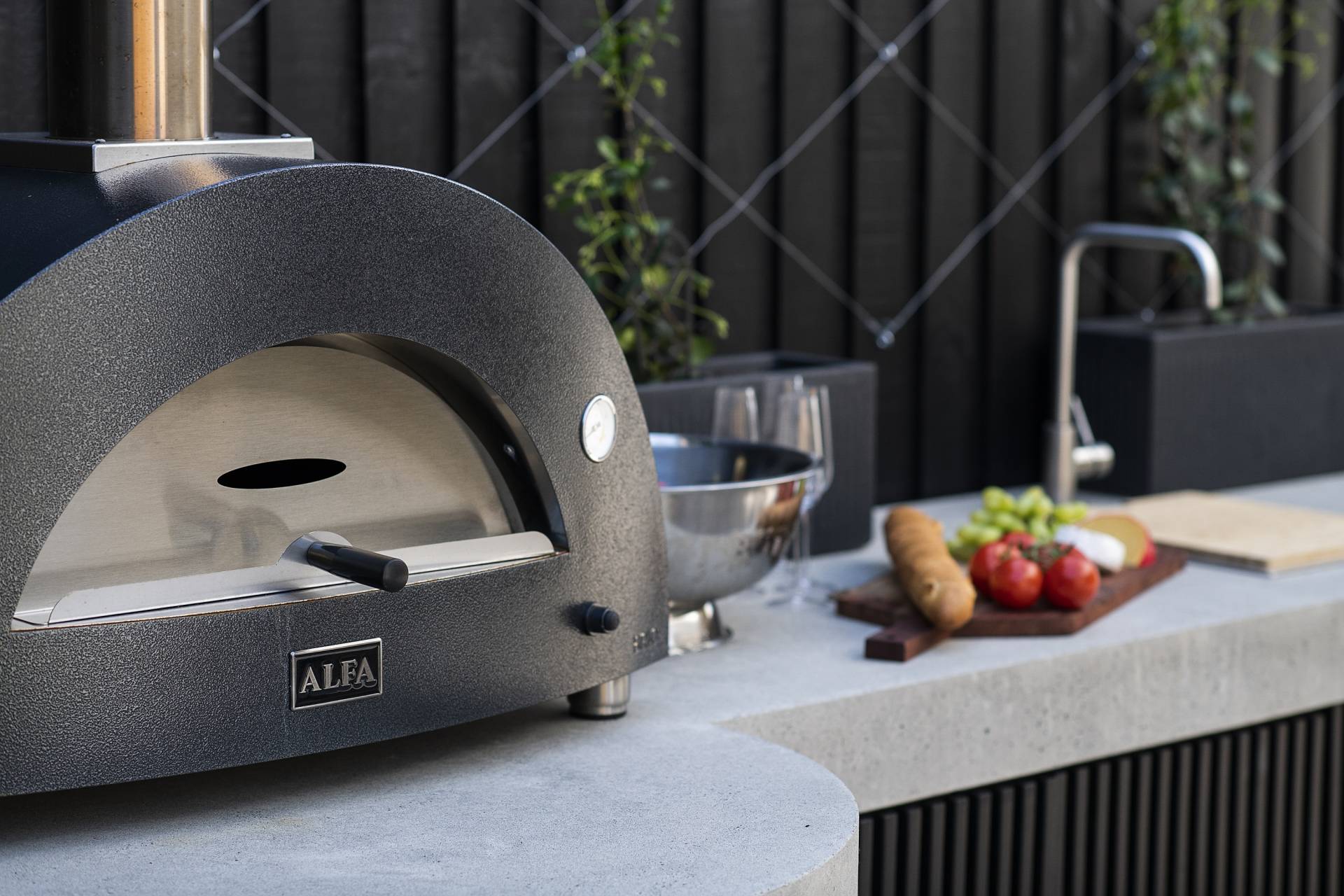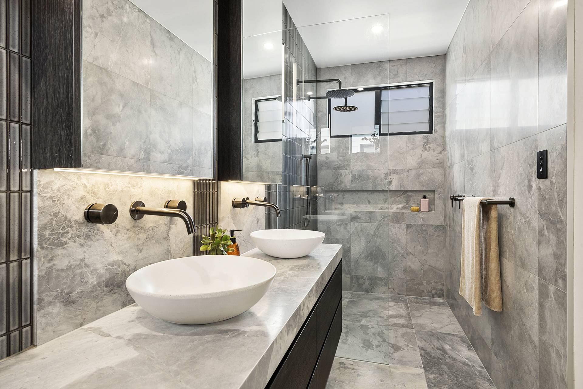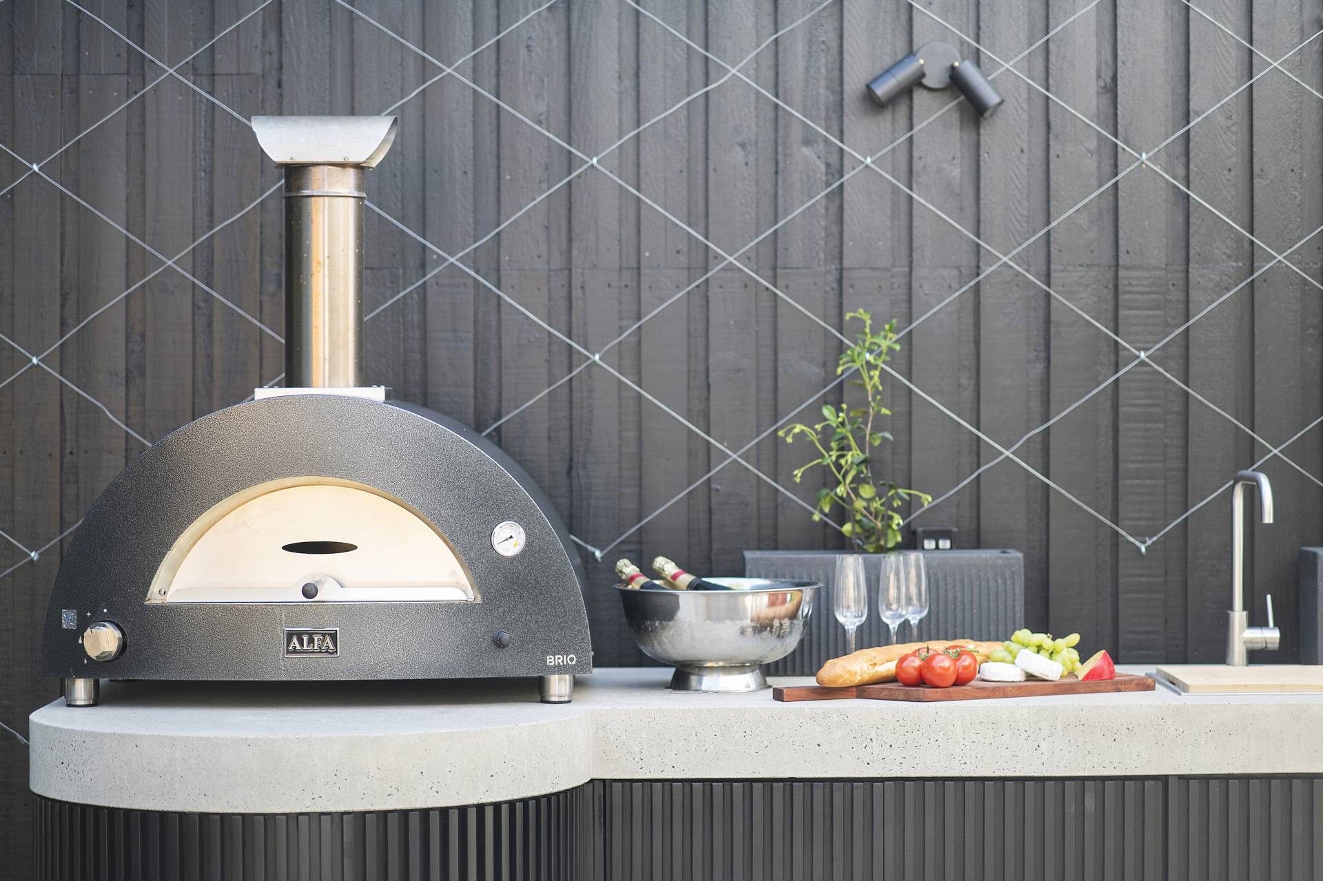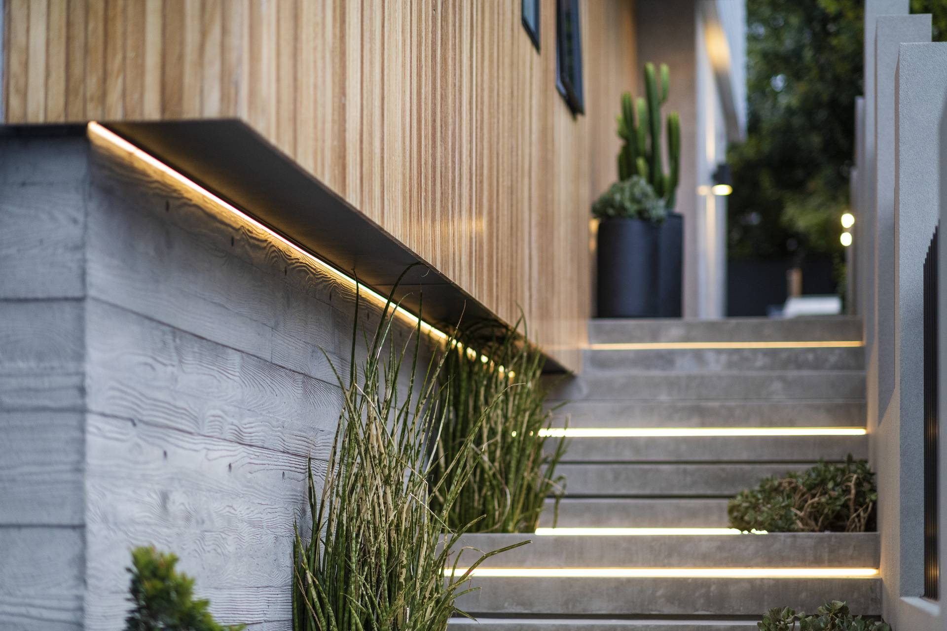 The family/TV/rumpus room features double-glazed stack sliding walls of glass that fully recess, opening the room to the rear garden, a bijou space designed for private relaxation as well as entertaining with a capital ‘E’. Featuring an outdoor kitchen complete with BBQ, pizza oven, wok burner, stainless steel integrated bar fridge, hot & cold water plumbed sink, all set into a custom-made concrete benchtop, while bespoke seating curves around an ethanol-fuel firepit; from here it’s an easy hop to the plunge pool and spa, heating for which can also be controlled remotely using your smartphone. A recessed LED landscape lighting system (also remotely controllable) and a hot and cold running shower complete the picture.