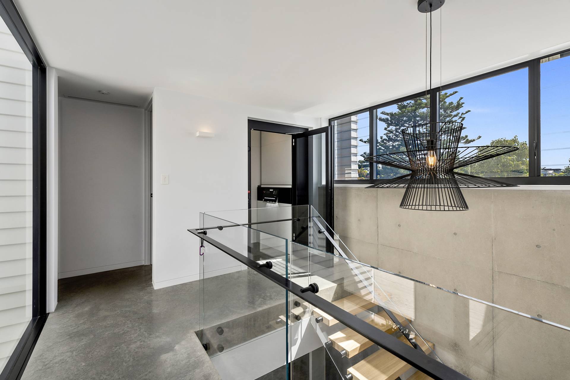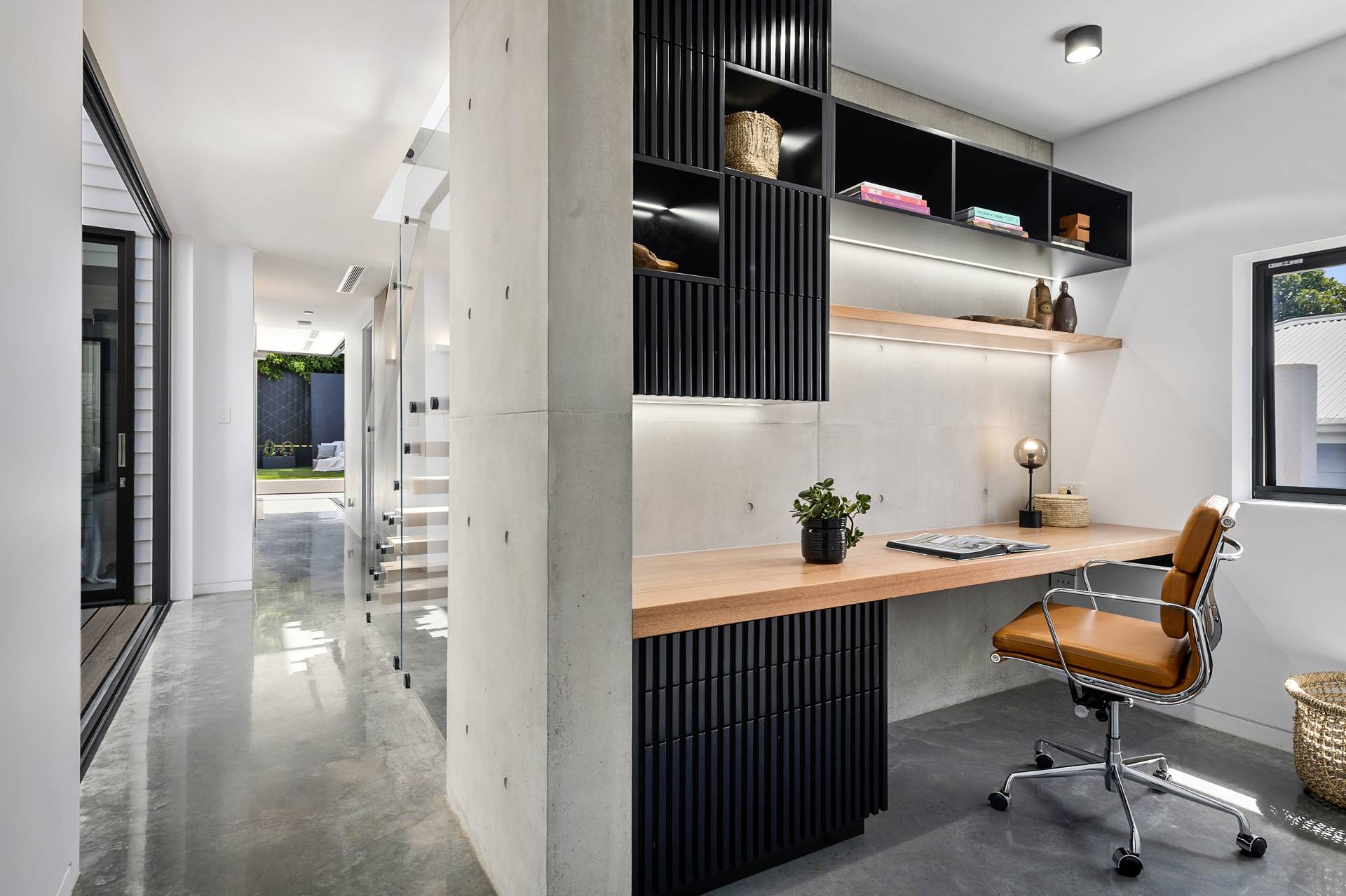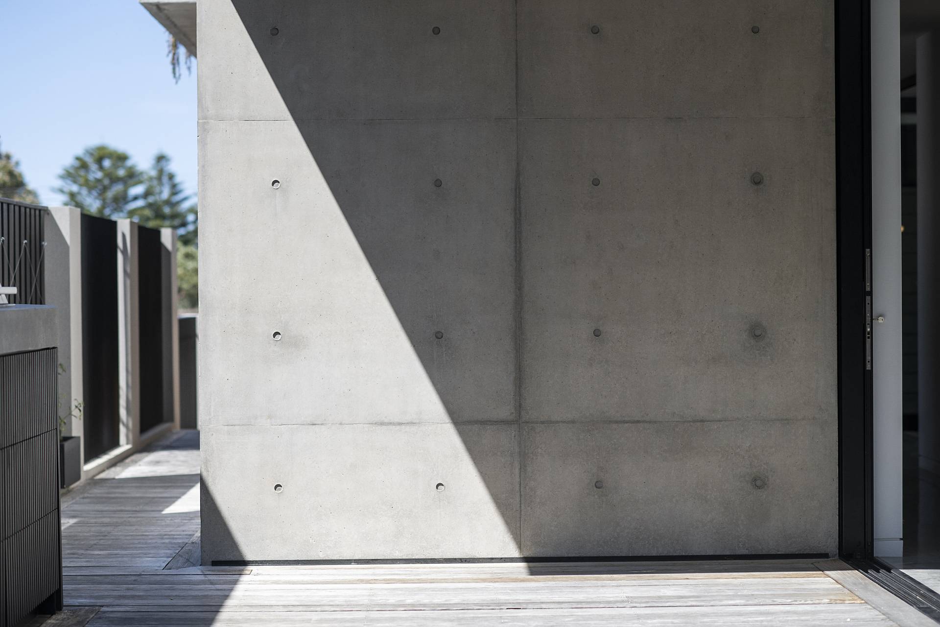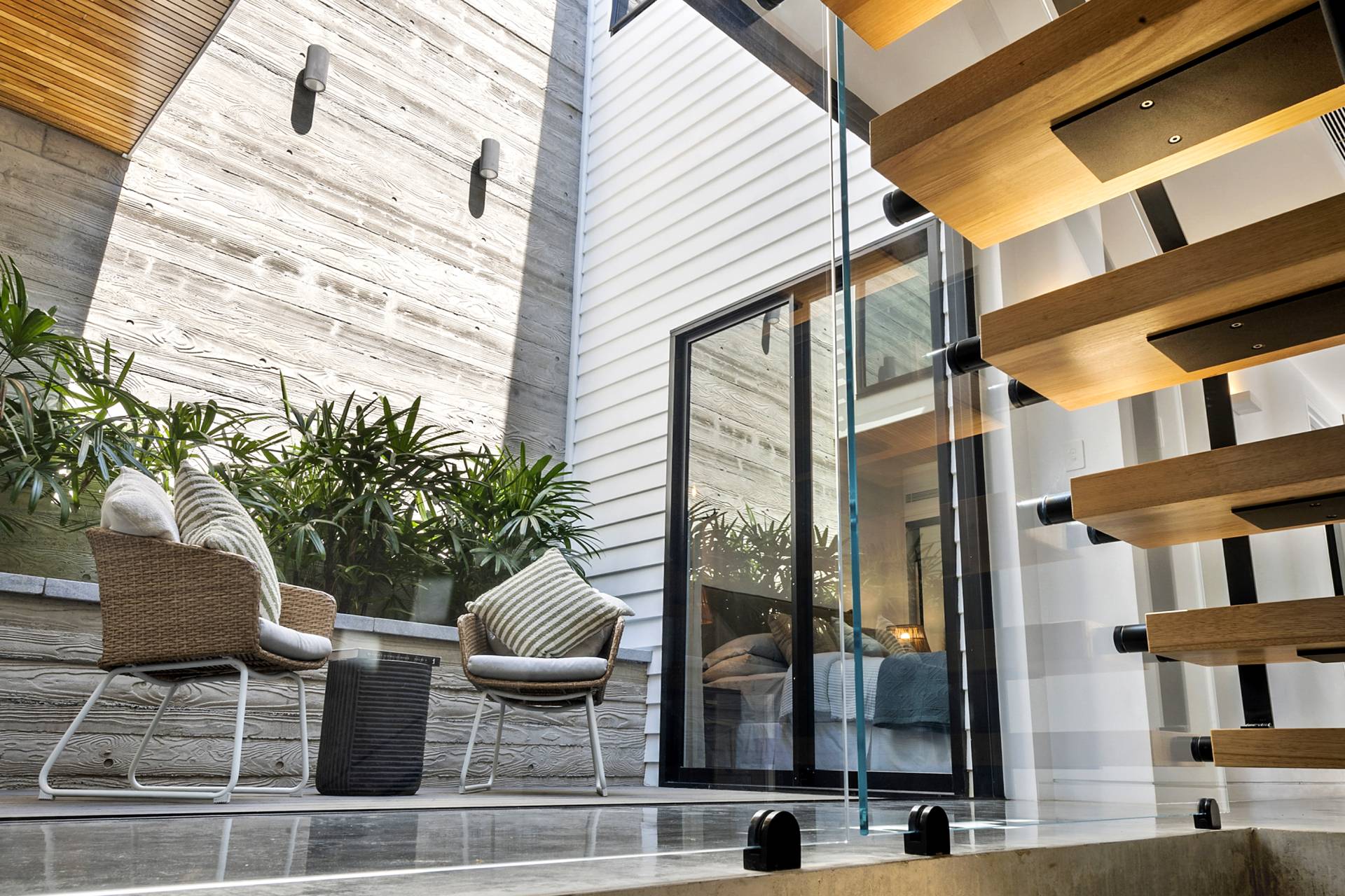 On this level, burnished concrete floors - with electric underfloor heating throughout complemented by reverse cycle air conditioning - lead to three double bedrooms, a laundry, powder room, office/study and a family/rumpus room, a floor-to-ceiling wall of glass in the entrance foyer providing a view of the central courtyard and filling the space with natural light; the various rooms are laid out around the courtyard with its 7-metre-high feature board form concrete wall, which acts as an oversized lightwell, bringing the outdoors into the very heart of the residence. Two of the double bedrooms situated at the front of the home share a glass-railed balcony that spans the width of the house, the third bedroom opening onto the courtyard.