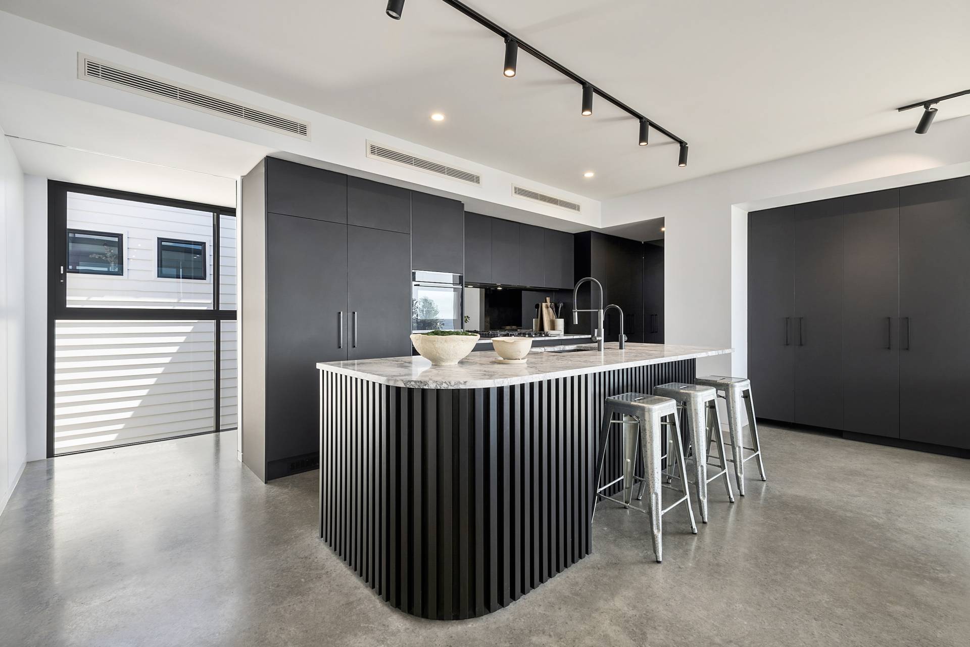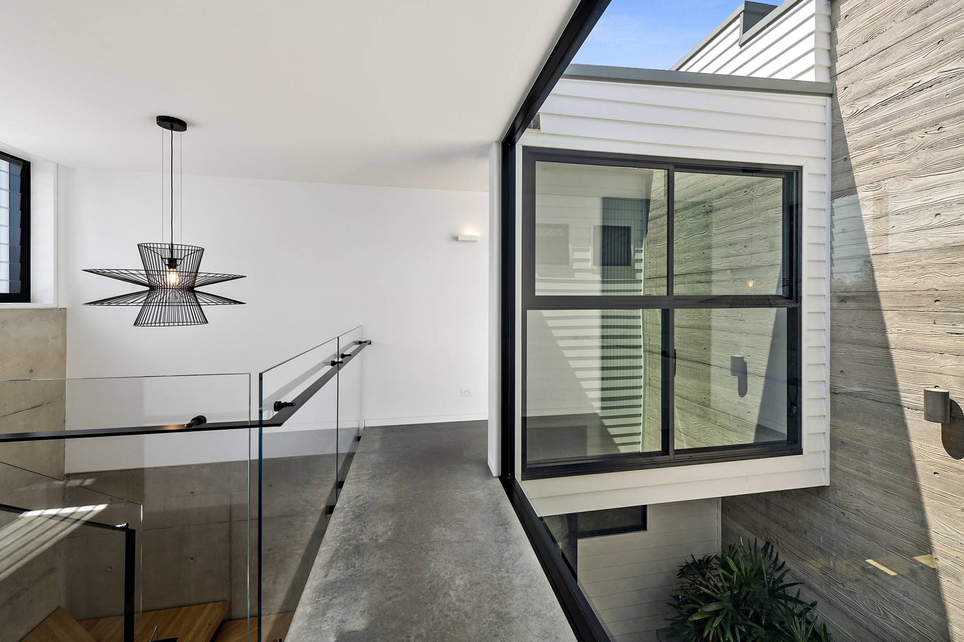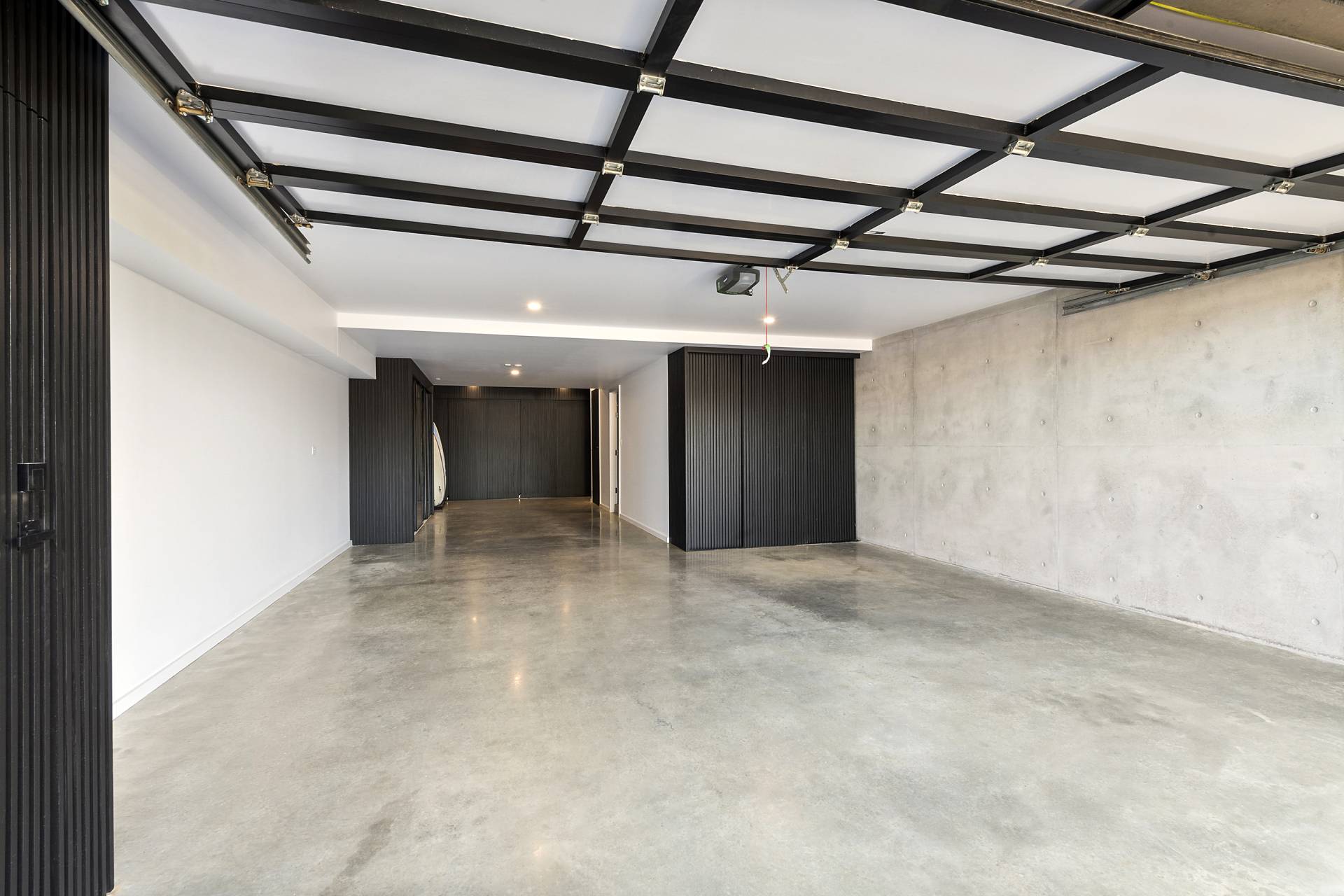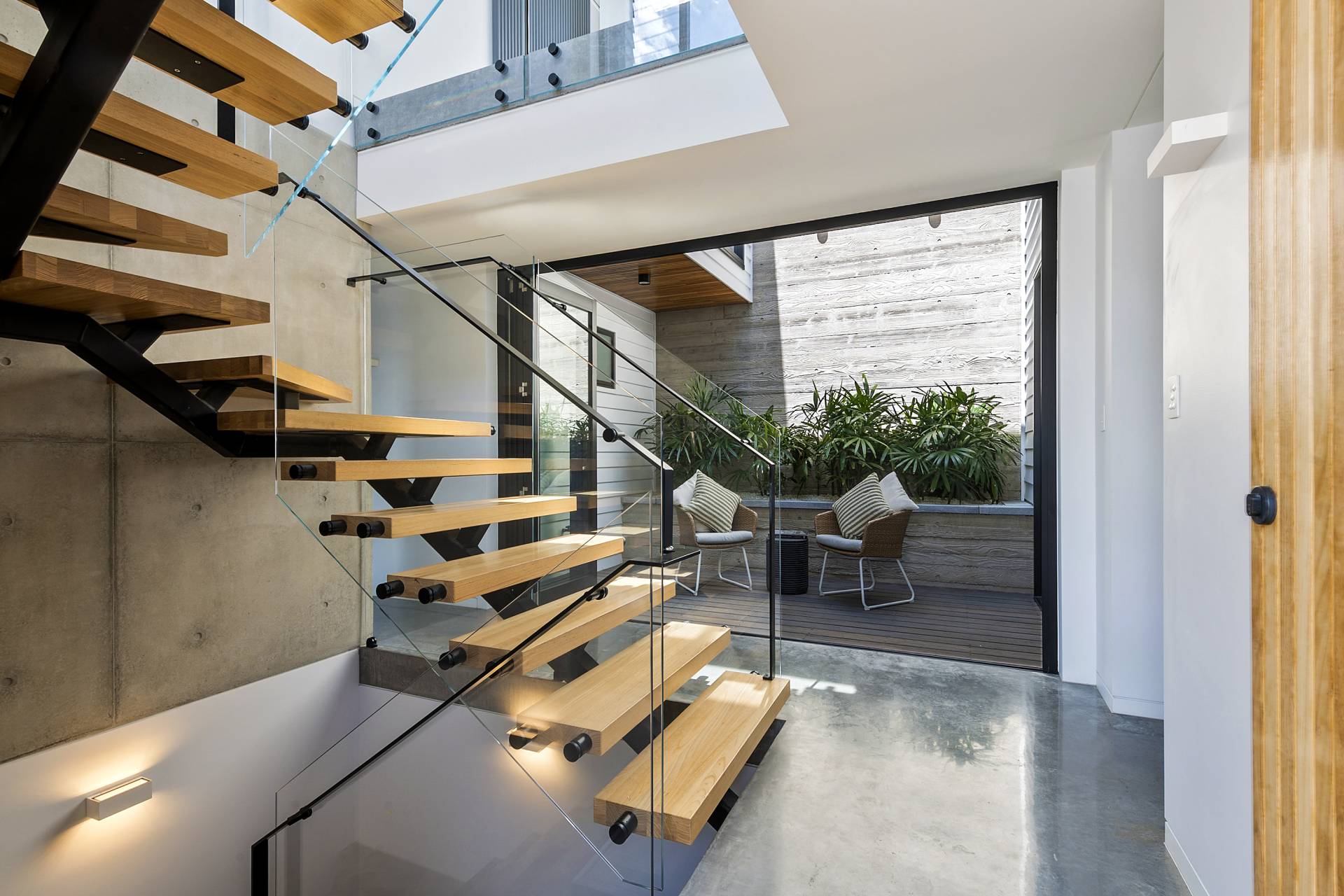 On this level, burnished concrete floors - with electric underfloor heating throughout complemented by reverse cycle air conditioning - lead to three double bedrooms, a laundry, powder room, office/study and a family/rumpus room, a floor-to-ceiling wall of glass in the entrance foyer providing a view of the central courtyard and filling the space with natural light; the various rooms are laid out around the courtyard with its 7-metre-high feature board form concrete wall, which acts as an oversized lightwell, bringing the outdoors into the very heart of the residence. Two of the double bedrooms situated at the front of the home share a glass-railed balcony that spans the width of the house, the third bedroom opening onto the courtyard.