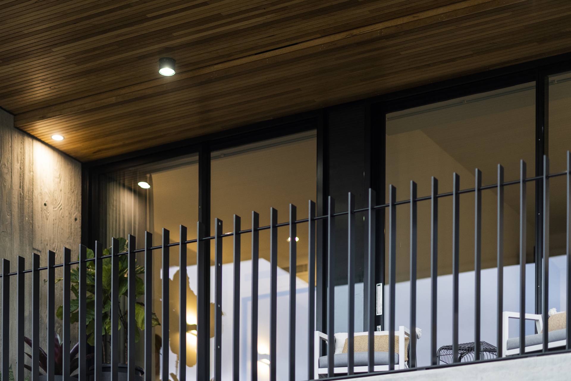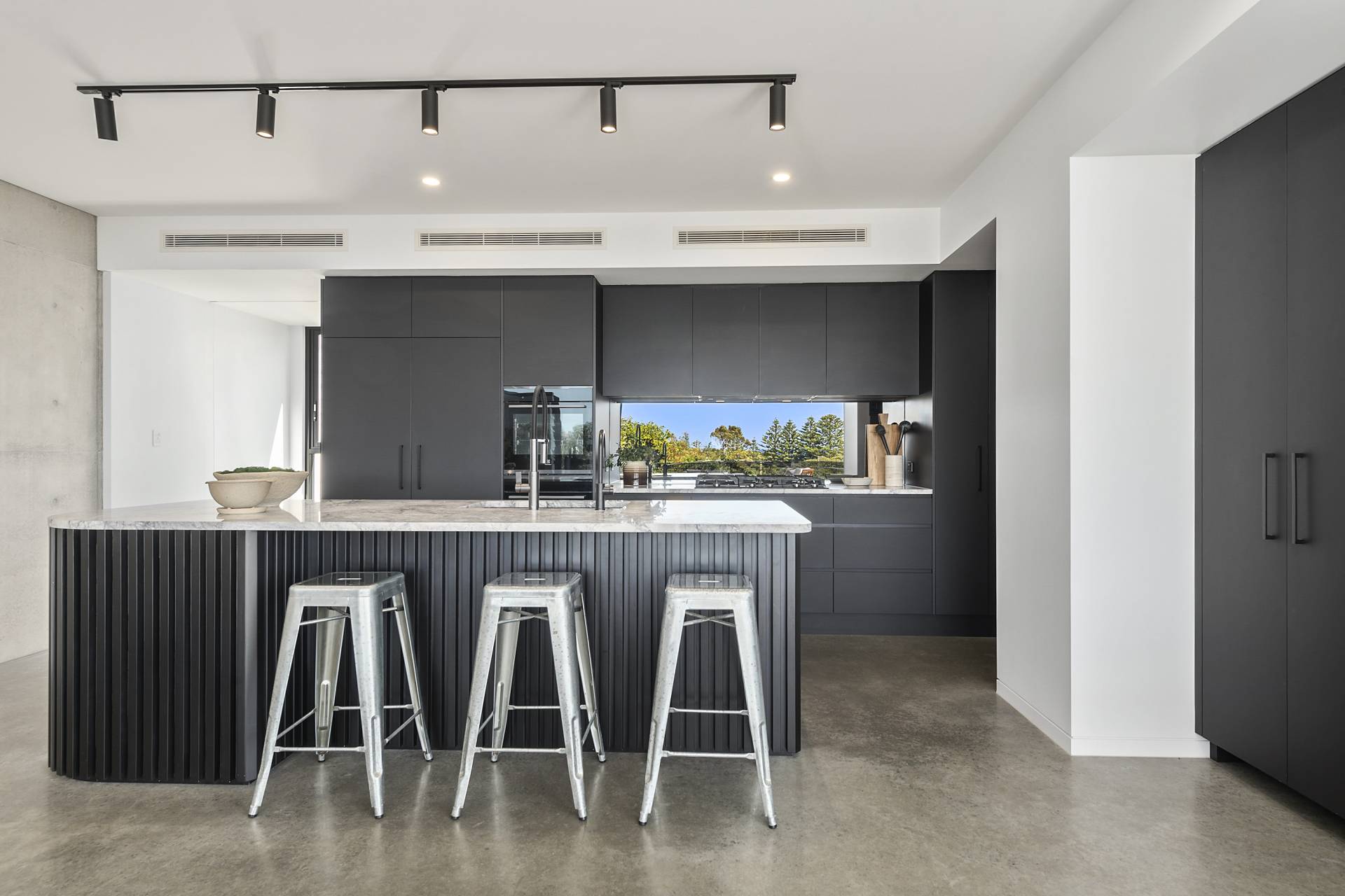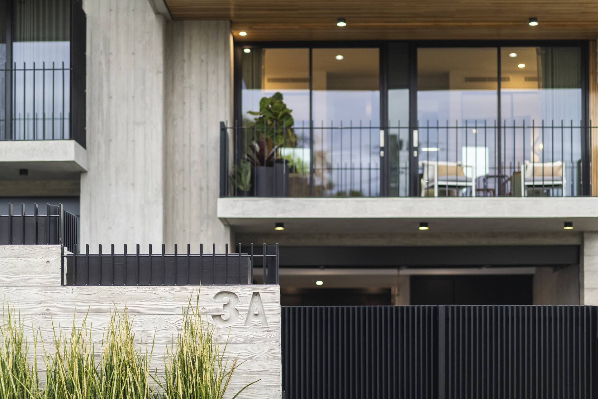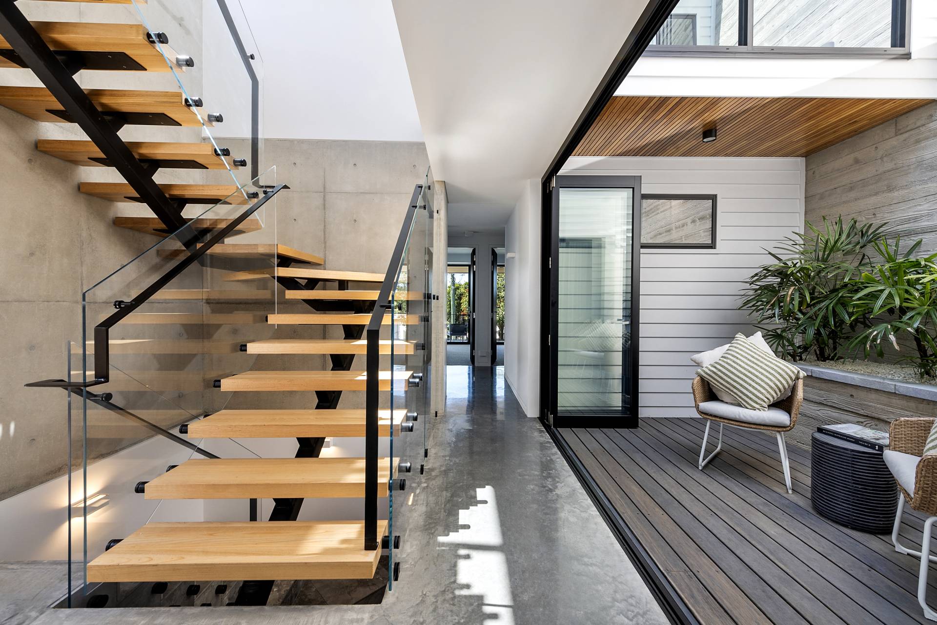 On this level, burnished concrete floors - with electric underfloor heating throughout complemented by reverse cycle air conditioning - lead to three double bedrooms, a laundry, powder room, office/study and a family/rumpus room, a floor-to-ceiling wall of glass in the entrance foyer providing a view of the central courtyard and filling the space with natural light; the various rooms are laid out around the courtyard with its 7-metre-high feature board form concrete wall, which acts as an oversized lightwell, bringing the outdoors into the very heart of the residence. Two of the double bedrooms situated at the front of the home share a glass-railed balcony that spans the width of the house, the third bedroom opening onto the courtyard.