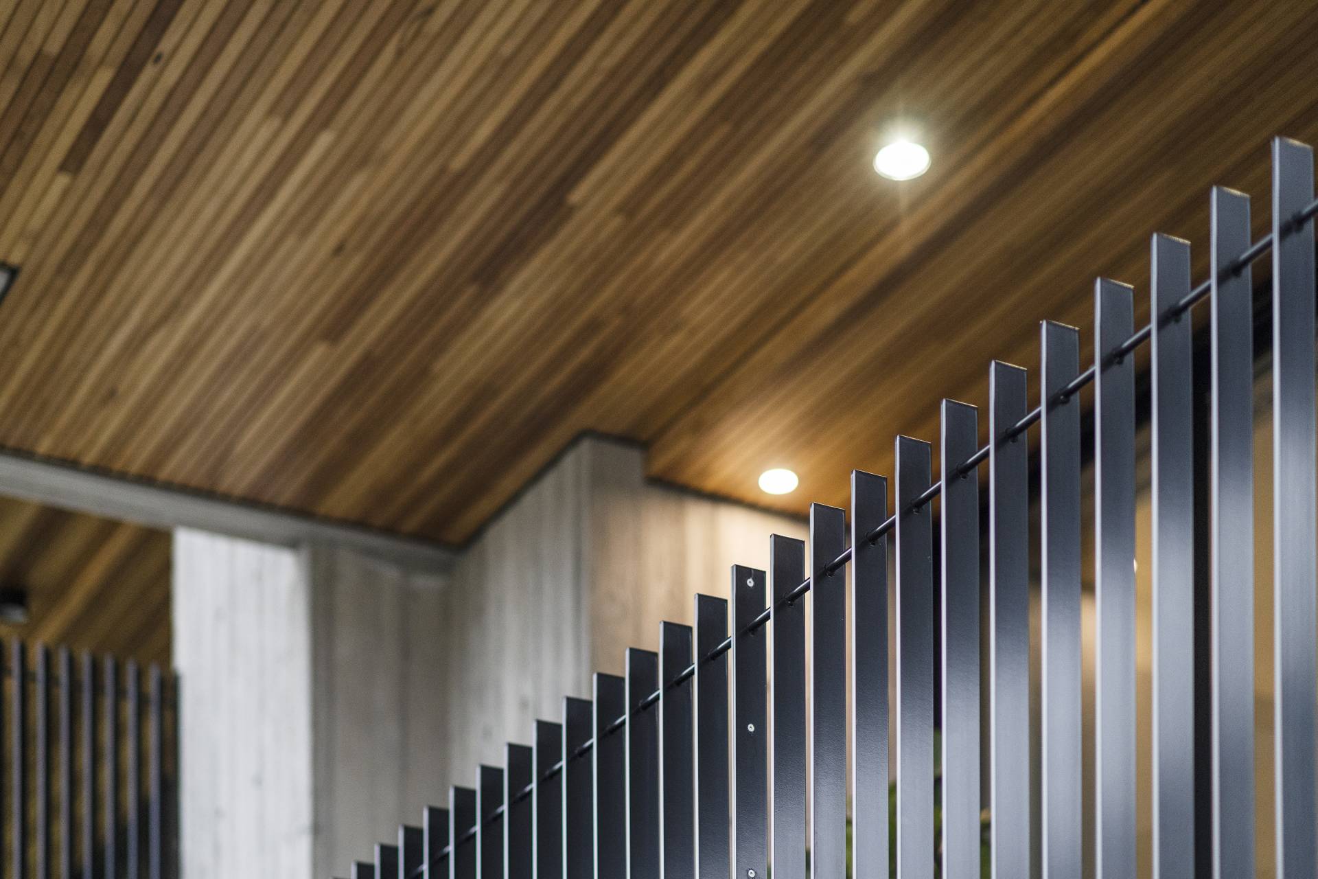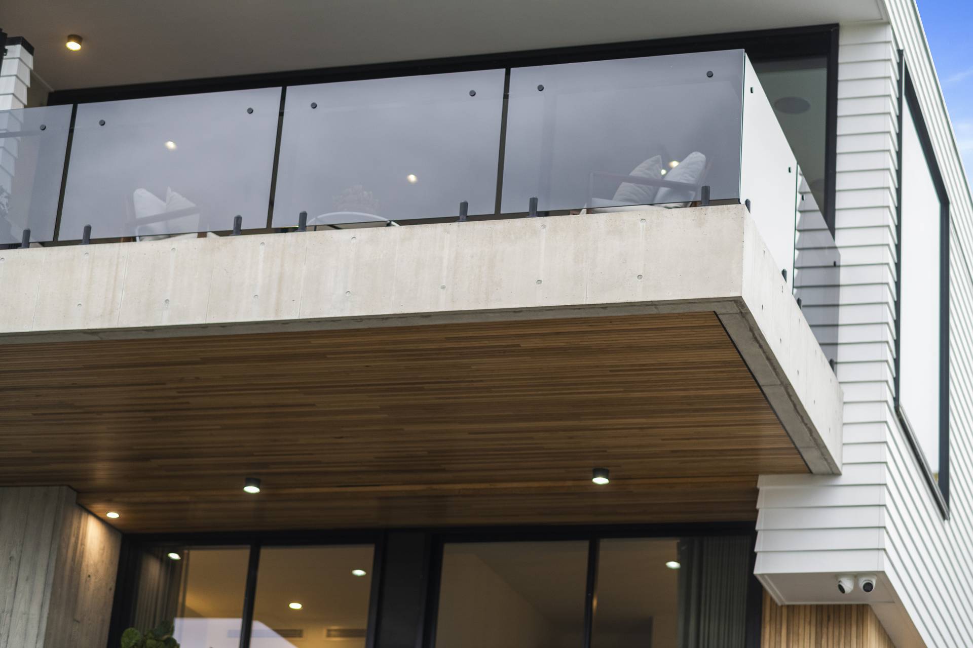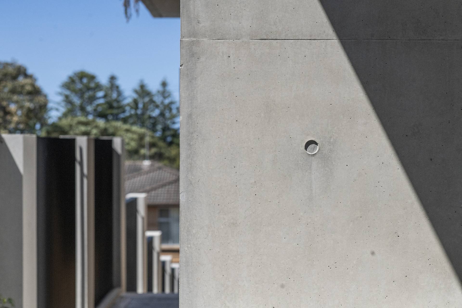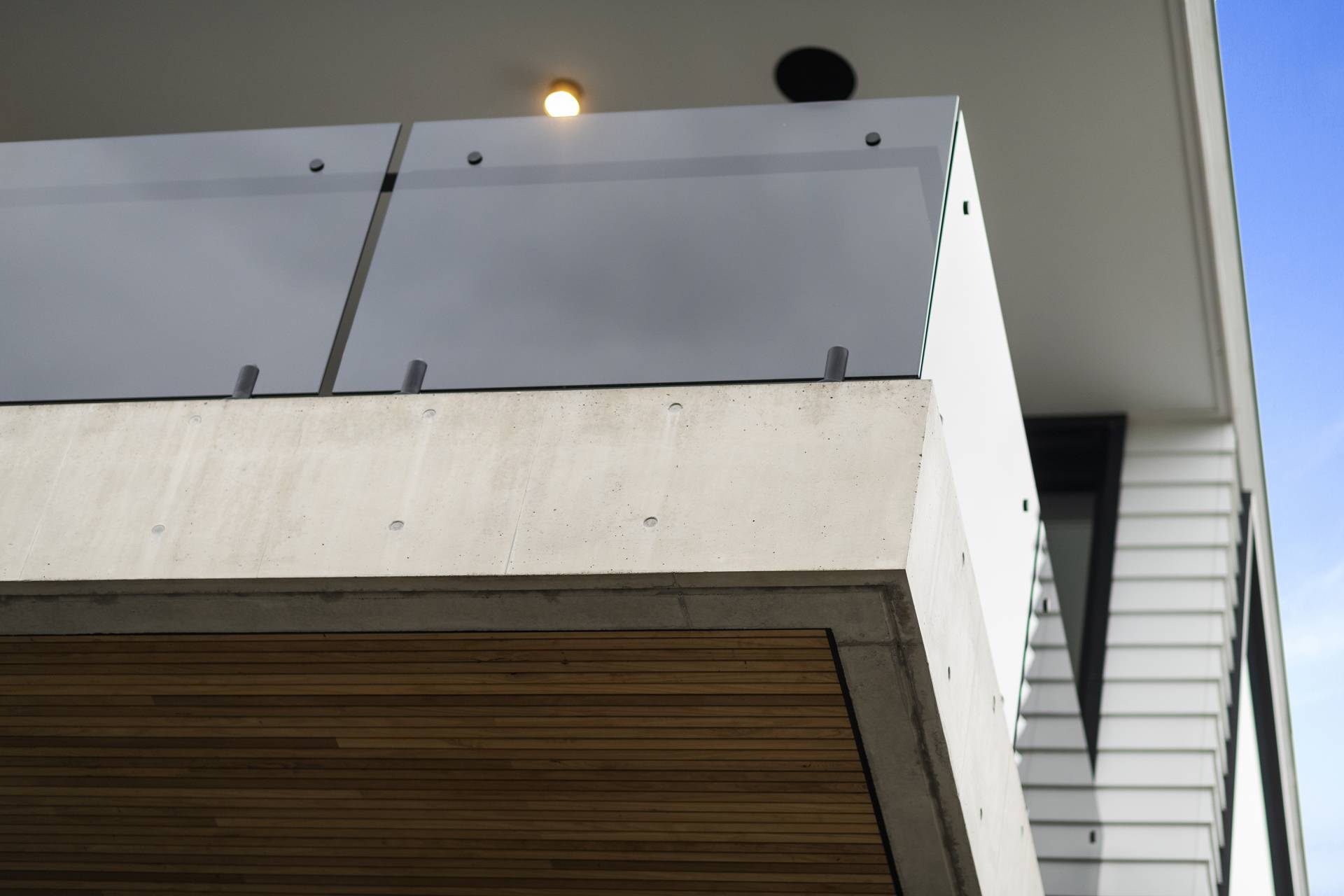 On this level, burnished concrete floors - with electric underfloor heating throughout complemented by reverse cycle air conditioning - lead to three double bedrooms, a laundry, powder room, office/study and a family/rumpus room, a floor-to-ceiling wall of glass in the entrance foyer providing a view of the central courtyard and filling the space with natural light; the various rooms are laid out around the courtyard with its 7-metre-high feature board form concrete wall, which acts as an oversized lightwell, bringing the outdoors into the very heart of the residence. Two of the double bedrooms situated at the front of the home share a glass-railed balcony that spans the width of the house, the third bedroom opening onto the courtyard.