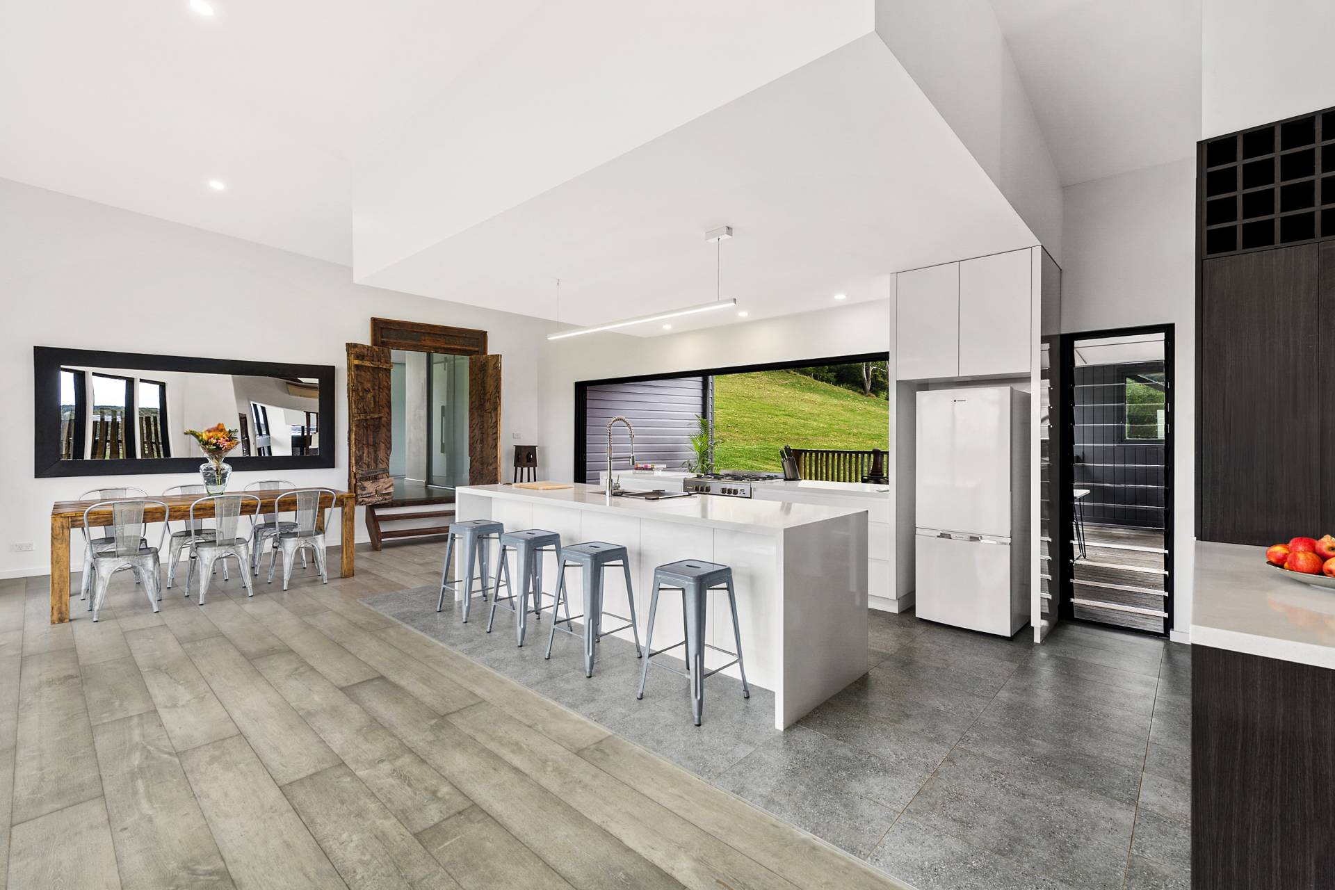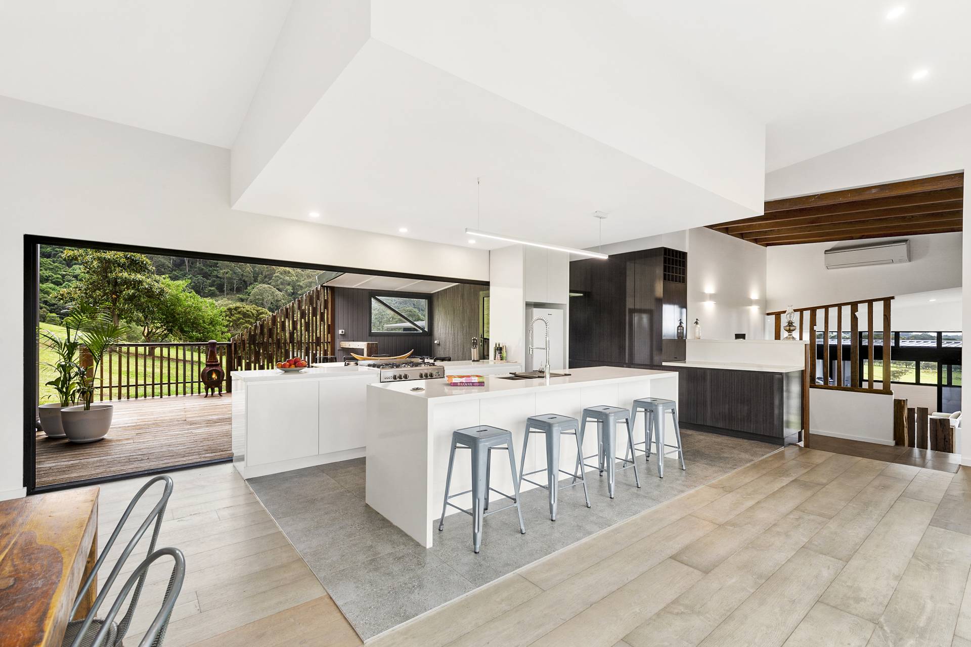 Step through the striking, intricately carved double front doors into a spacious entrance foyer. To the left, you'll find the kitchen and dining area leading to the principal bedroom suite; to the right of the foyer, a half flight of stairs leads down to the living room, featuring a free-standing wood-burning fireplace, and beyond, the glazed doors of the home office/rumpus room. A light-filled hallway with raked ceiling and clerestory windows leads from the living room to four bedrooms, a main bathroom, and a combination kitchenette/laundry. The home is thoughtfully designed to allow for views from each room, as well as the option to partition off three guest rooms, the bathroom and the kitchenette/laundry to make a separate granny flat or guest accommodation wing with its own entrance—perfect for multi-generational living or as an income-generating rental.