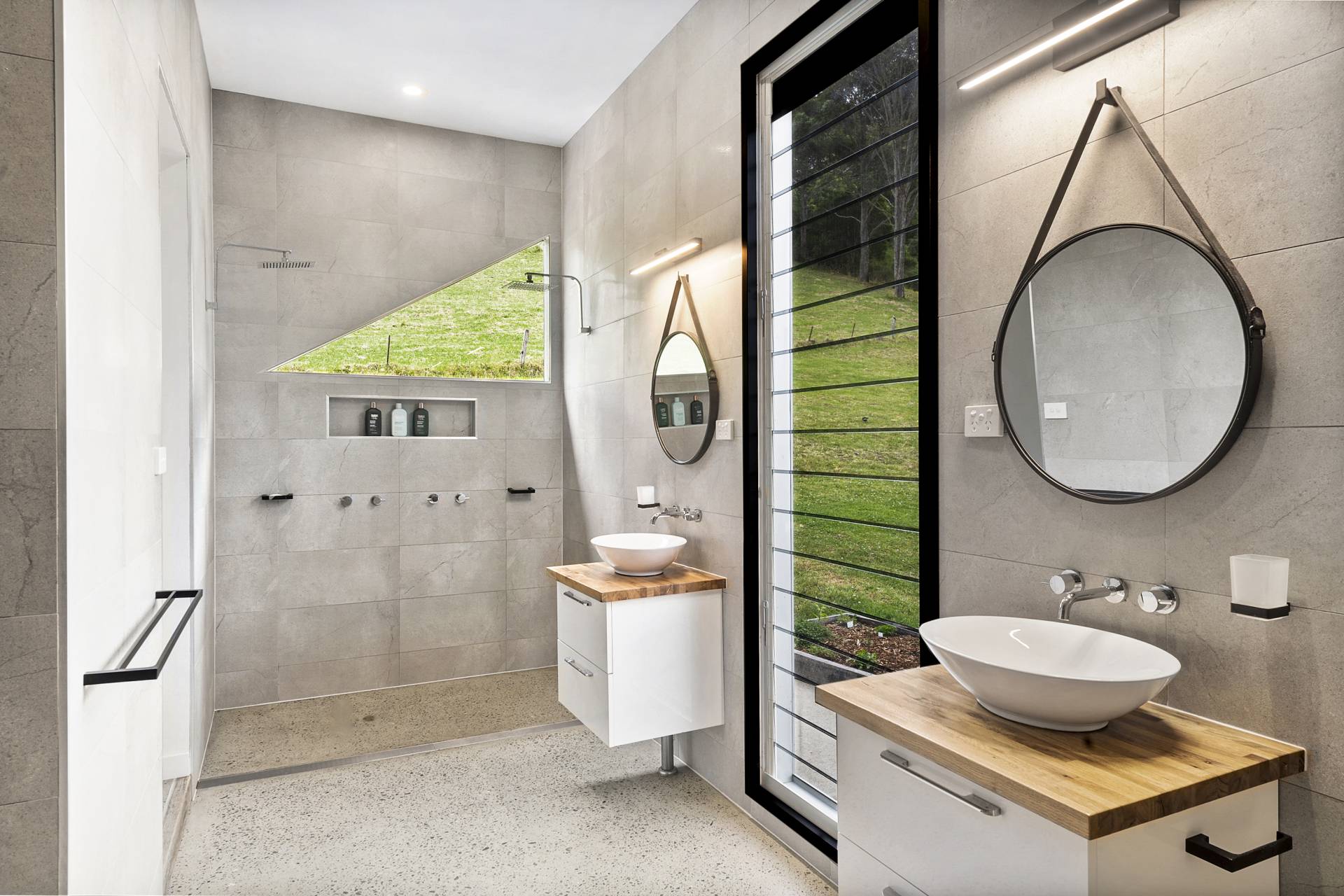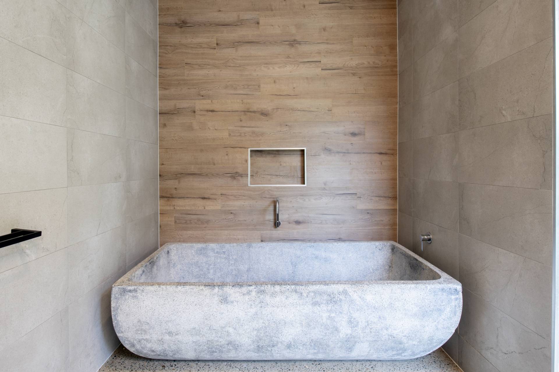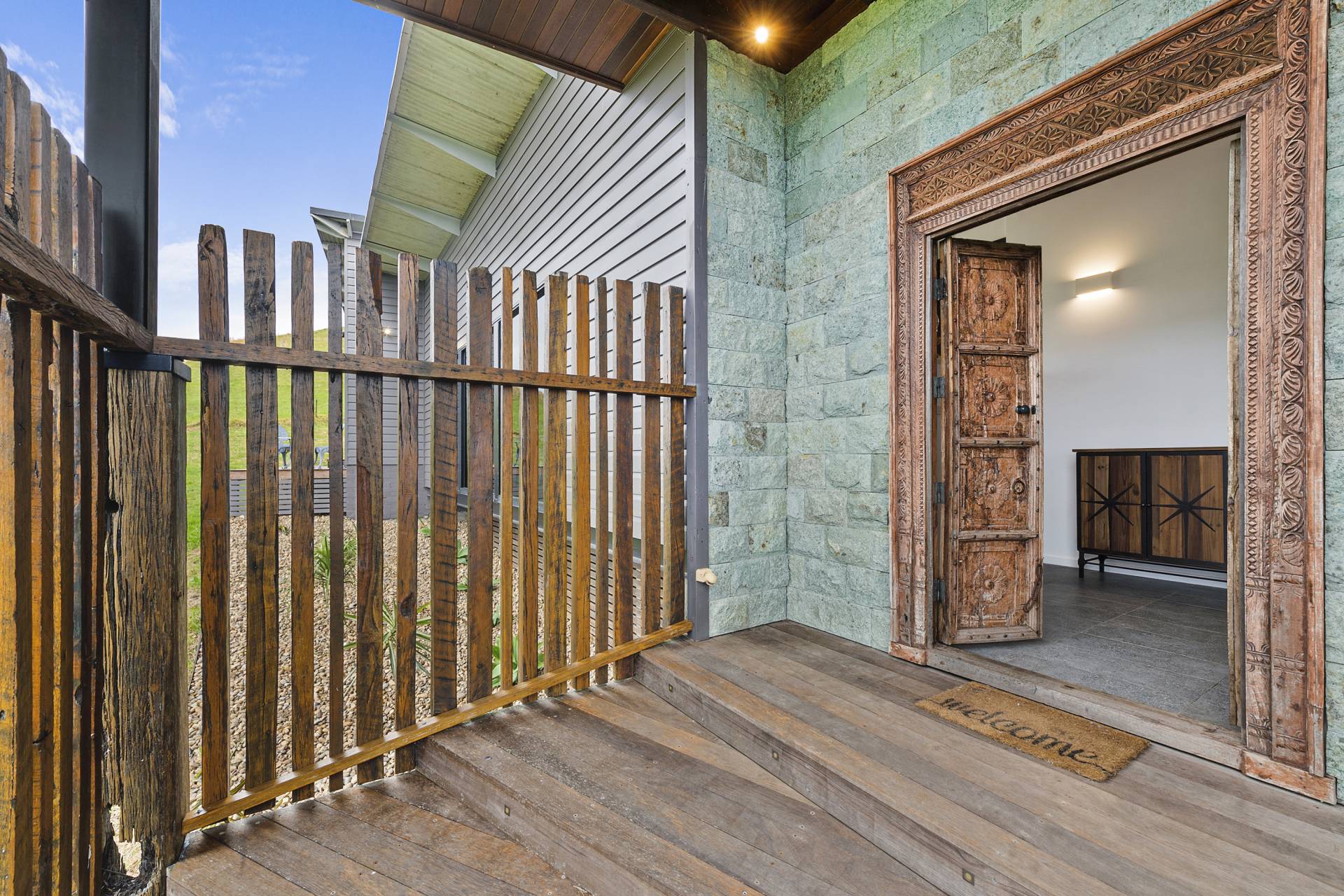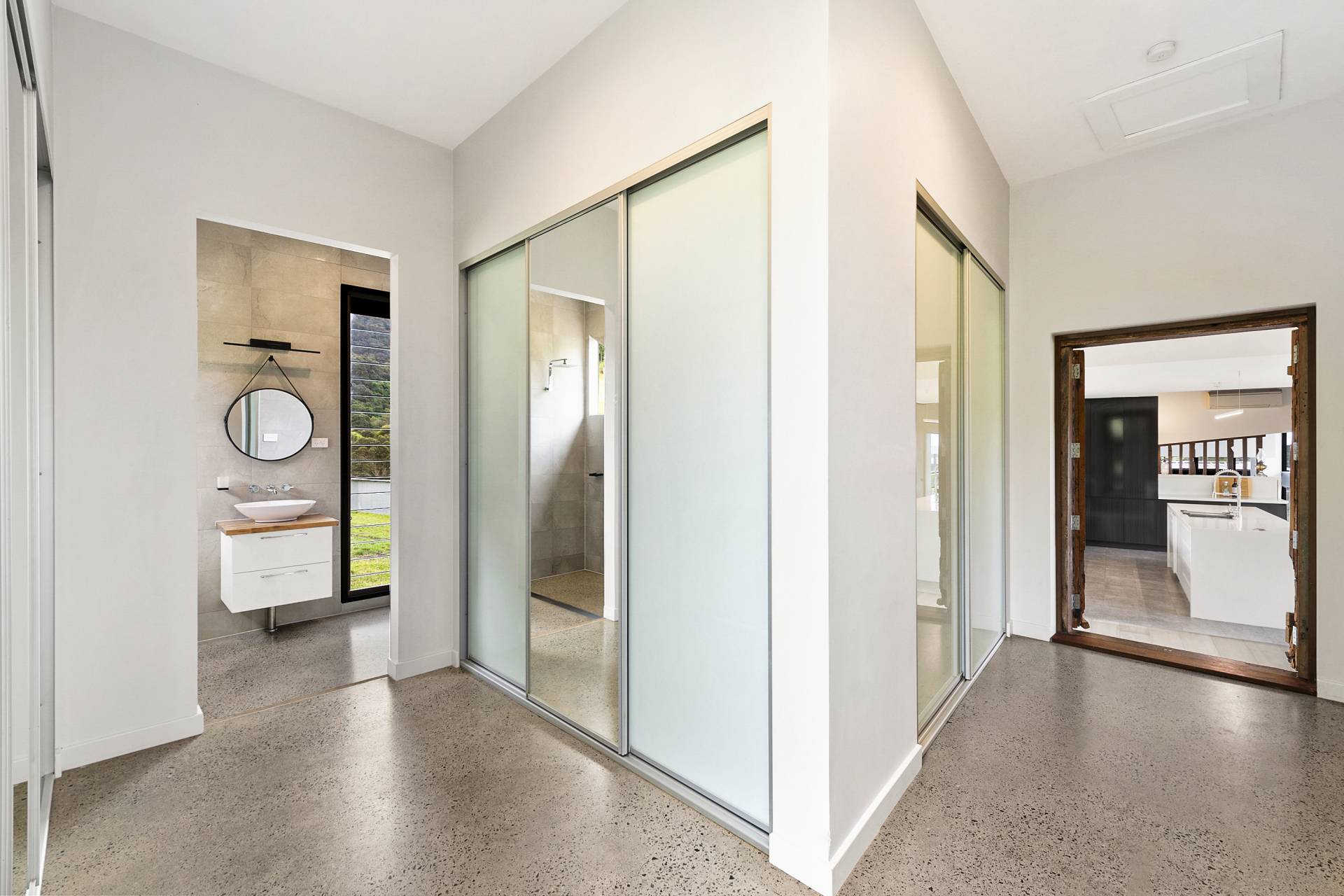 At the opposite end of the home, well away from the other bedrooms and accessed through another set of carved feature doors, is the principal bedroom suite. This luxurious retreat includes a large bedroom with an expanse of glass opening onto a private deck, a generously-sized dressing room with bespoke cabinetry, and an en suite with a walk-in two-person shower, a free-standing bespoke concrete bath, and stunning views – all creating a spa-like ambiance.