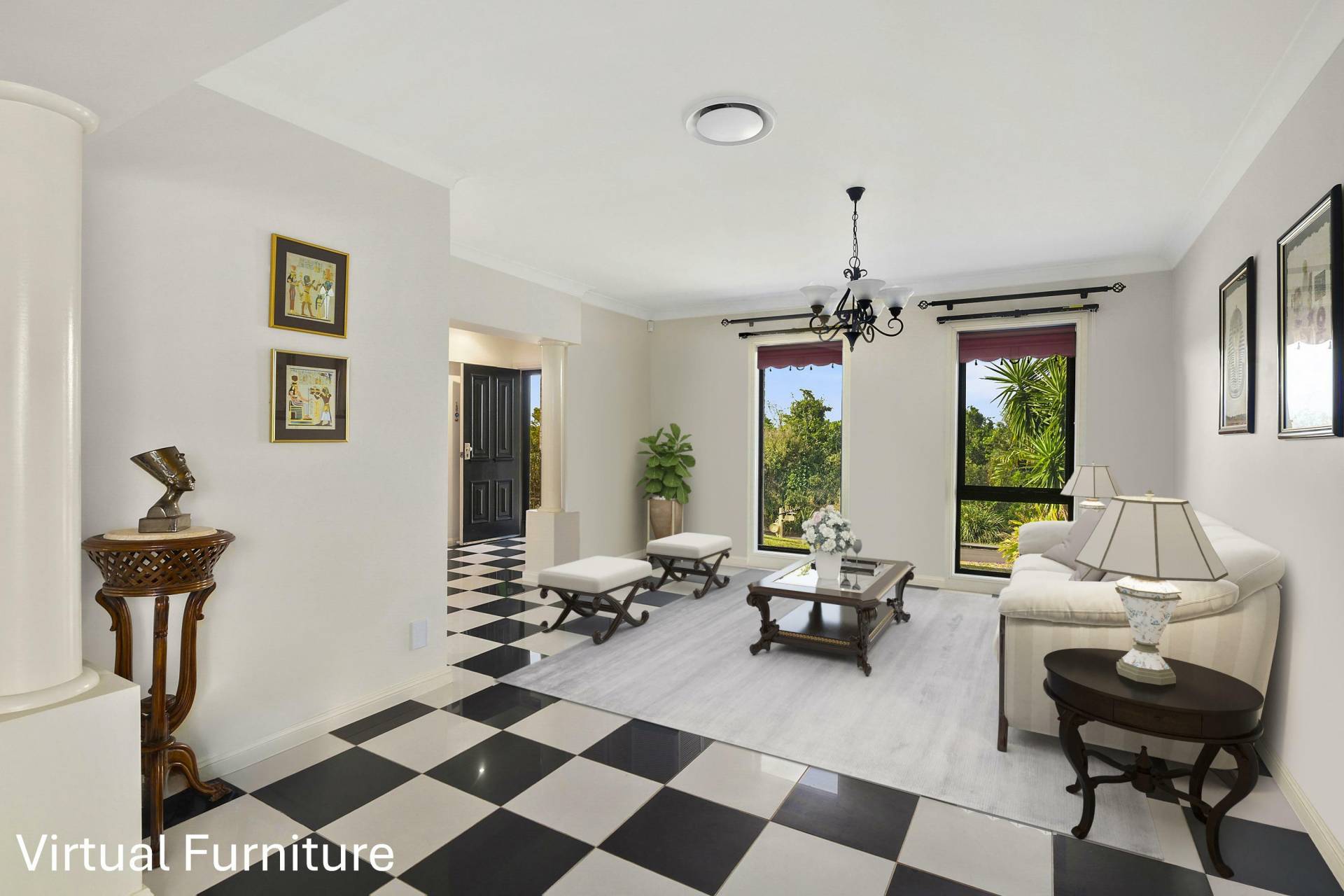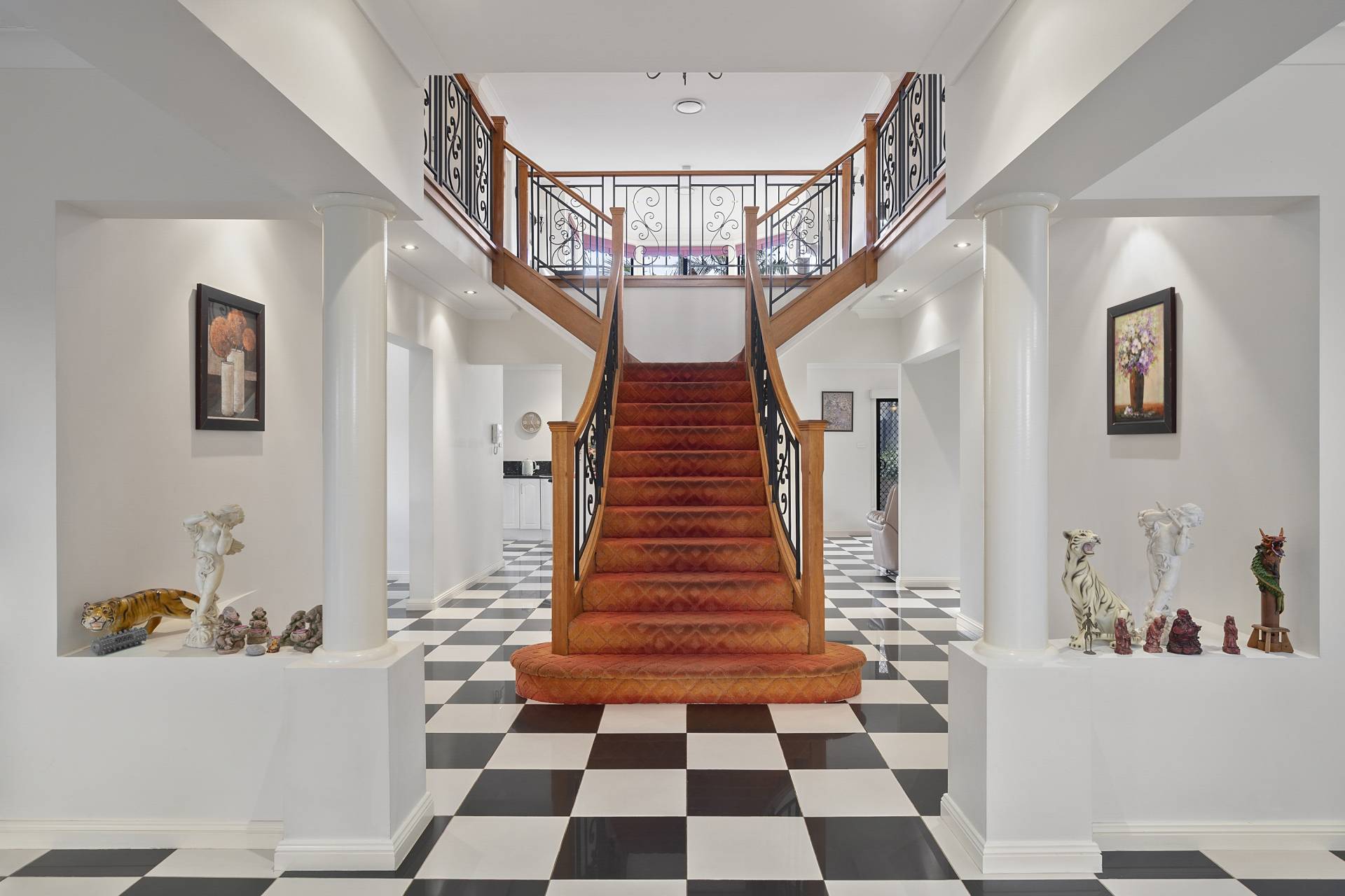 Stepping into this impressive two-storey residence, arrivals are greeted by an entrance hall that sets an elegant tone with its statement bifurcated staircase rising dramatically through a central double-height foyer, perfectly complemented by striking black and white granite chequerboard flooring, a feature throughout the ground floor that immediately captures the attention and speaks of a bold, timeless design.