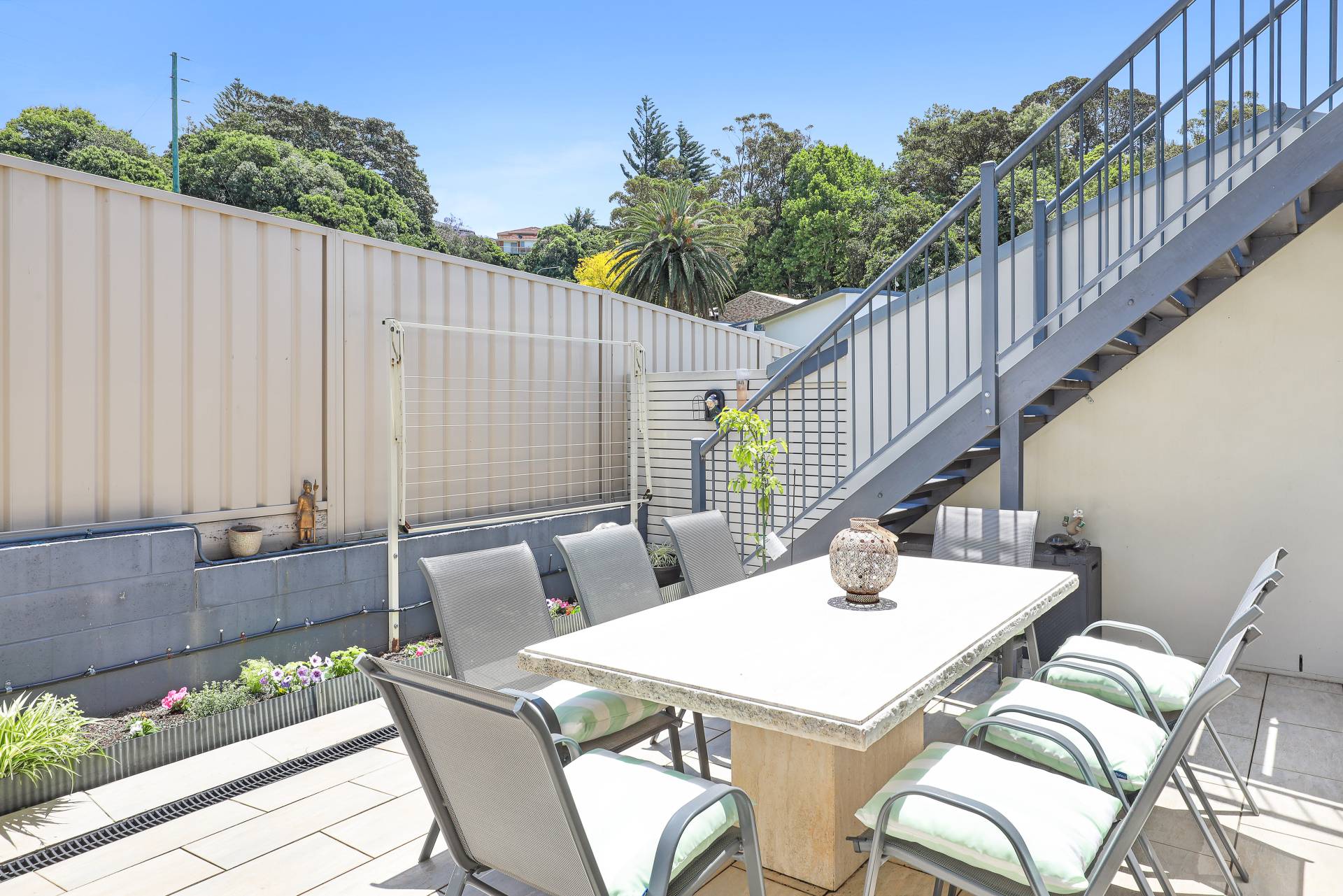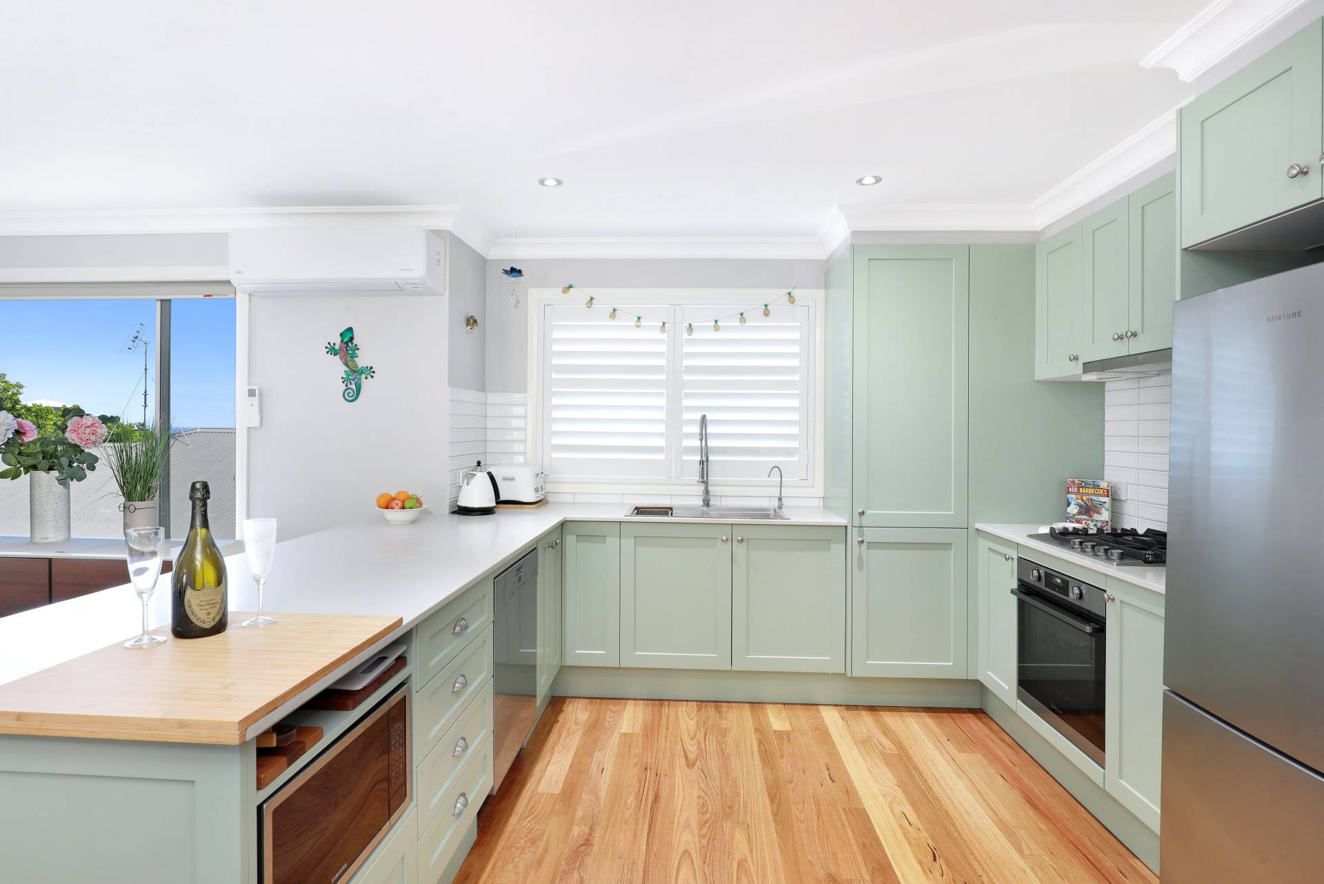 Step inside to discover a spacious open-plan layout that seamlessly integrates indoor and outdoor living. A stylishly remodelled and generously-sized kitchen featuring sleek stone benchtops and top-of-the-line appliances opens into the dining and living room areas, creating a large, airy space for day-to-day living and entertaining with ease. Both living and dining spaces open onto highly functional outdoor spaces – on one side, a patio boasting flowerbeds and retractable sun awning, while off the dining room is a well-sized deck offering views to the coastline and ocean beyond. Also on this level are a guest bedroom with built-in wardrobe and combination laundry/powder room.  Satiny smooth and warm hardwood floors throughout the public spaces on this level are complemented by new carpet in the bedroom and on the staircase.