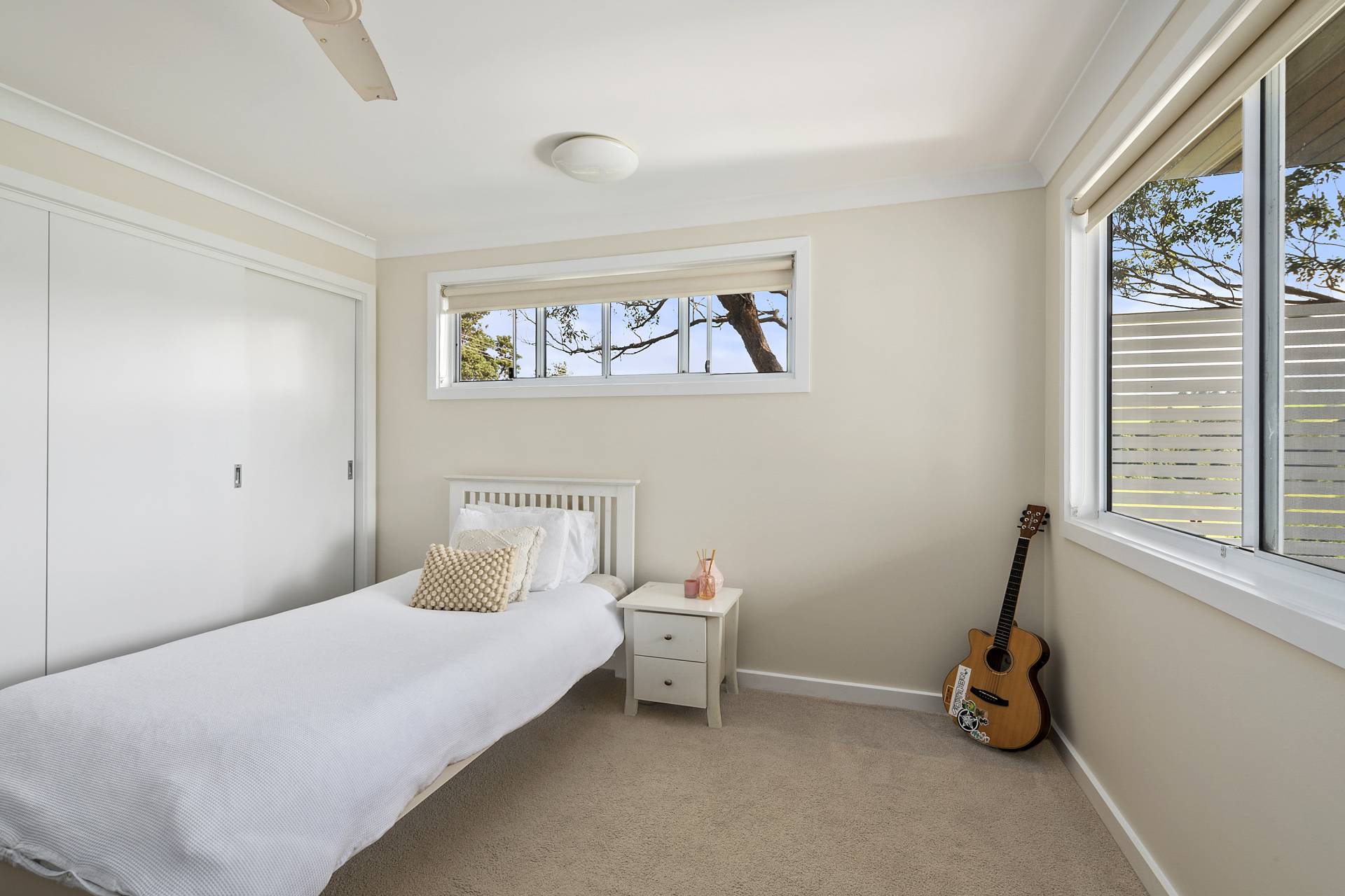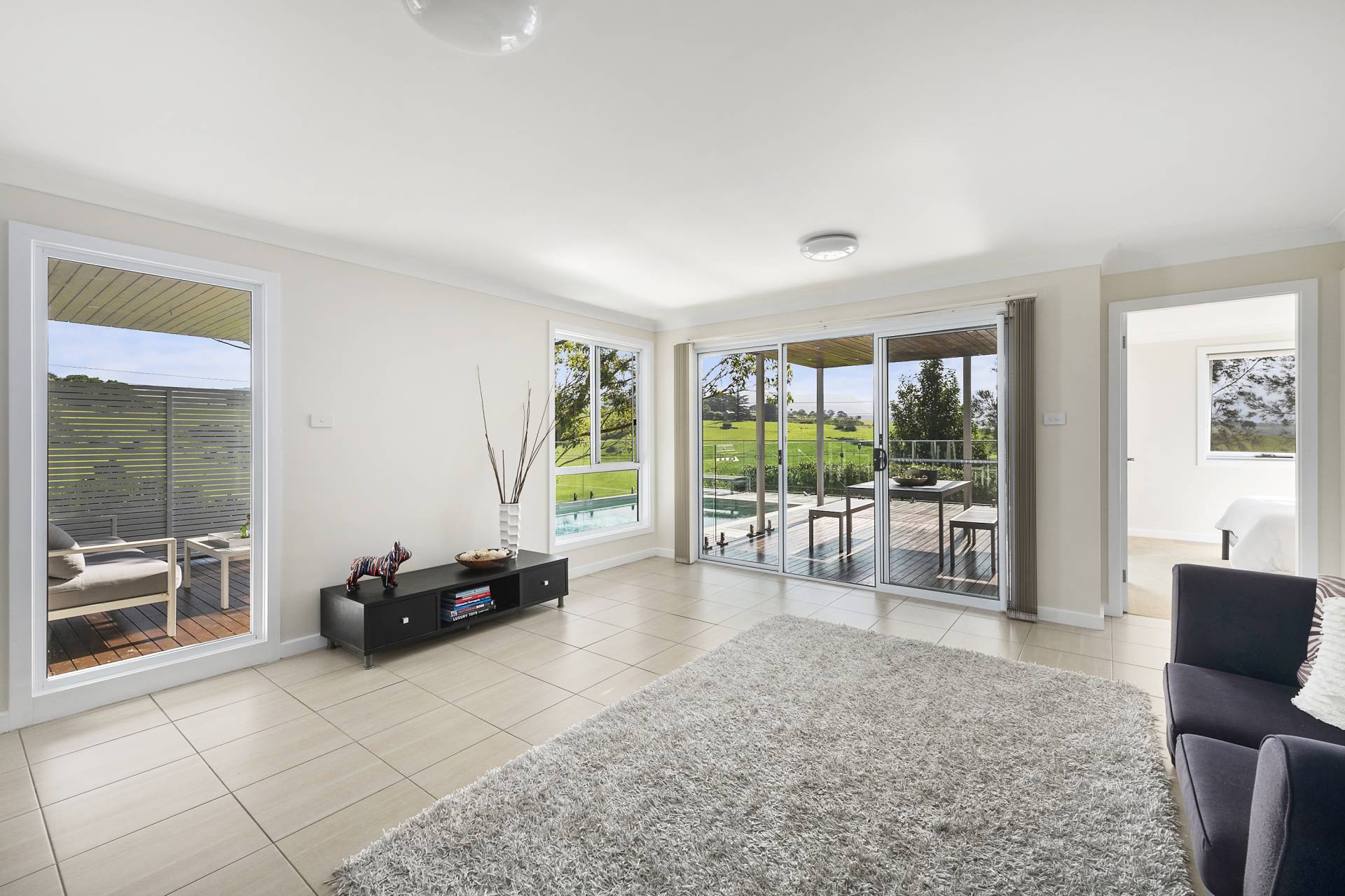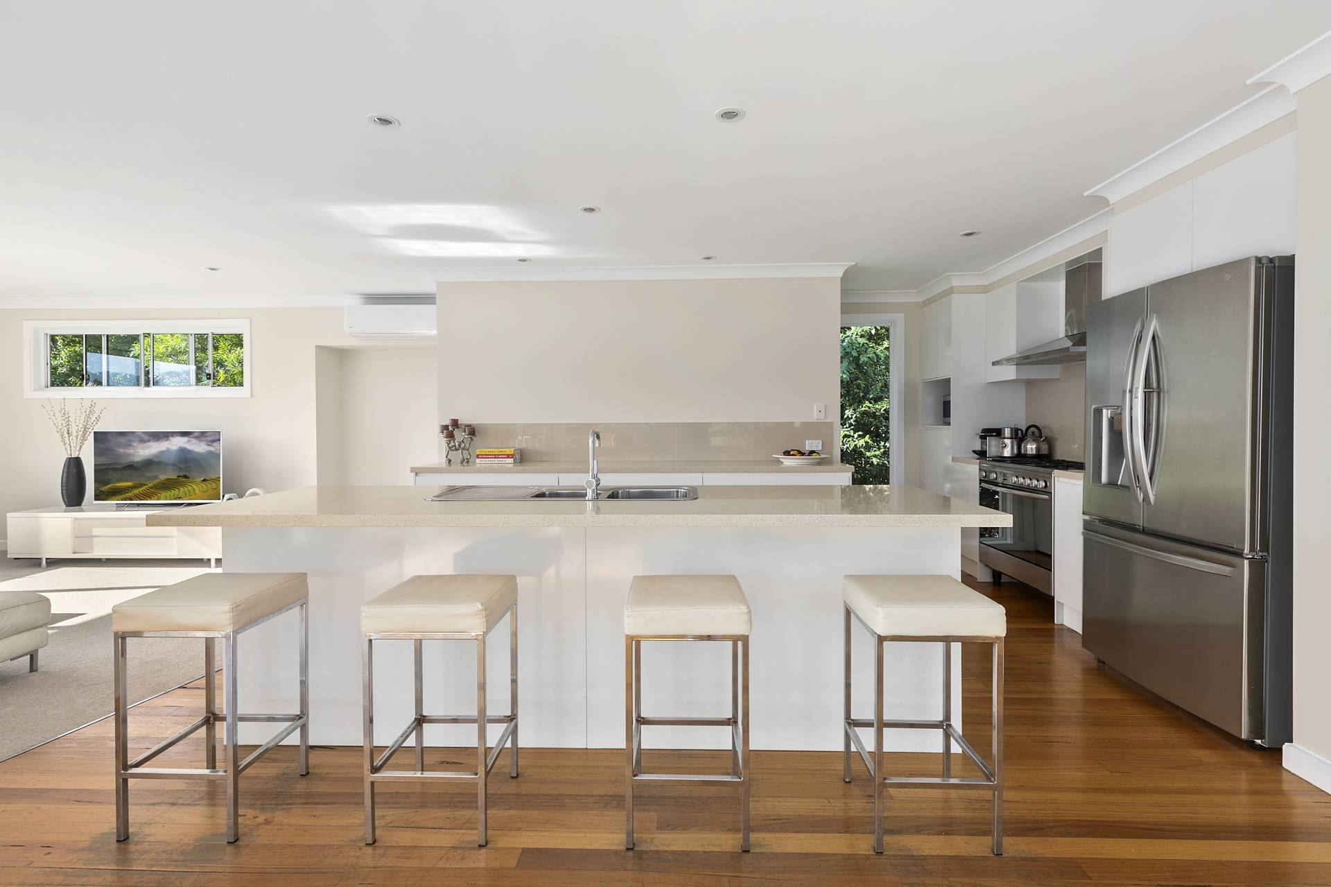 On the upper/entrance level, an open plan living, dining and kitchen area forms the centrepiece of the home. The kitchen, with its sleek stainless-steel appliances including a free-standing oven and range, comes with a walk-in pantry and eat-at island bench, making it ideal for any cooking enthusiast. Enjoy the stunning views of the Jamberoo Valley and the escarpment from the living areas and two balconies, one of which is undercover for enjoyment in all weather.