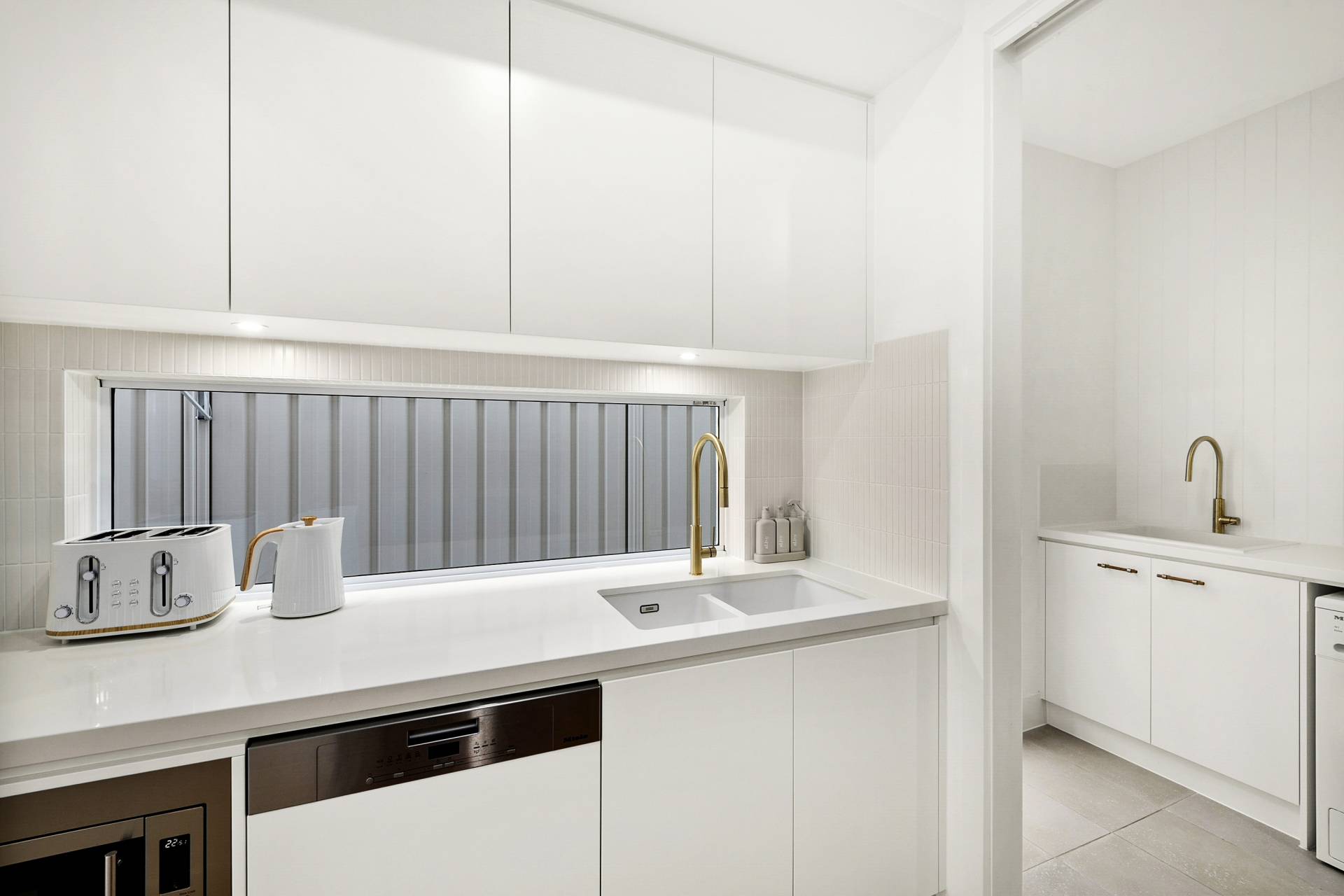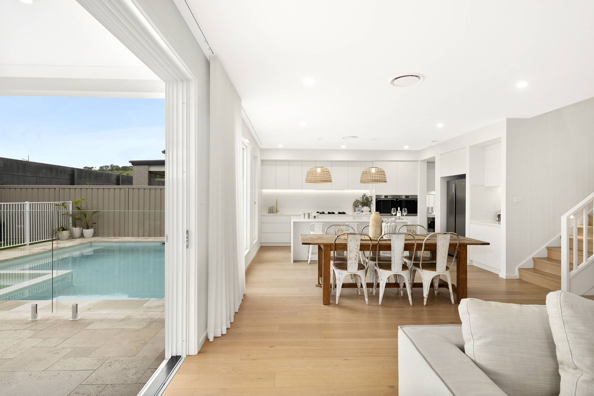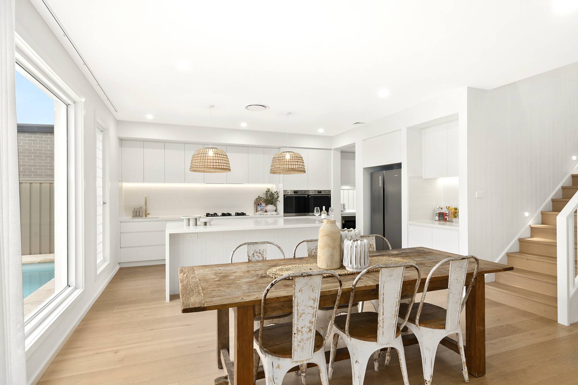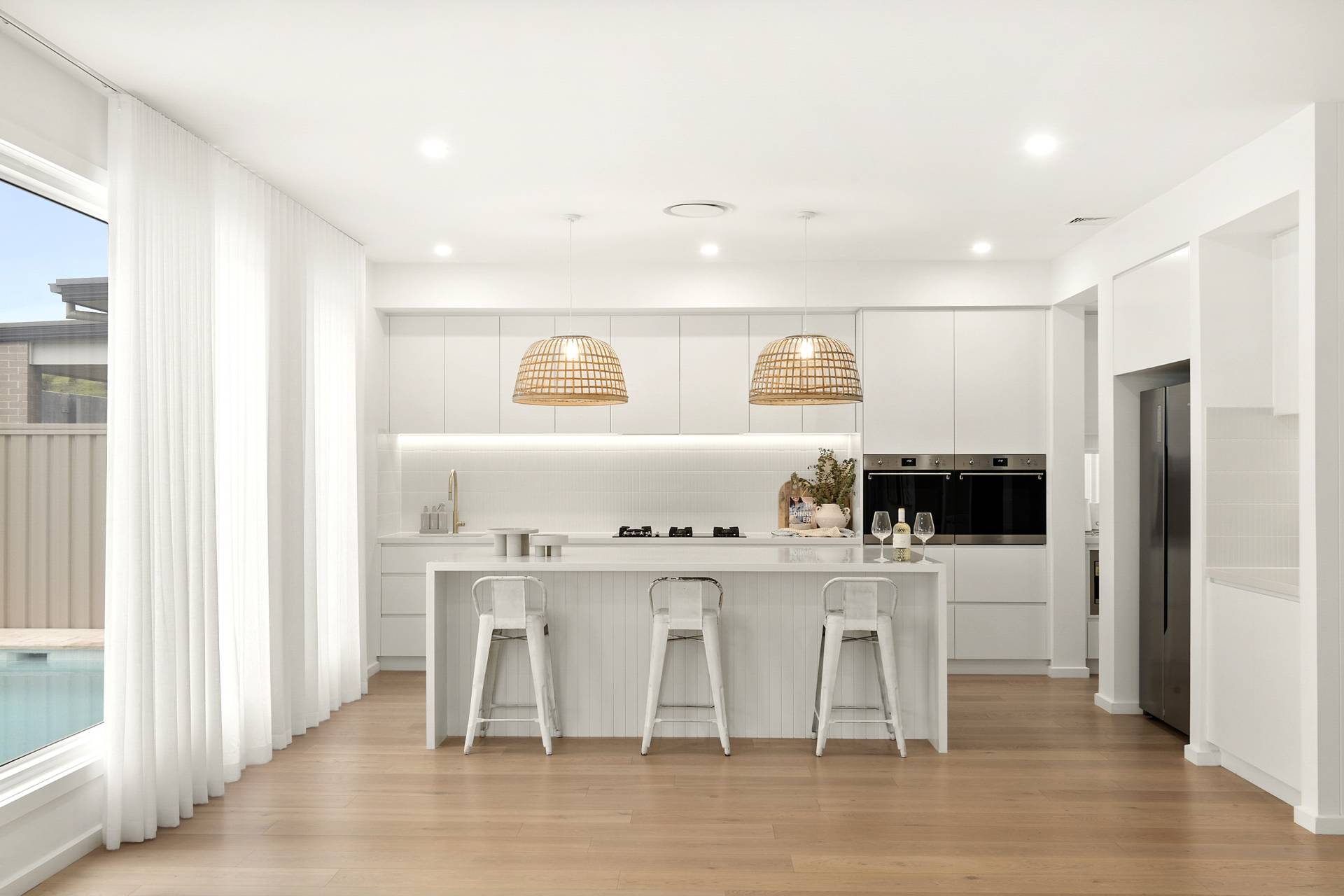 The heart of the home is the expansive open-plan living, dining and kitchen. Here, walls of glazing flood the space with natural light, while the neutral colour palette in décor, fixtures and finishes amplify the relaxed coastal vibe. The kitchen features sleek stainless-steel Smeg appliances, an expansive eat-at island complemented by ample cabinetry and an impressive walk-in pantry to keep everything organised and out of sight.
