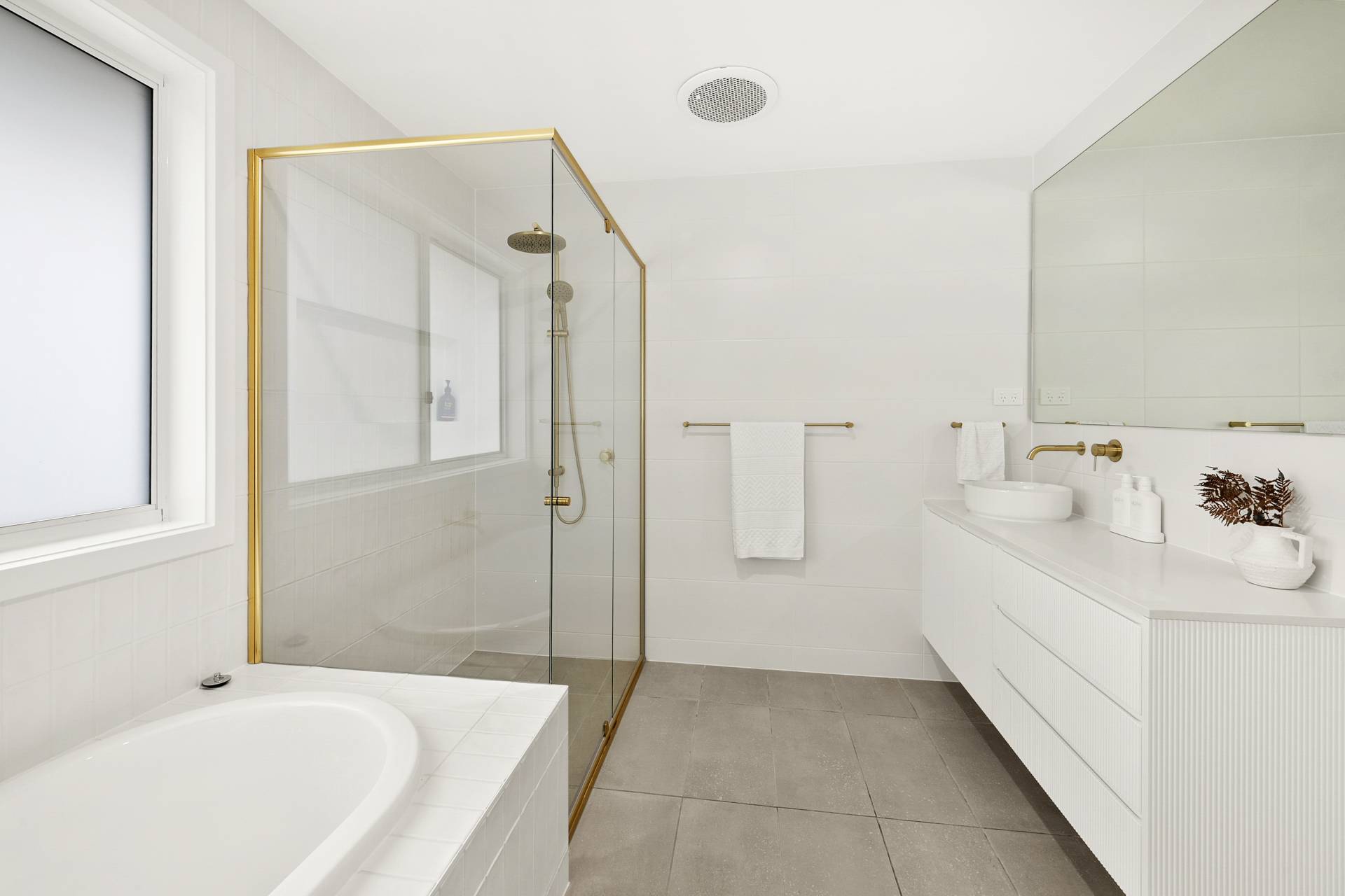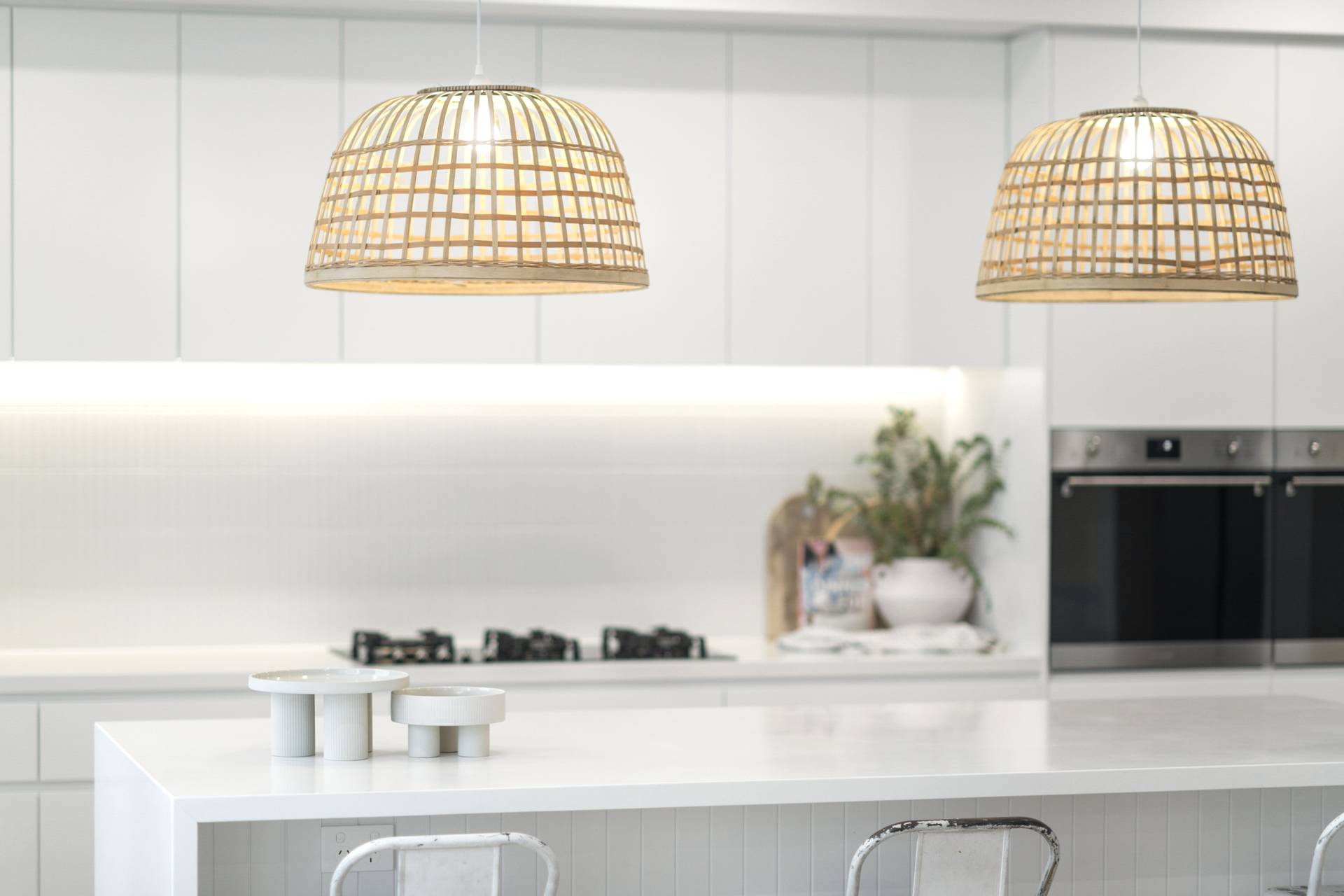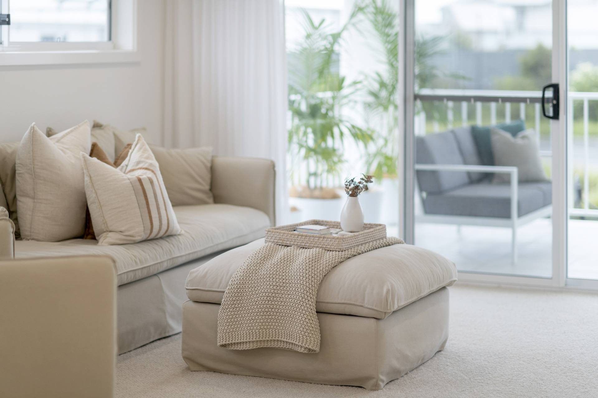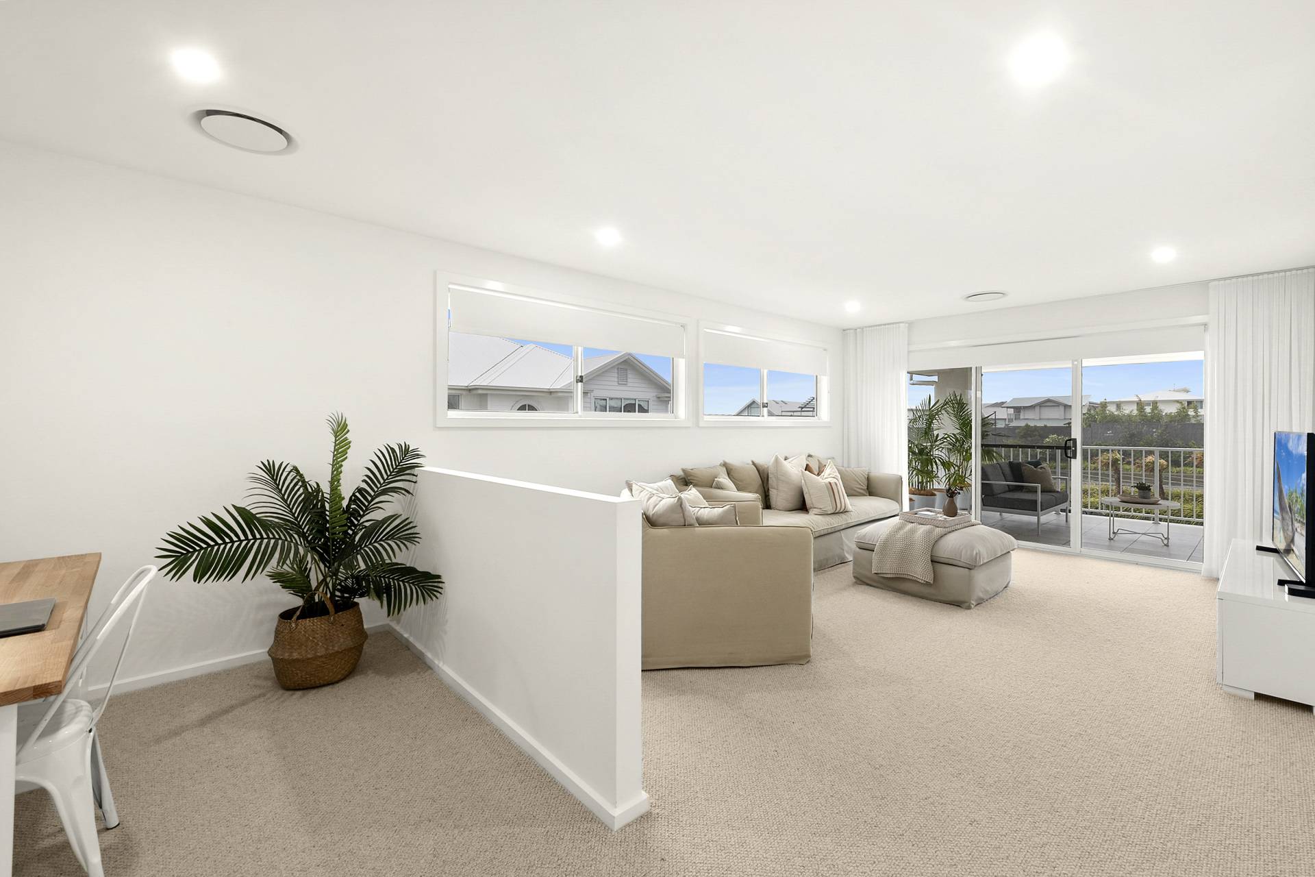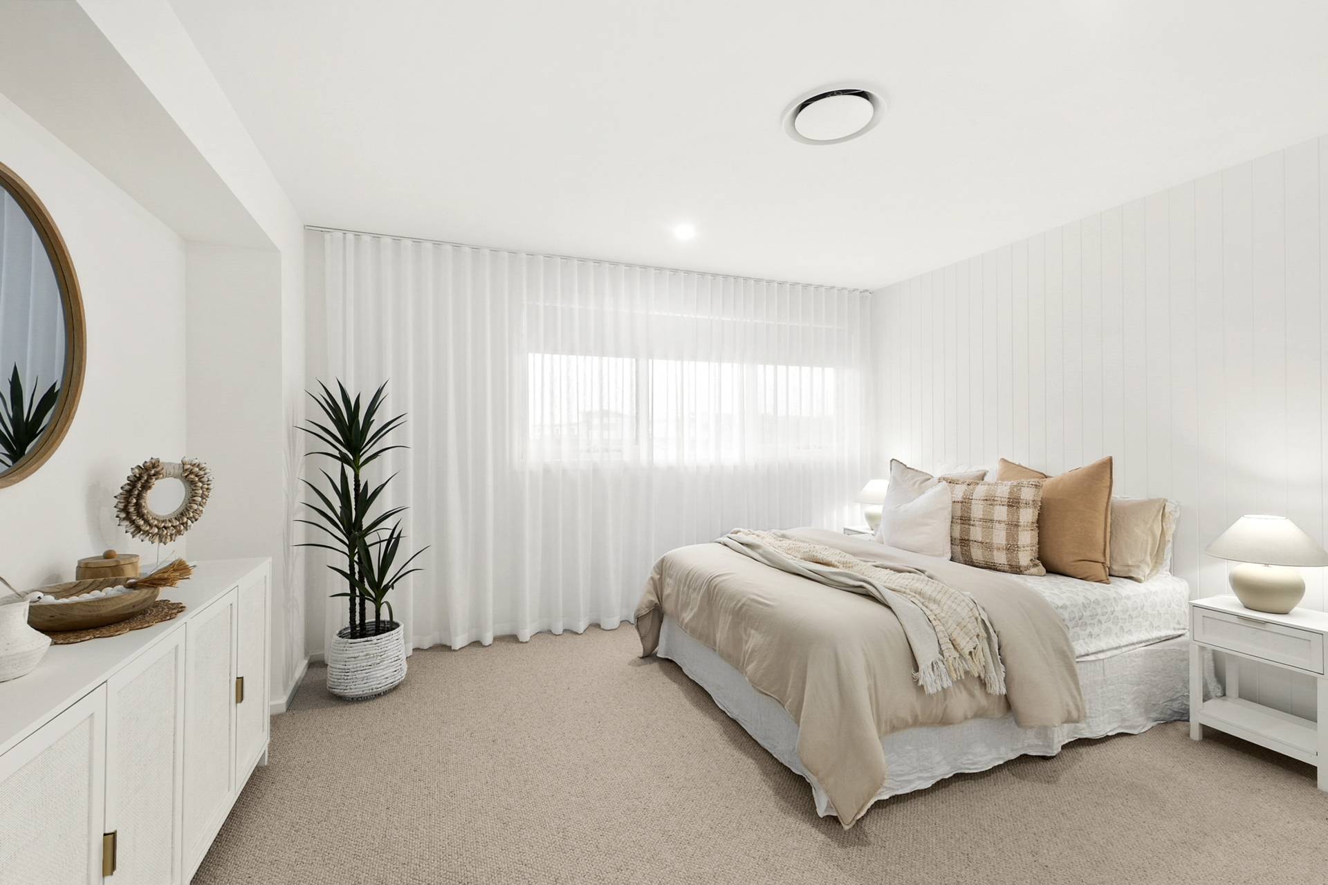 The heart of the home is the expansive open-plan living, dining and kitchen. Here, walls of glazing flood the space with natural light, while the neutral colour palette in décor, fixtures and finishes amplify the relaxed coastal vibe. The kitchen features sleek stainless-steel Smeg appliances, an expansive eat-at island complemented by ample cabinetry and an impressive walk-in pantry to keep everything organised and out of sight.
