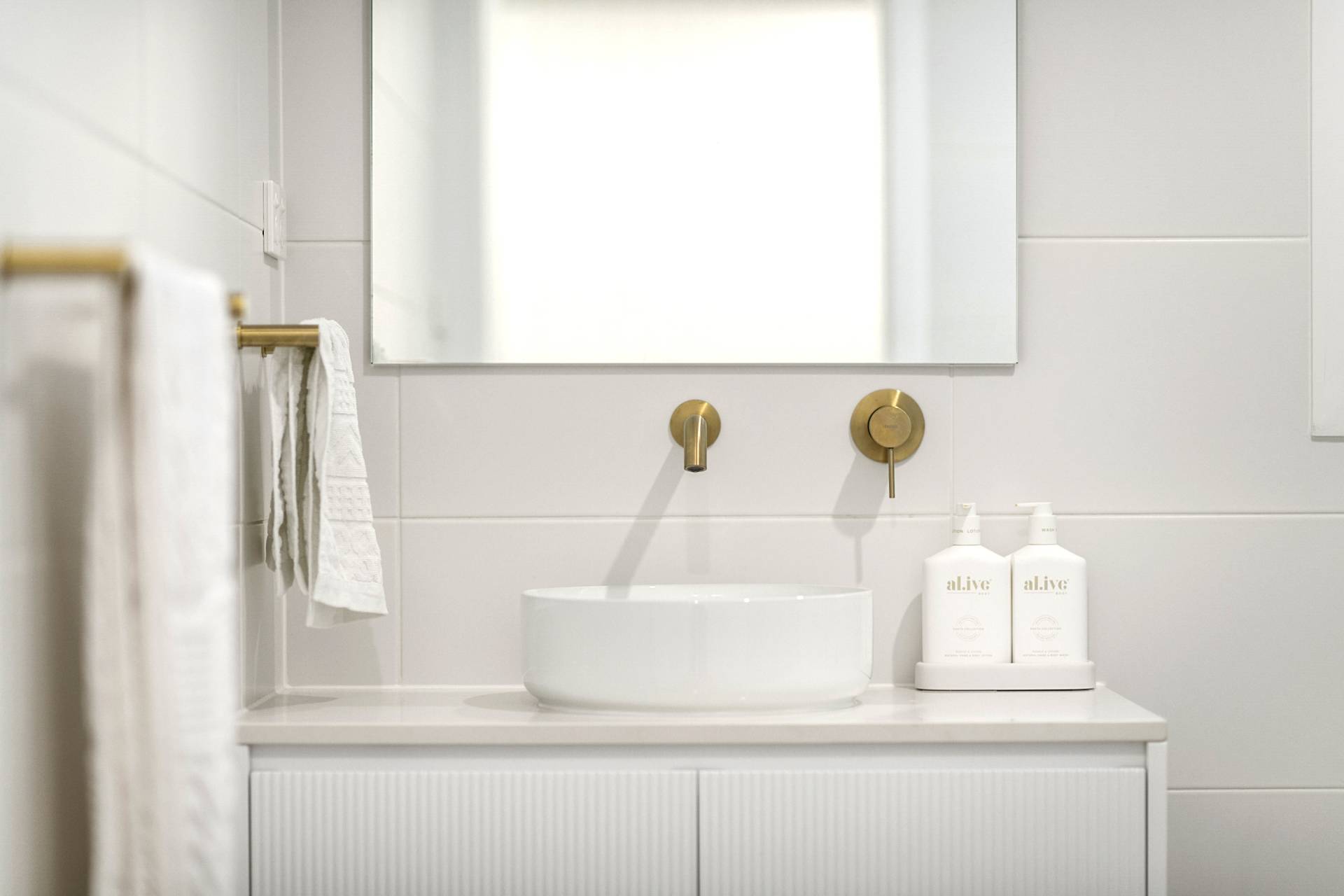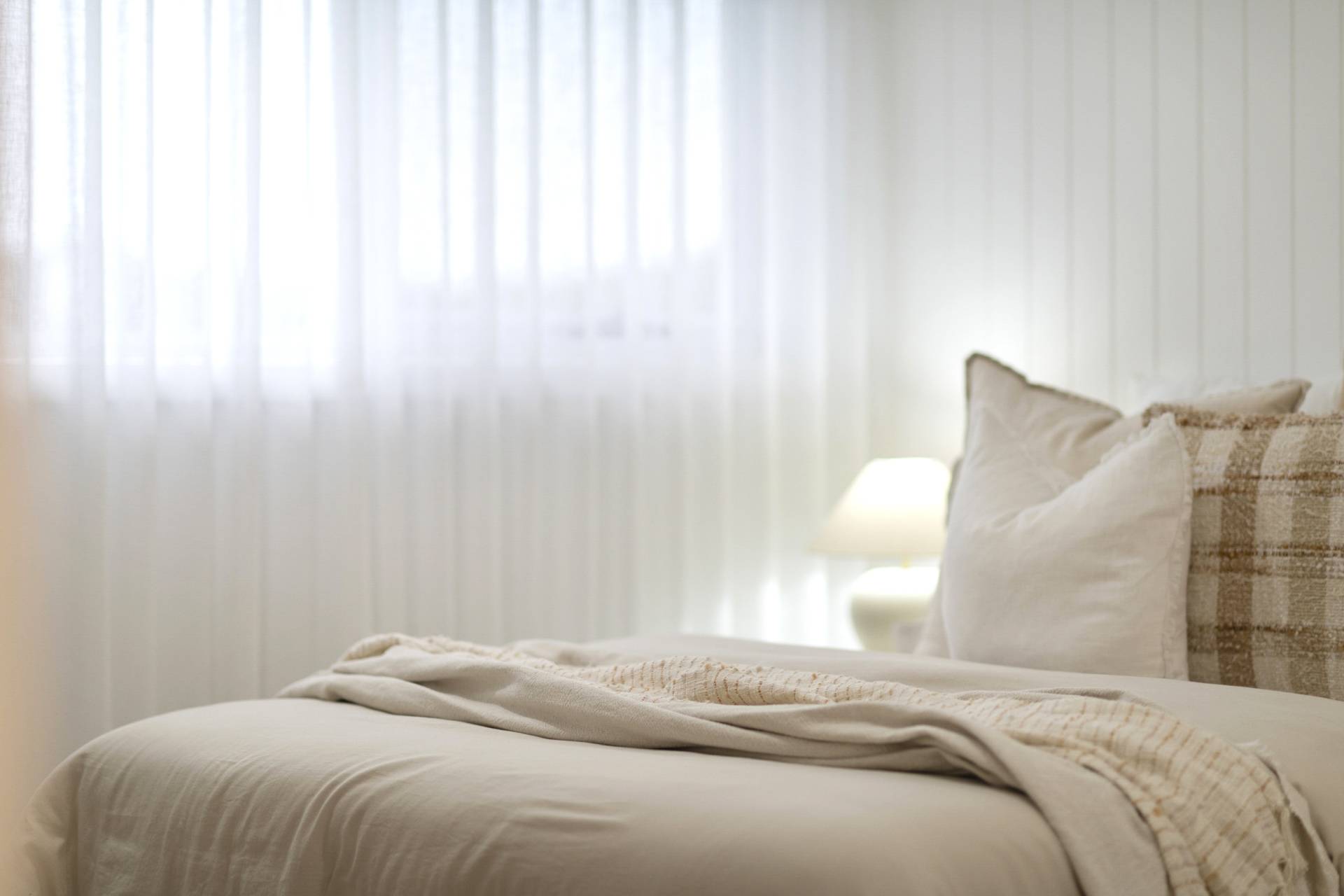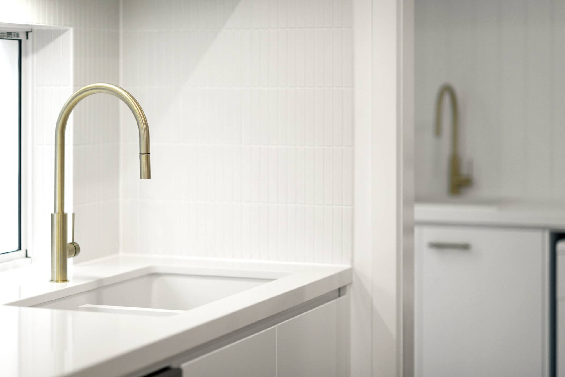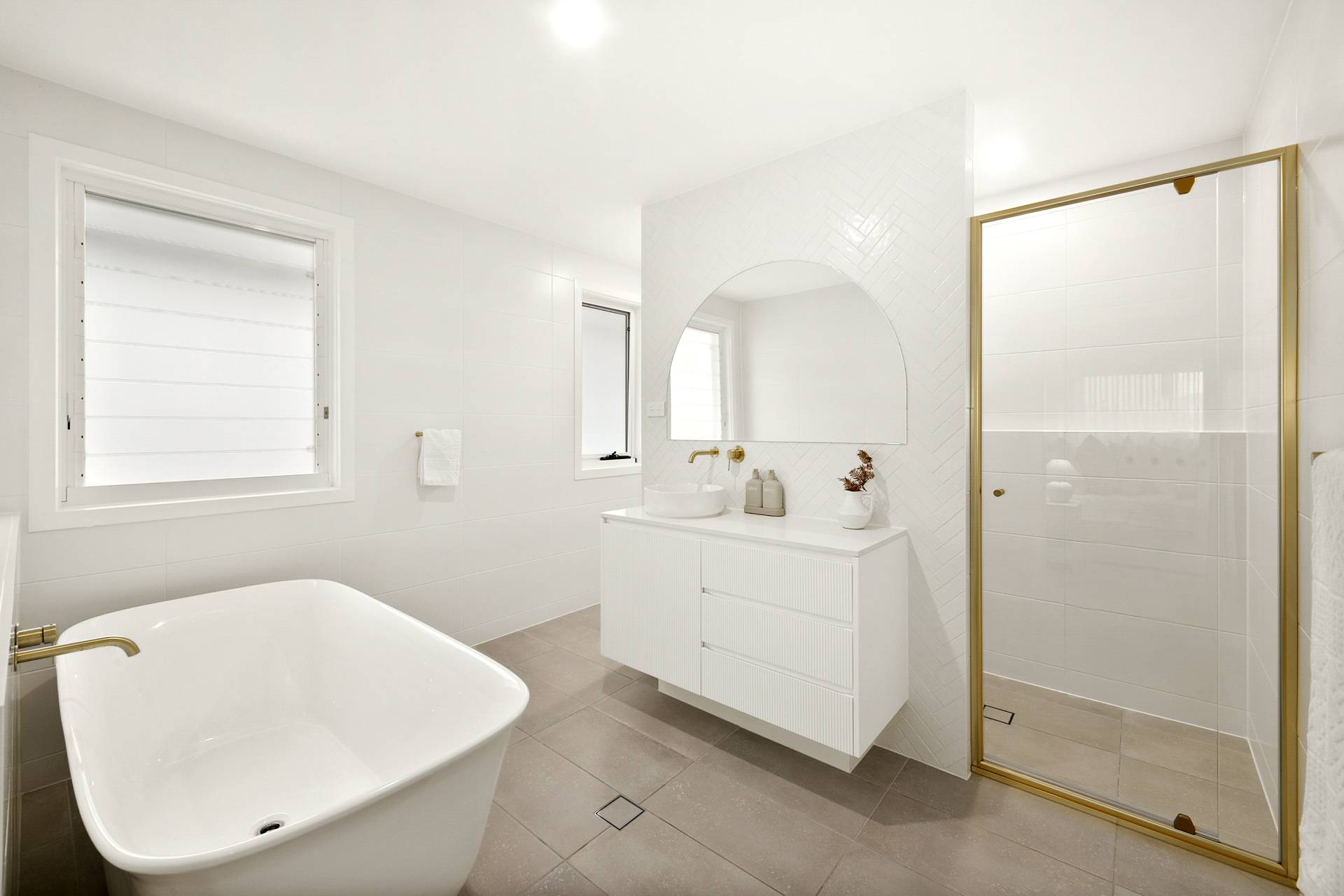 The heart of the home is the expansive open-plan living, dining and kitchen. Here, walls of glazing flood the space with natural light, while the neutral colour palette in décor, fixtures and finishes amplify the relaxed coastal vibe. The kitchen features sleek stainless-steel Smeg appliances, an expansive eat-at island complemented by ample cabinetry and an impressive walk-in pantry to keep everything organised and out of sight.