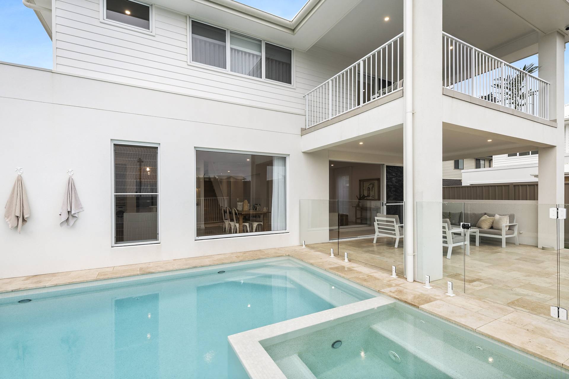 Step outside to the travertine marble-tiled terrace, the perfect alfresco space for entertaining, enjoying the coastal breeze and admiring your inground swimming pool and jacuzzi. The fully fenced backyard offers safety for children and pets, while the grey water reuse system reflects a commitment to sustainability.