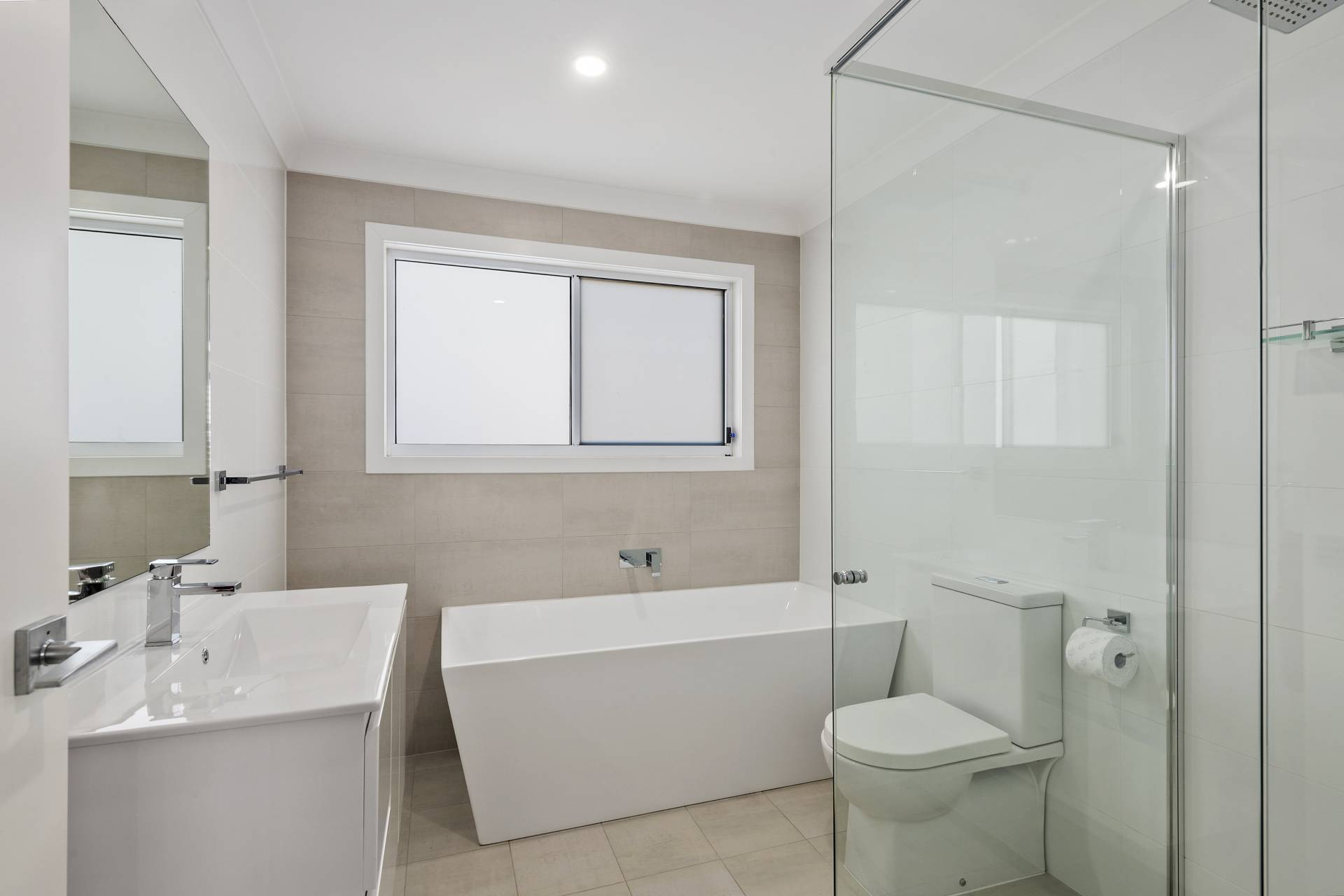 • Freestanding bath and separate shower with oversized shower head in main bathroom