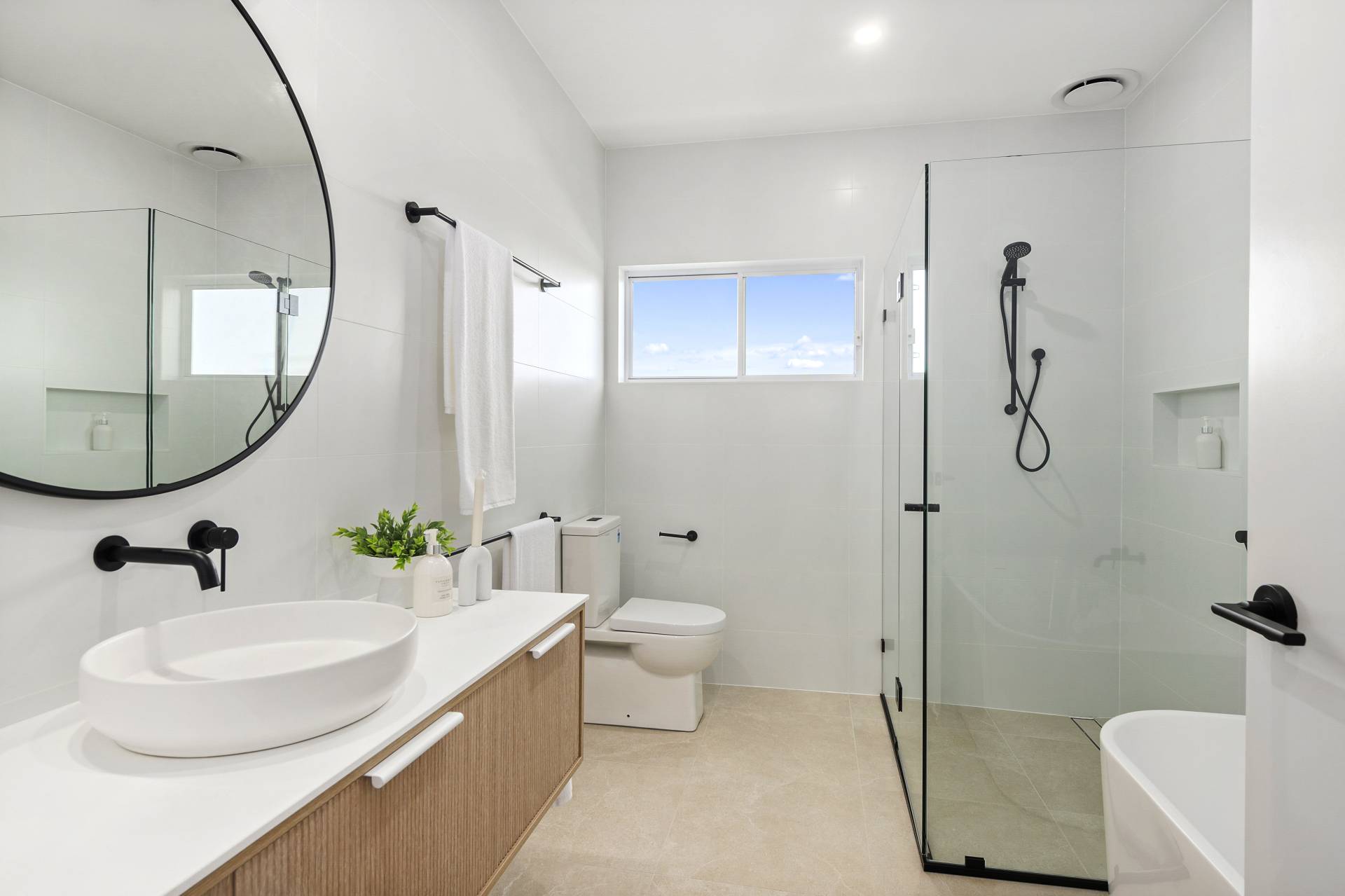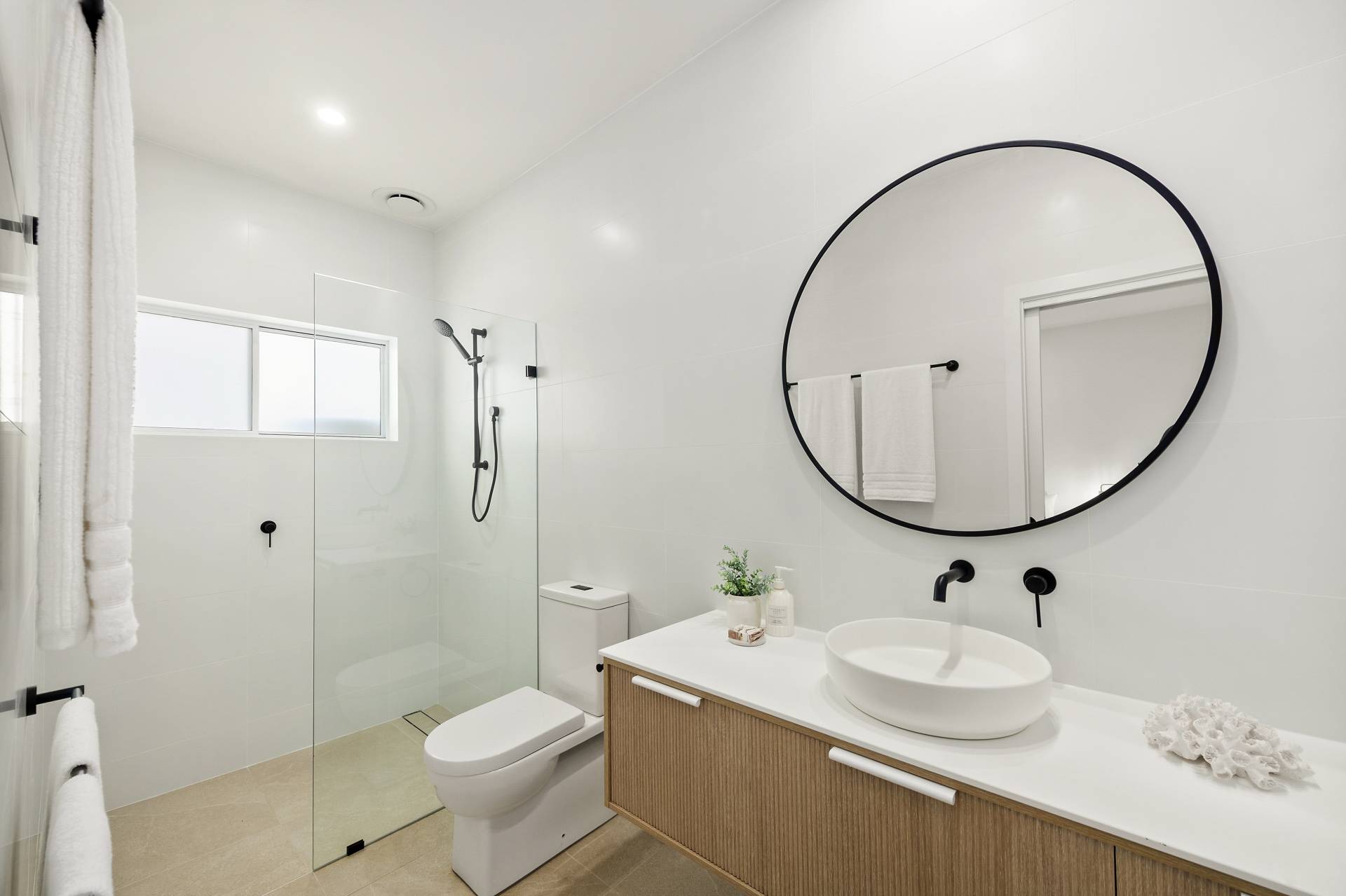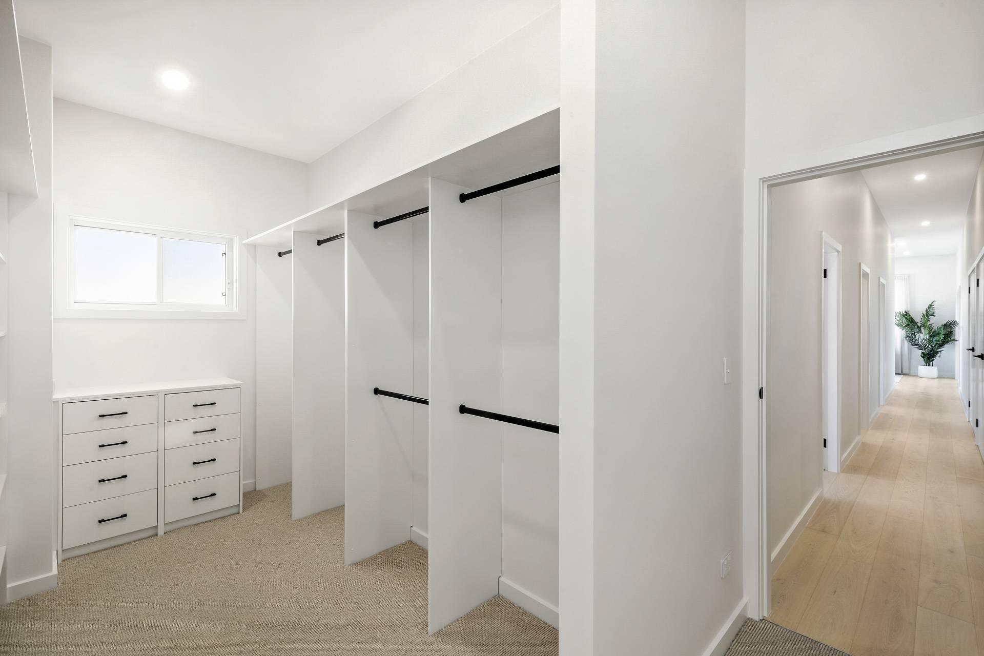 Upstairs, a second family living area opens onto a covered balcony, making for an ideal media room or kids’ retreat. Two double bedrooms each include expansive built-in wardrobes while a stylish main bathroom features fully tiled walls, sleek fixtures and a walk-in shower of frameless glass. The principal suite, designed for maximum privacy and situated to take every advantage of the ocean views, boasts not one but two generously-sized dressing rooms, each finished with bespoke cabinetry providing wardrobe and storage space that is as refined as it is extensive. The stunning ensuite features a dual-sink vanity, walk-in shower and free-standing bathtub.